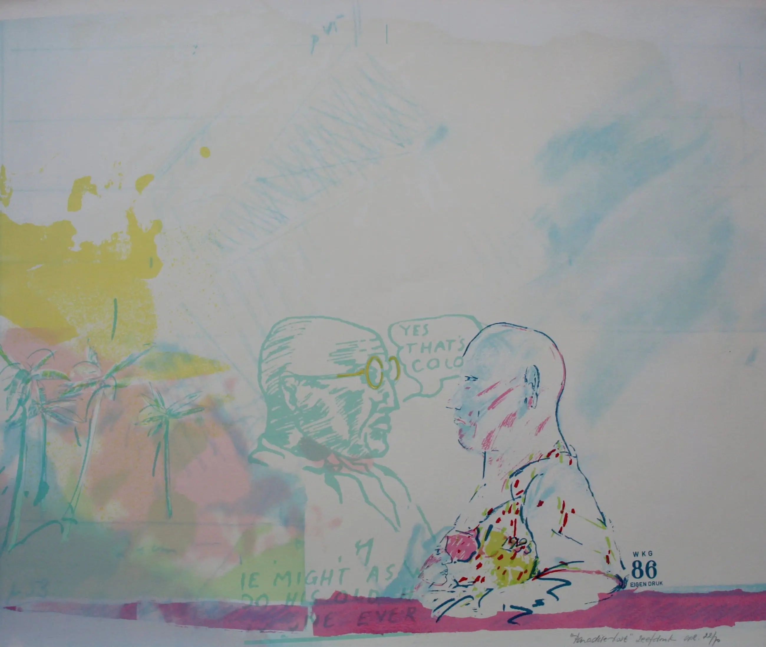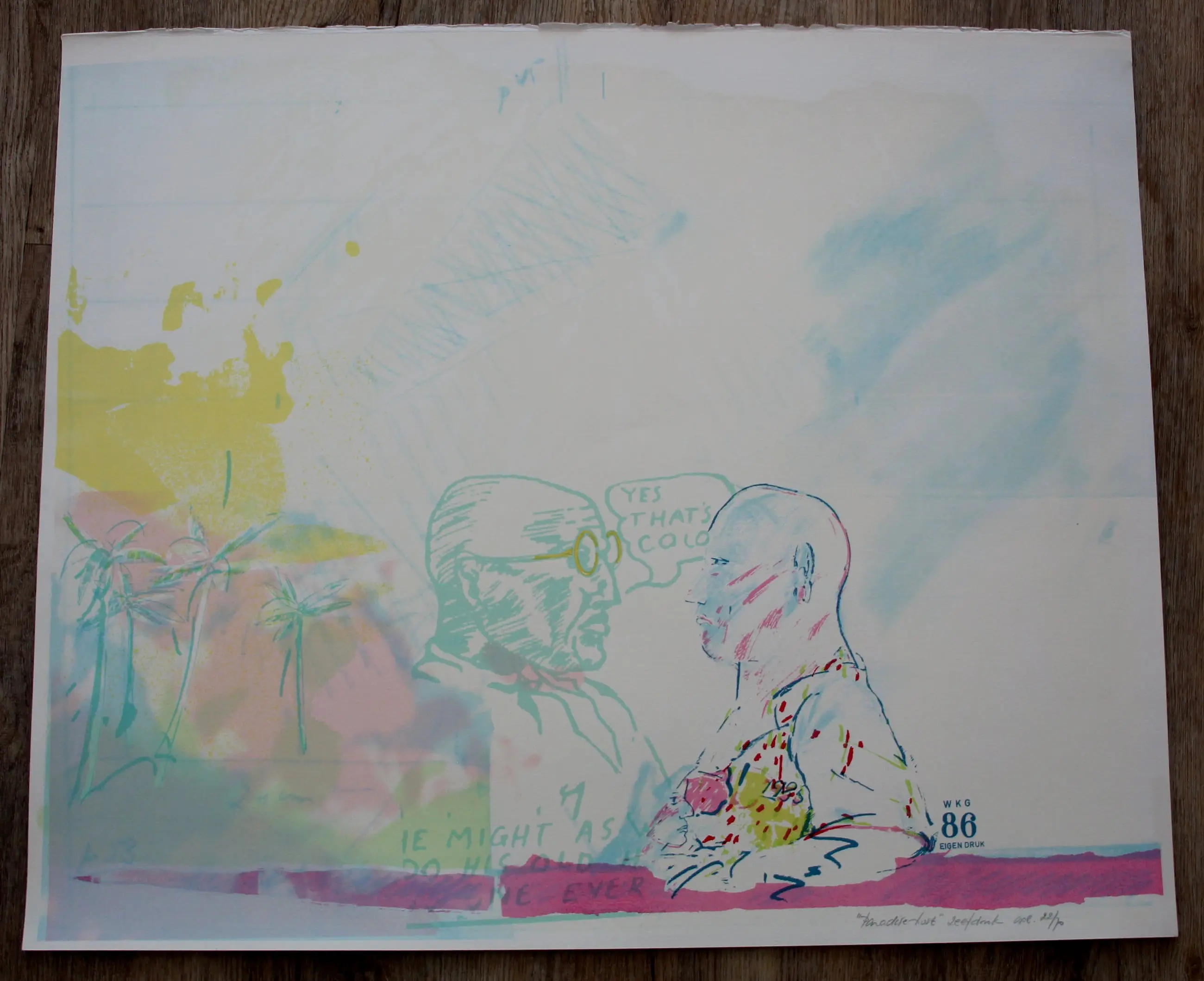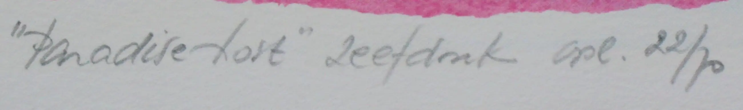 Kleurrijke zeefdruk van Klaas Gubbels uit 1986. Titel: Paradise Last. Oplage: 22/70. Het werk is op e achterzijde, met potlood, gesigneerd (maatschap Gubbels/kerkhof). Afmetingen blad: H61 x b73cm. Afmetingen voorstelling: H56 x b71cm. De authenticiteit van het, aangeboden, werk wordt volledig gegarandeerd. Een certificaat van echtheid kan, op aanvraag, worden gemaild.