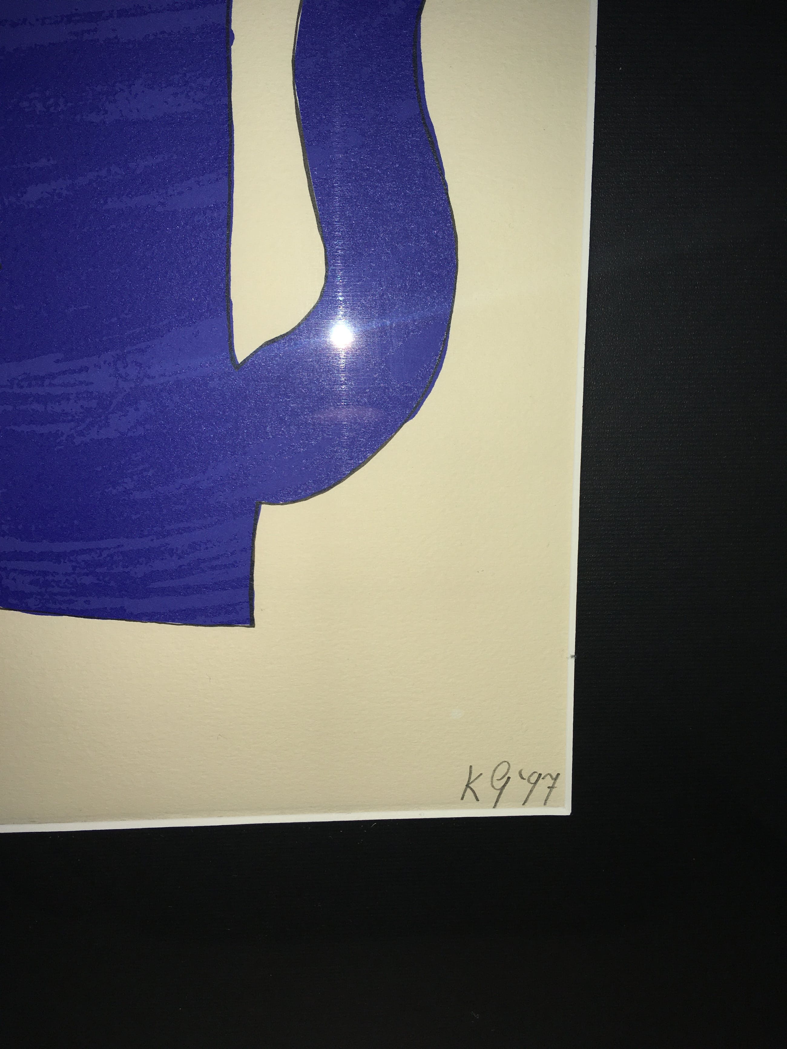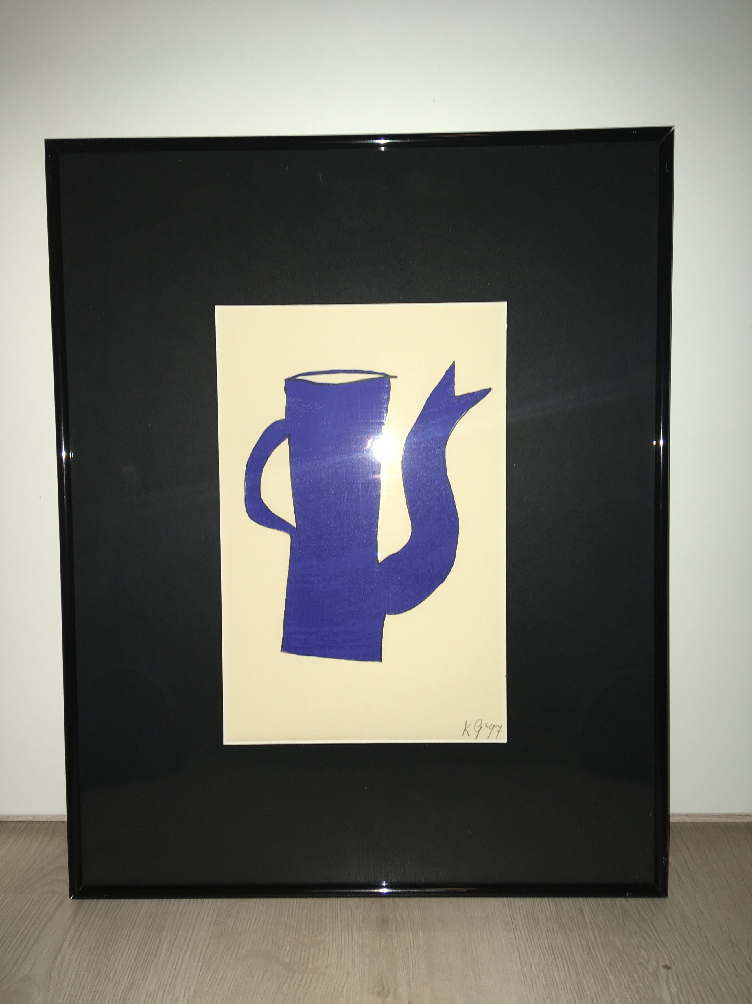 Mooi ingelijste "Blauwe kan" van Klaas Gubbels uit '97. Zeefdruk zit in een prachtige zwarte lijst met zwart paspartou en afgeschuinde witte rand. Hier is niet op bespaard.
