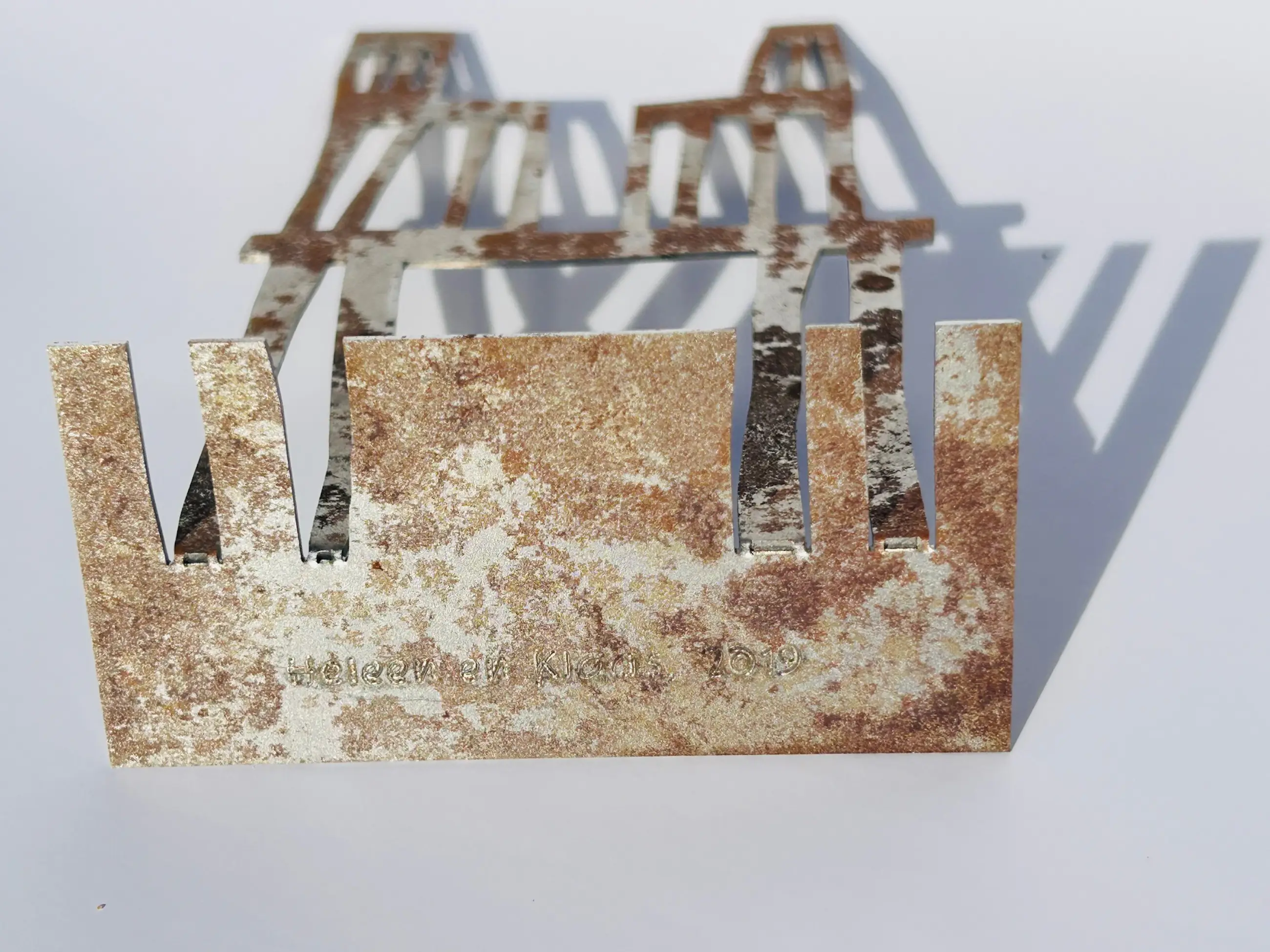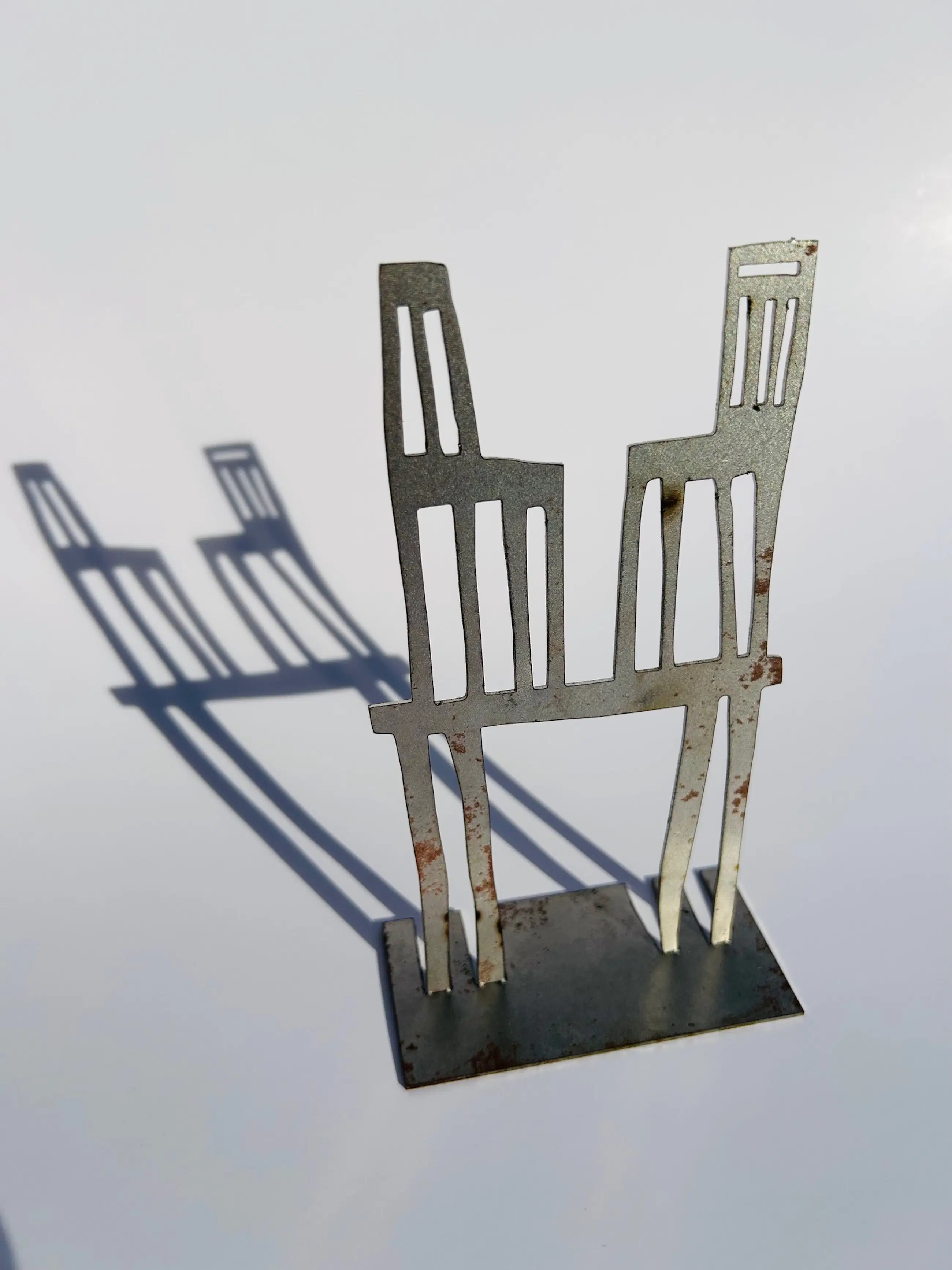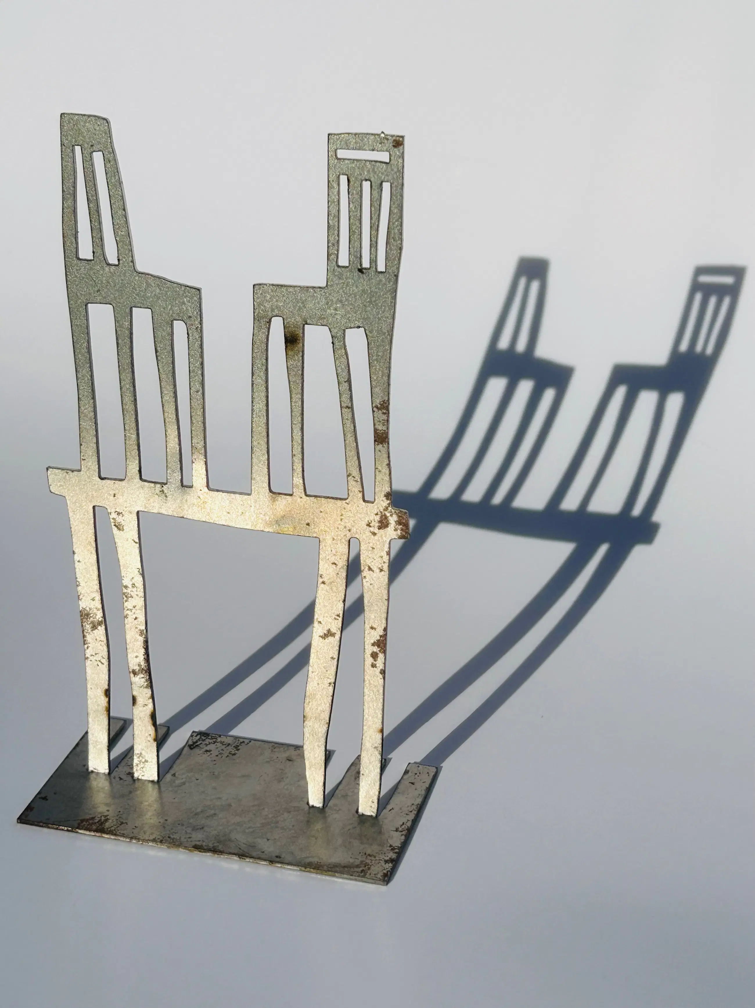 Fraai ijzeren object van Klaas Gubbels. Klein maar fijn! Jaarlijks maakt Klaas zo'n klein object in een zeer beperkte oplage. Vaak ruimtelijke miniaturen van bestaand werk Dit beeldje toont twee stoelen op tafel en is geïnspireerd op het olieverf doek Na sluitingstijd (hommage aan Cézanne) uit 1966. Dit ijzeren beeldje is 14cm hoog. Het beeldje is op de voet gesigneerd en gedateerd 'Heleen en Klaas Gubbels 2019'.