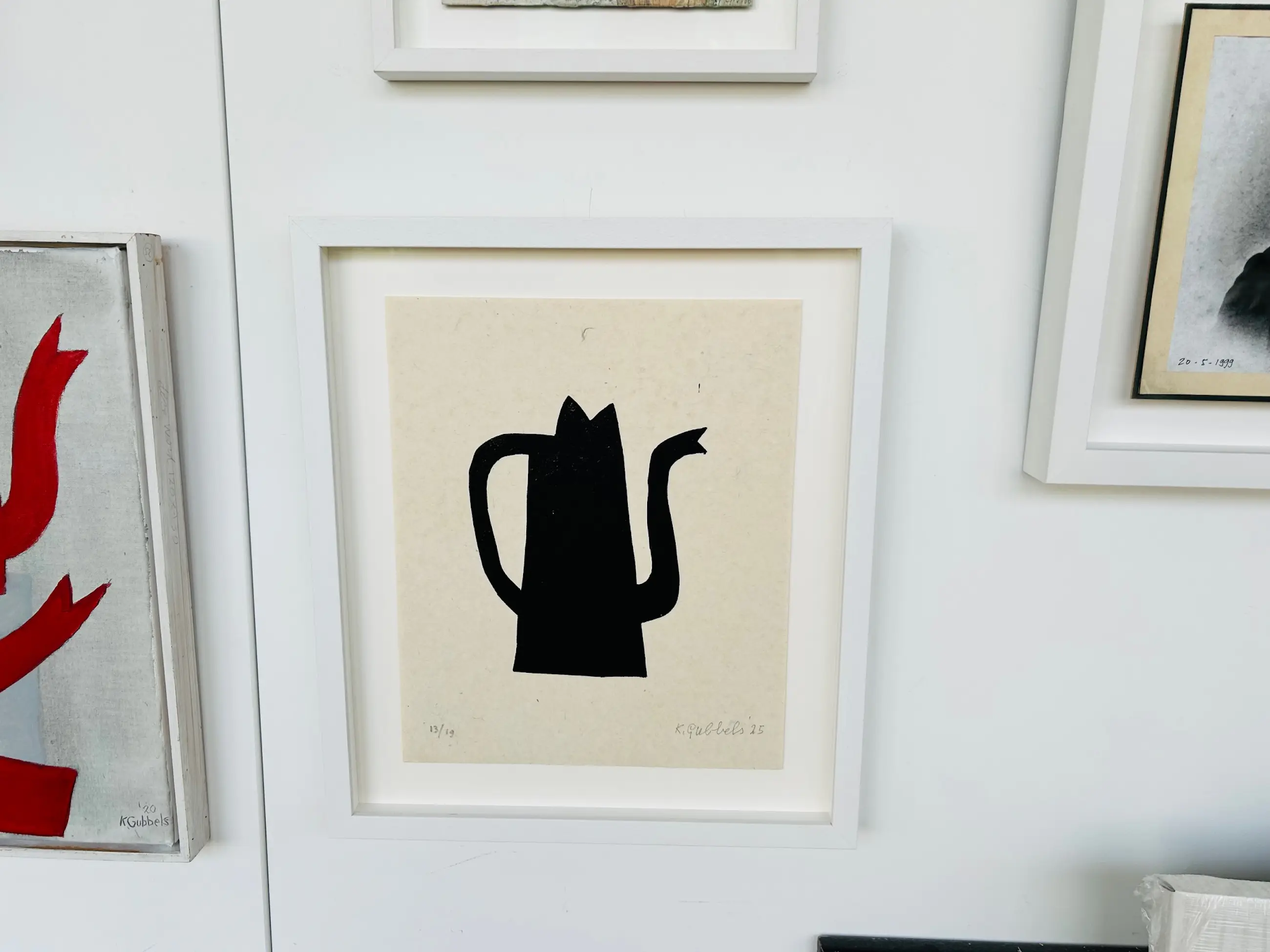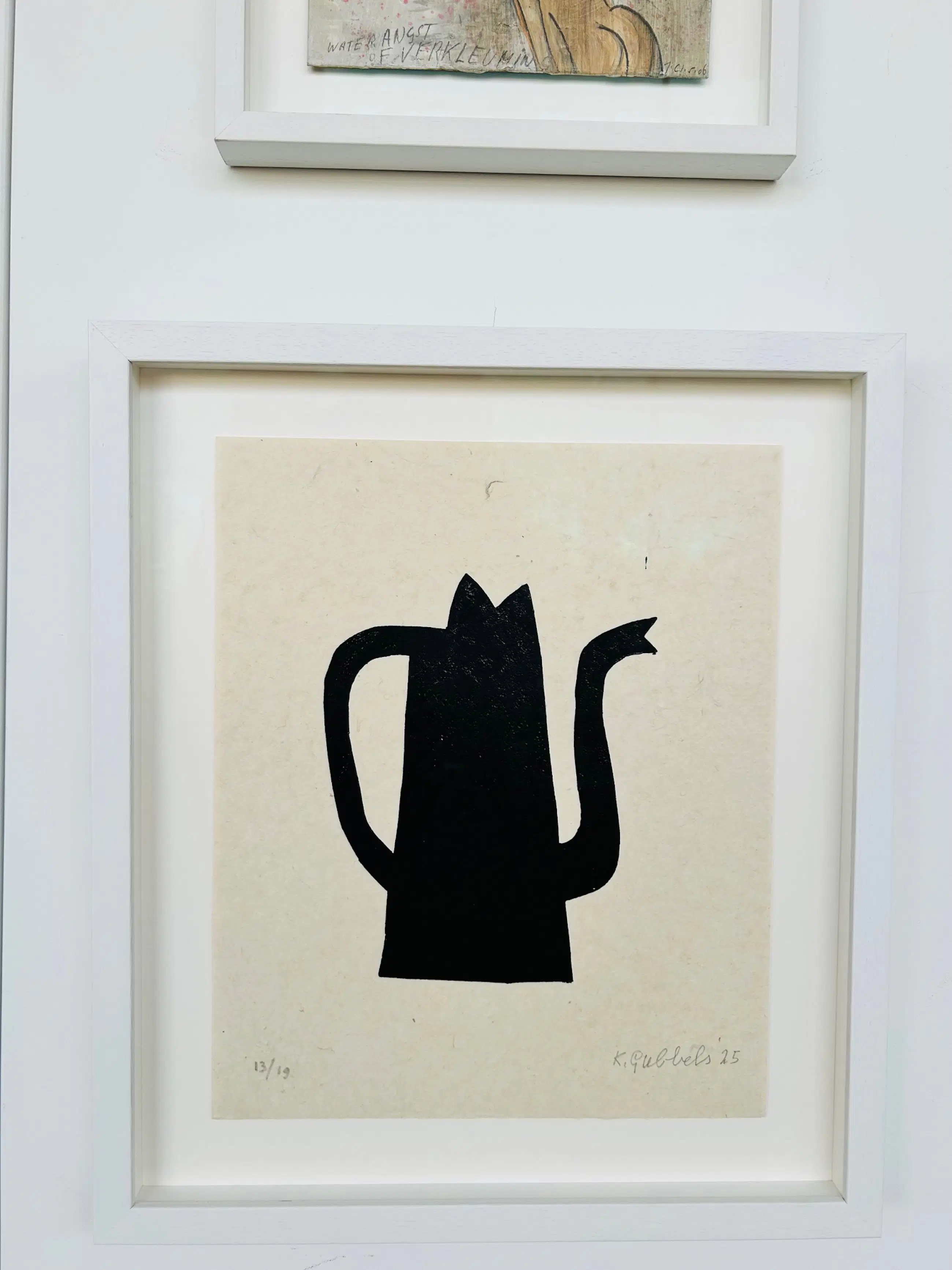 Het werk heeft een nieuwe maatwerklijst met speciaal kostbaar glas en is 'zwevend' ingelijst met een latje tussen het glas en de zuurvrije achterplaat. U kunt hem zo ophangen.