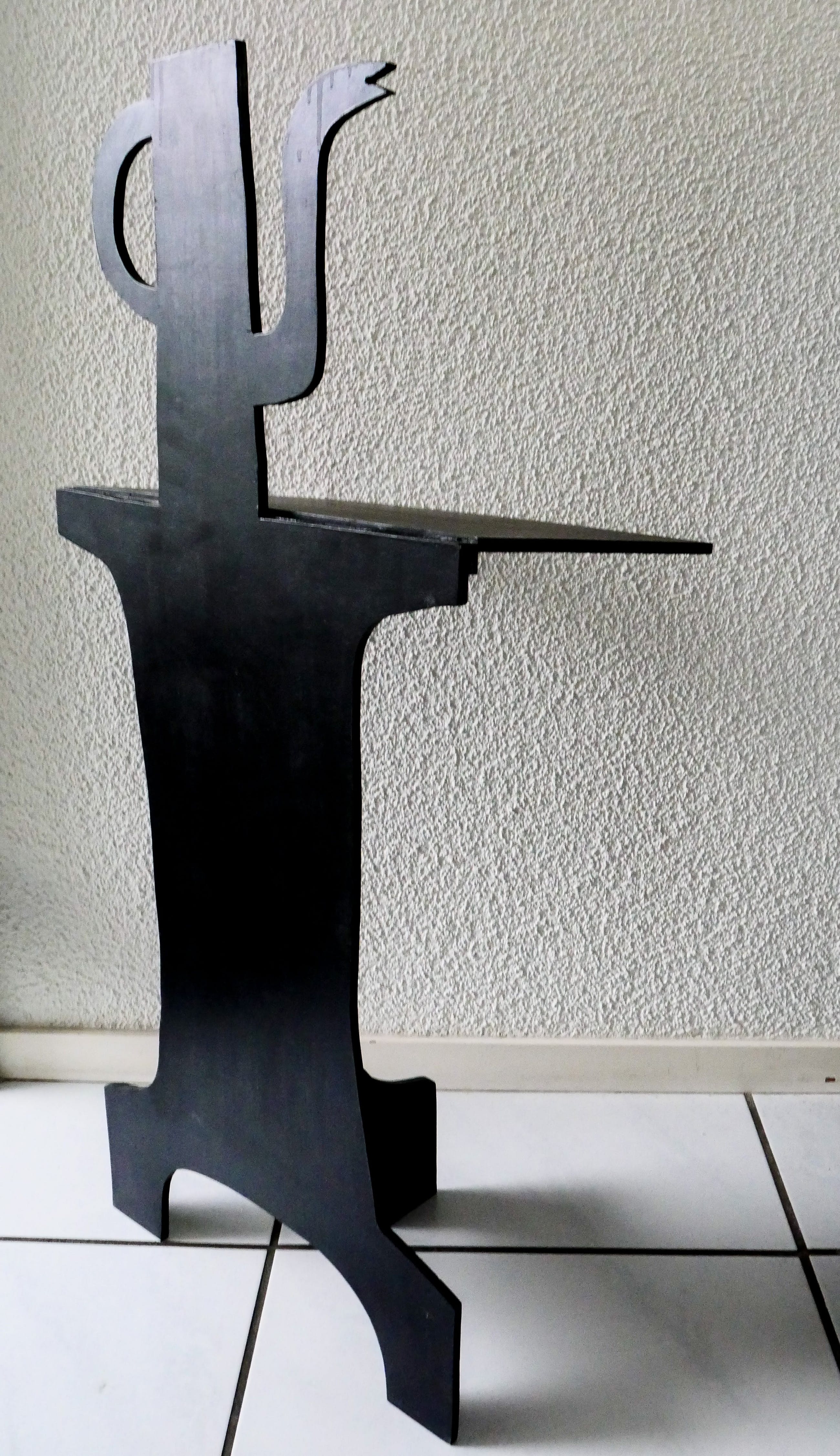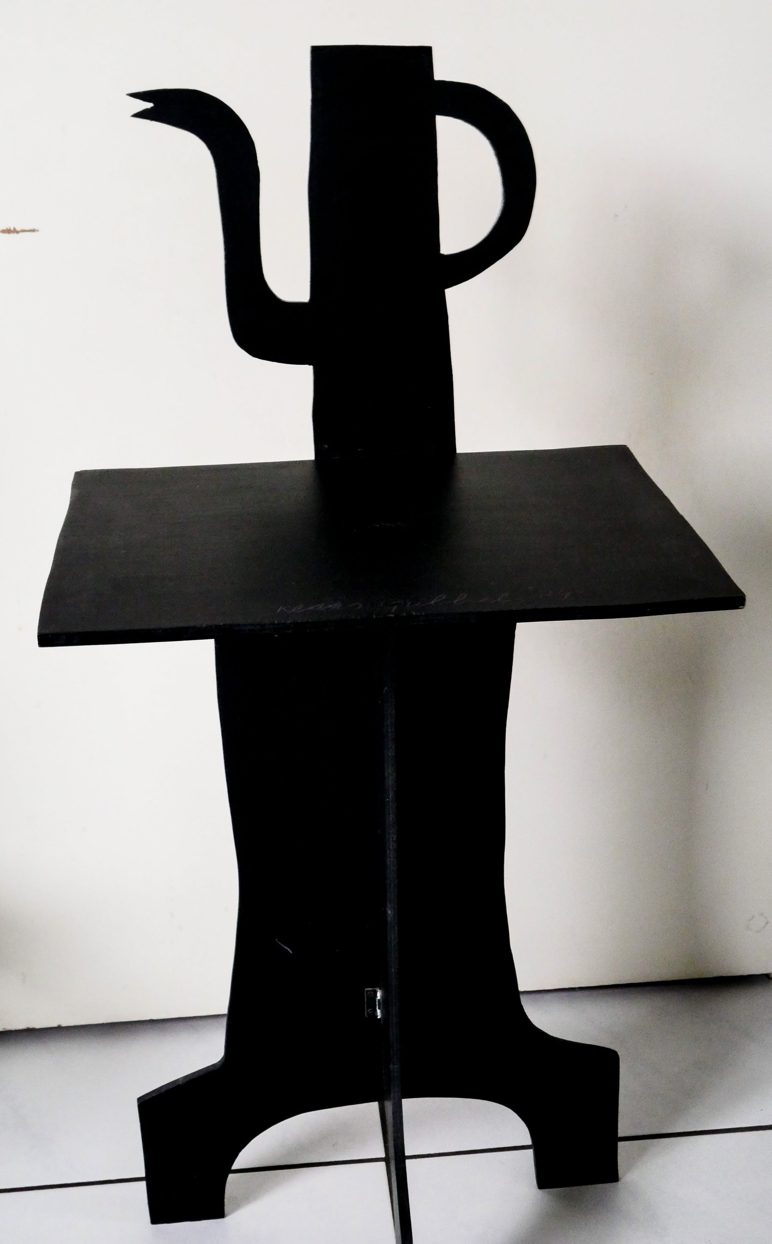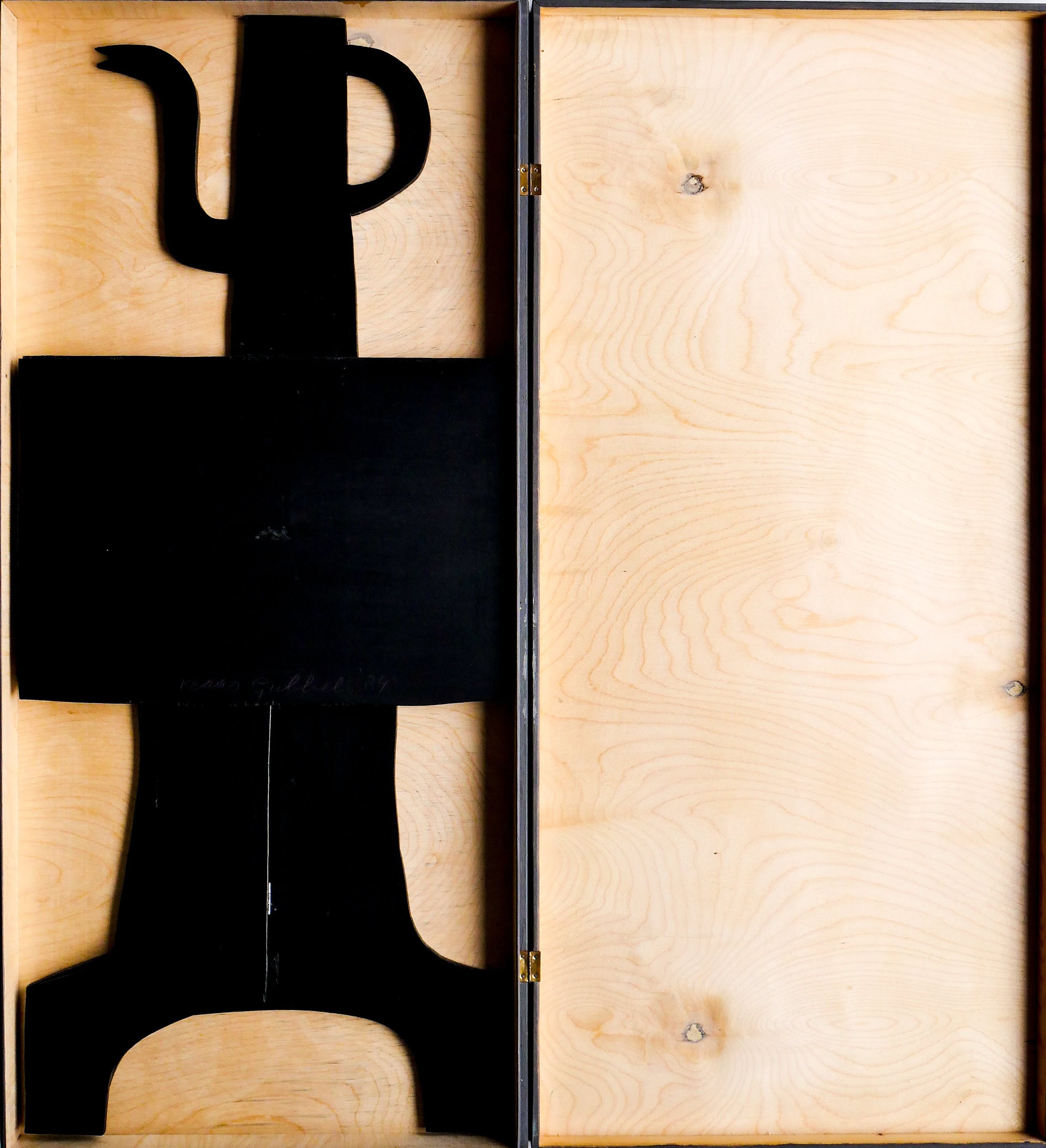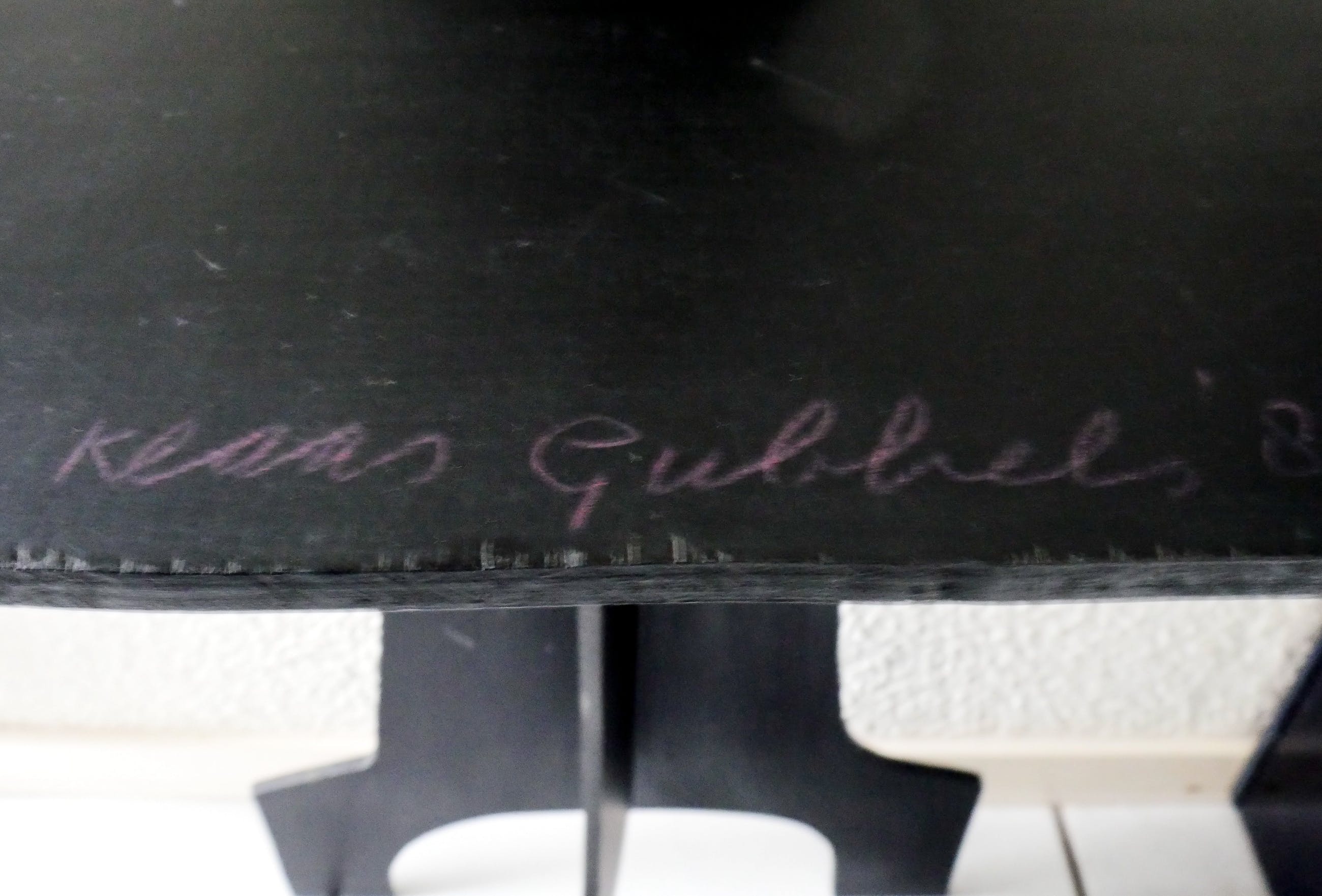Klaas GubbelsSculptuur van Triplexgesigneerd met de hand.Uitklapbare, door Klaas Gubbels vervaardigde tafel van multiplex.Op de tafel staat een uitgezaagd stilleven.Het object wordt geleverd in een grijze houten doos.maten doos; 89 x 42 x 5 cmMinimale beschadiging op het blad van het tafeltje.Verder in goede staatdit is nummer 36/ 36 Het werk kan in overleg opgestuurd worden.