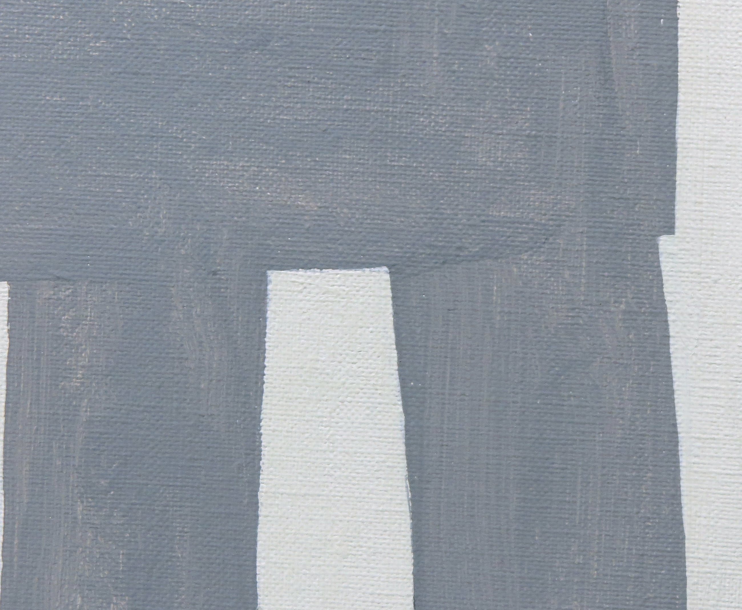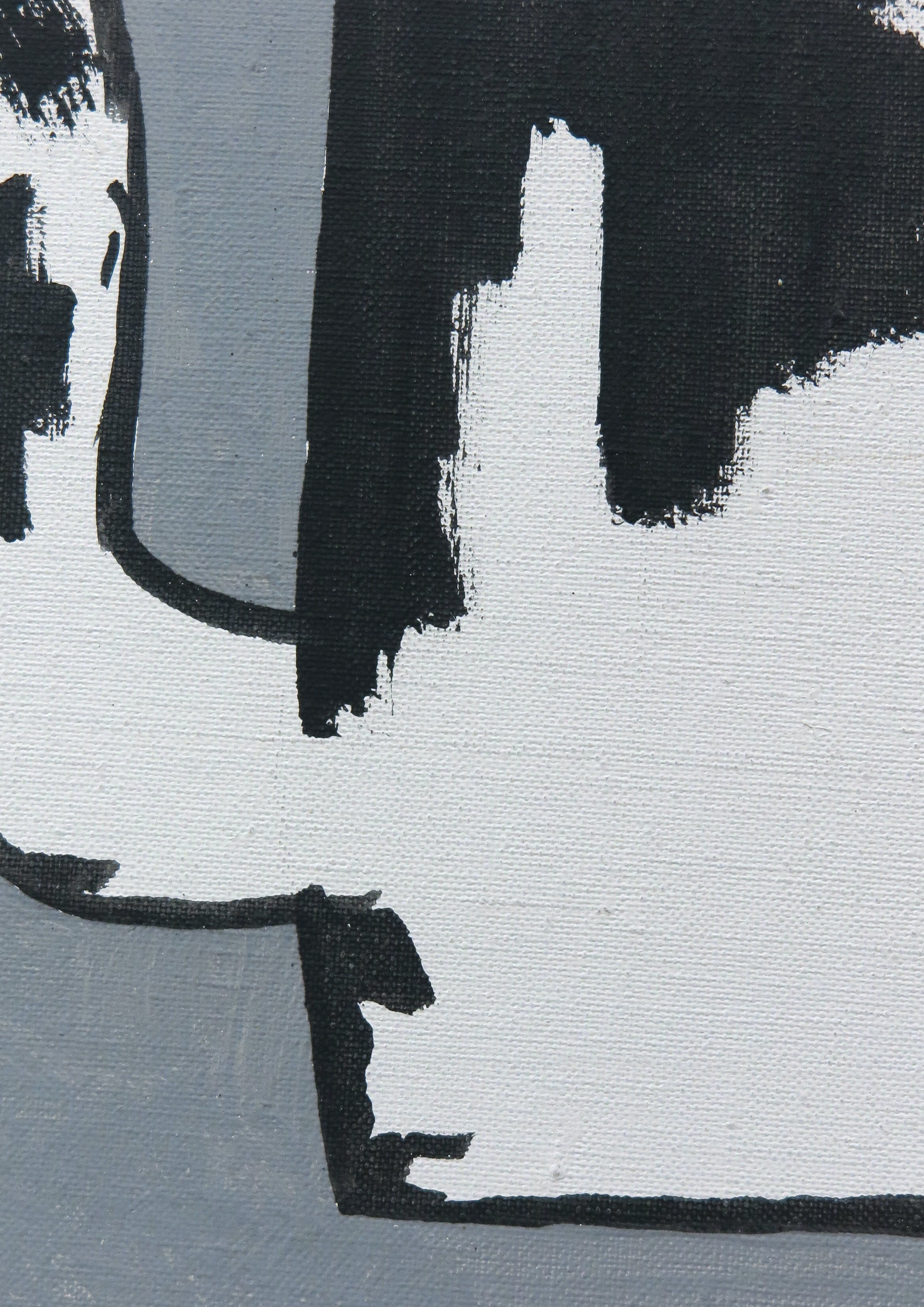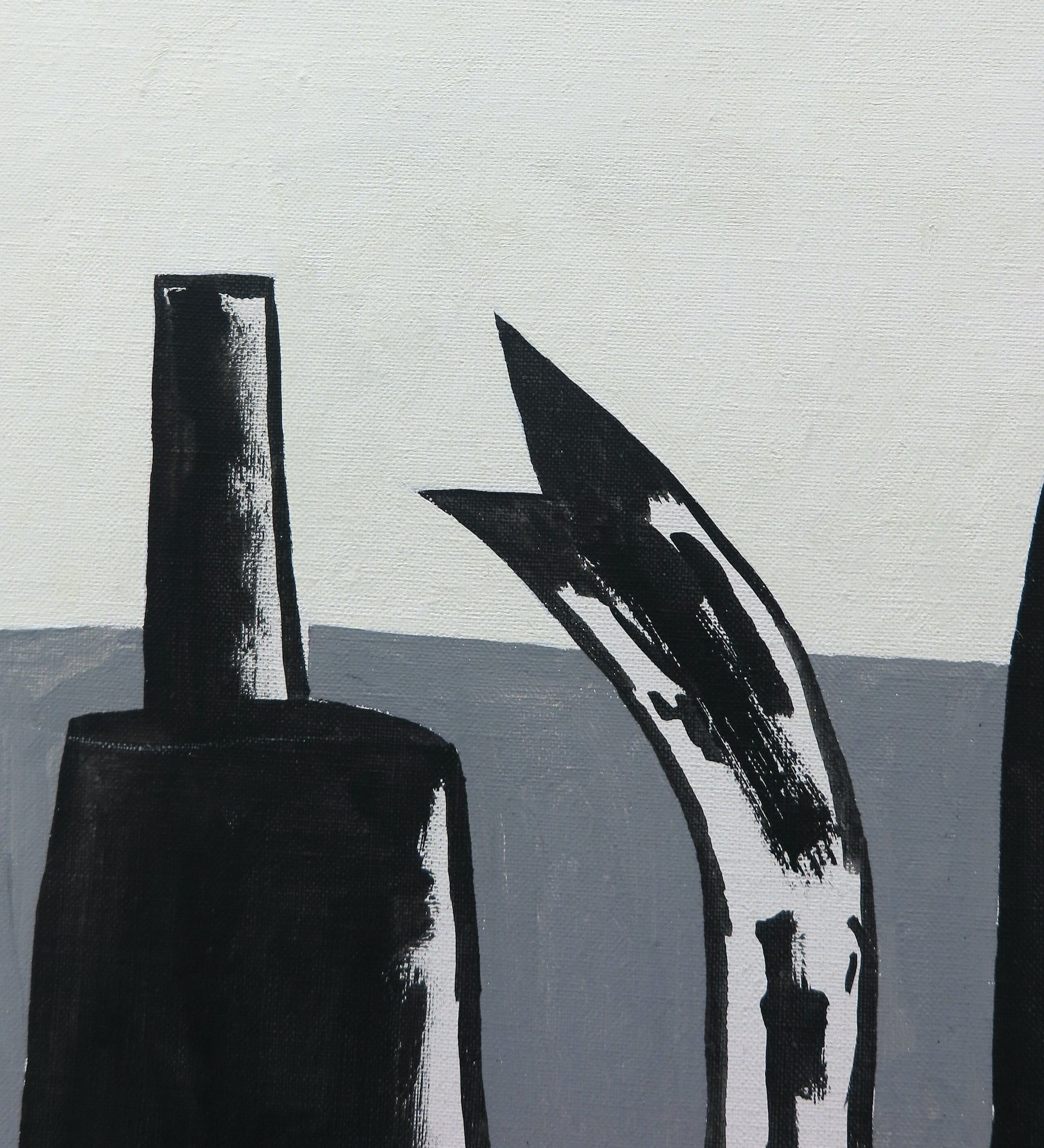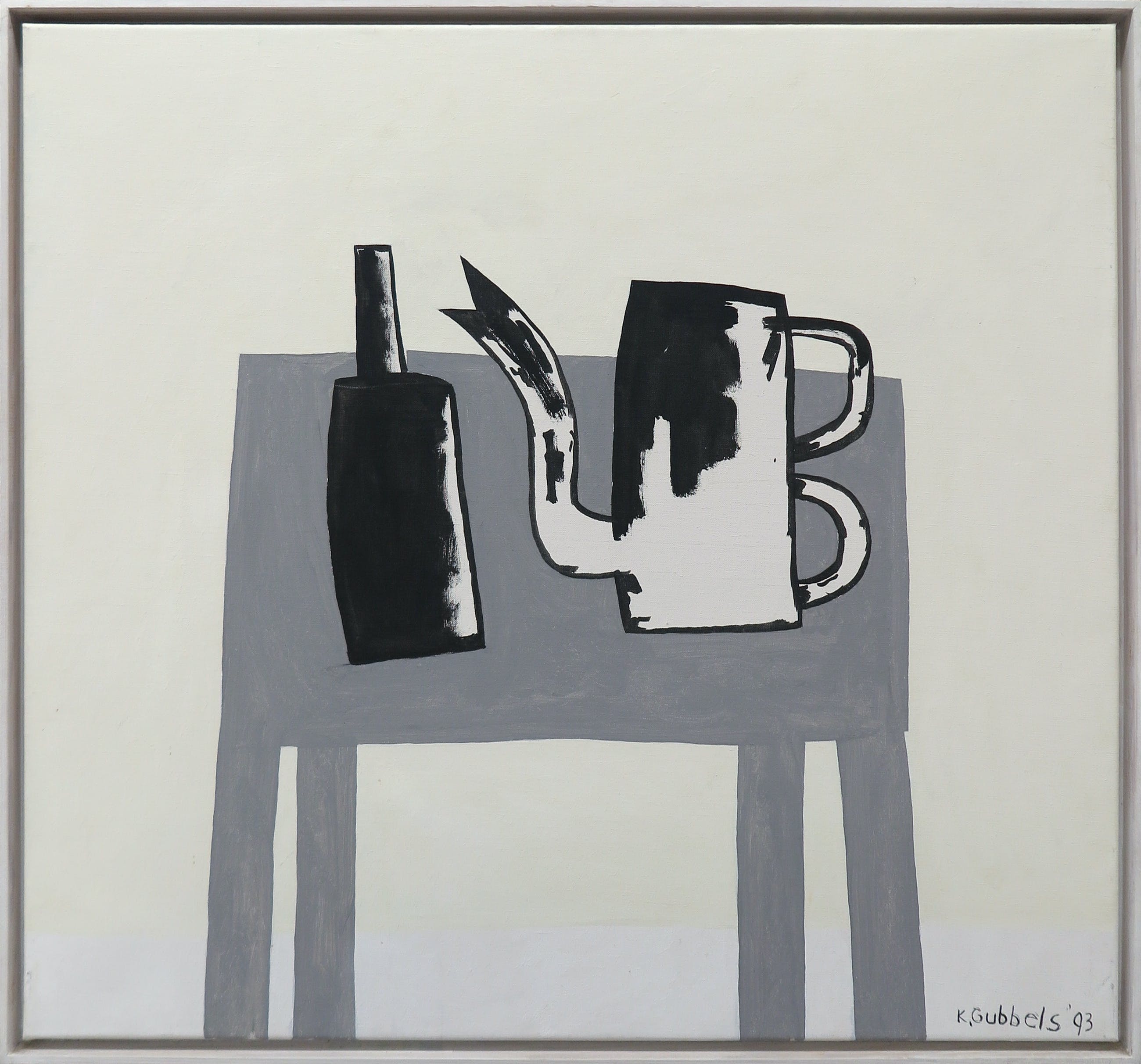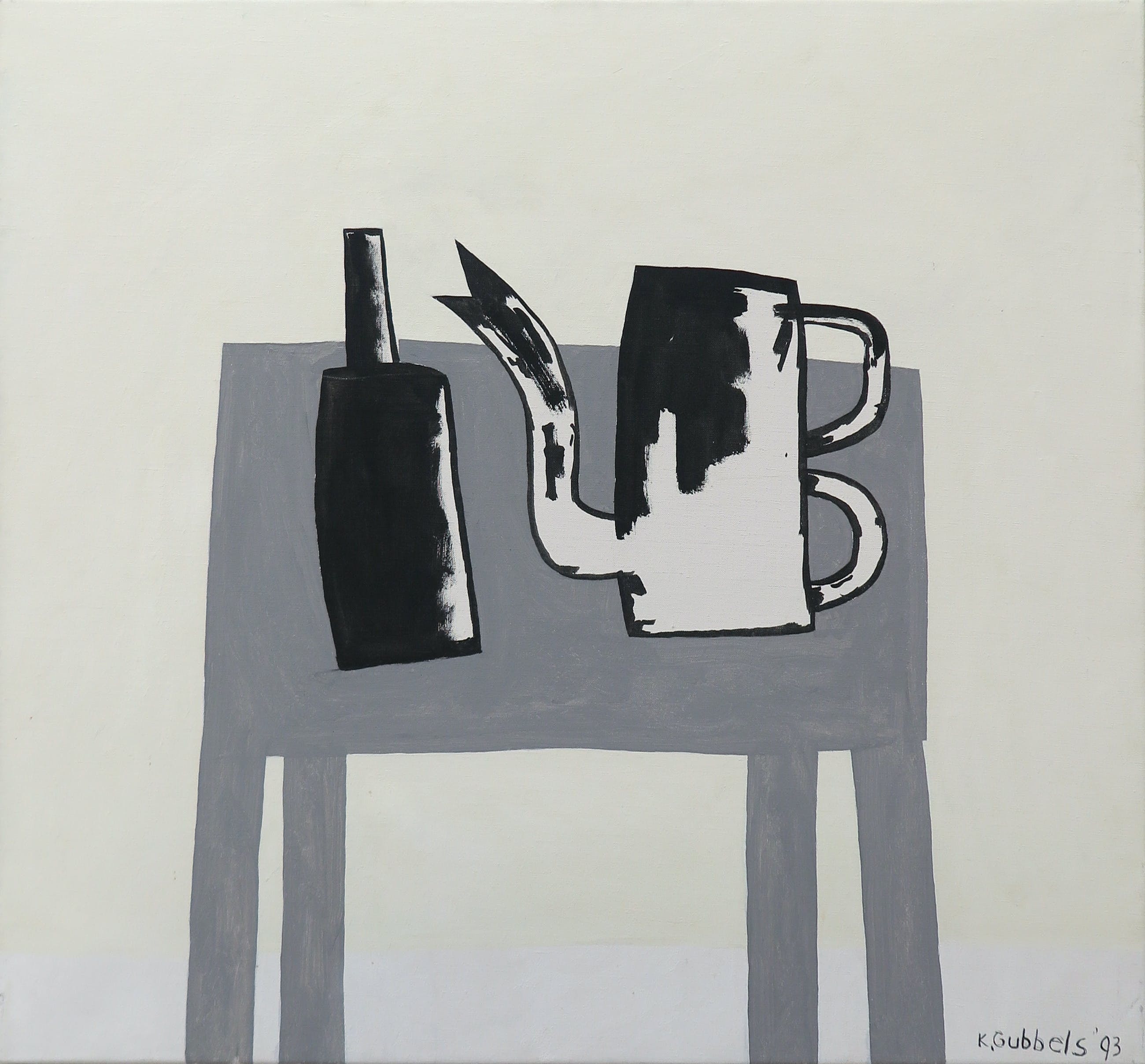 Compositie in olieverf op doek, van een koffiekan en fles op een grijze tafel. Het werk is in de hoek rechtsonder gesigneerd en gedateerd, eveneens verso op het spieraam.