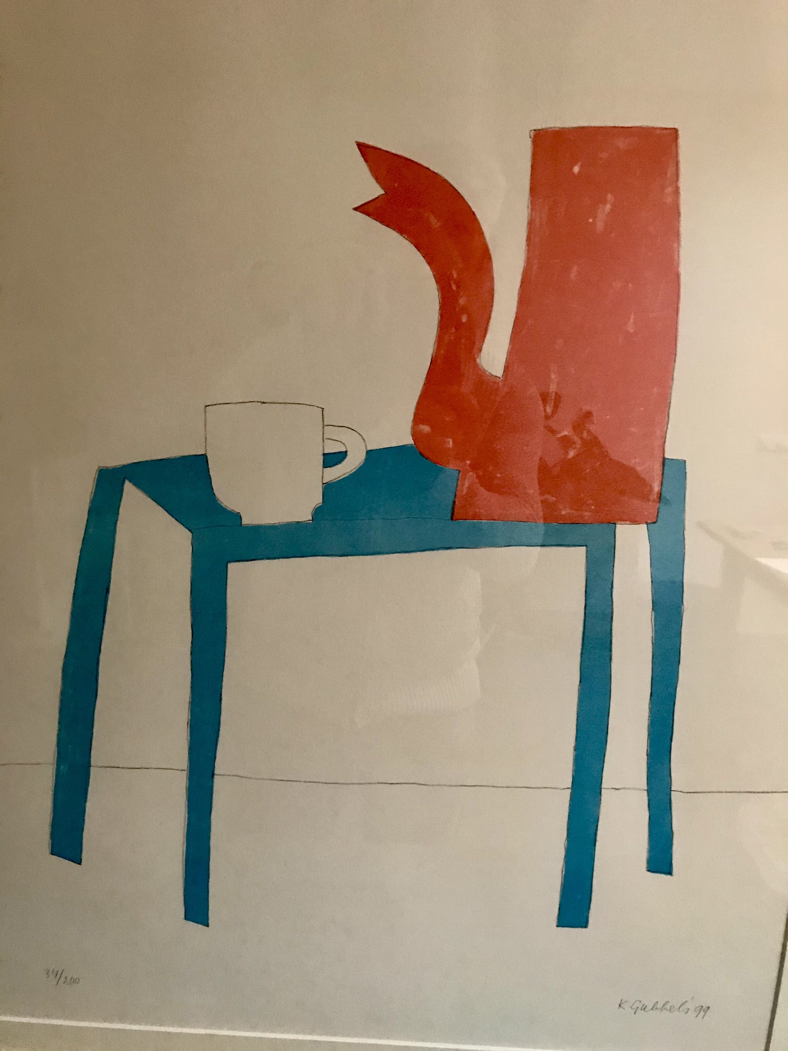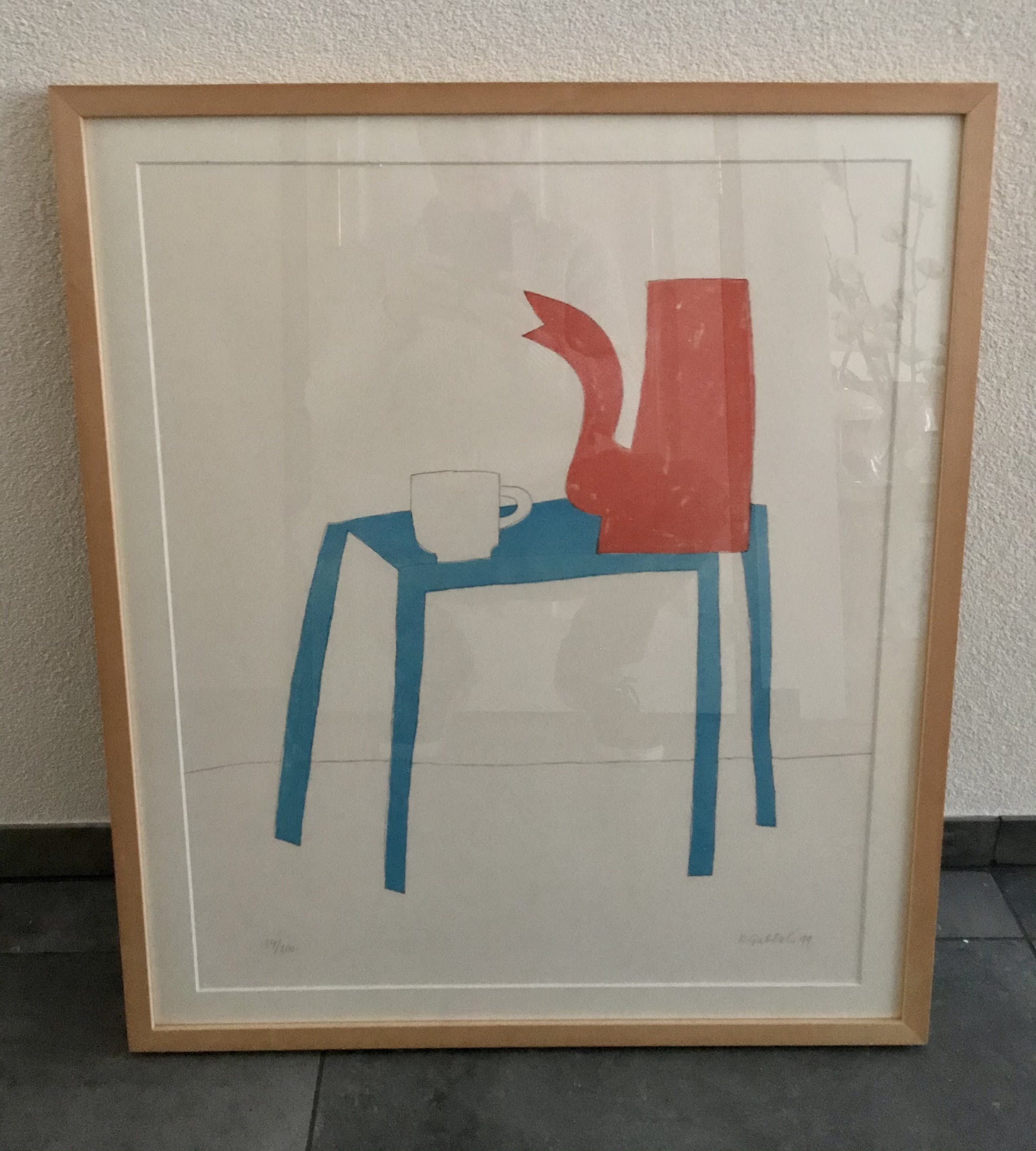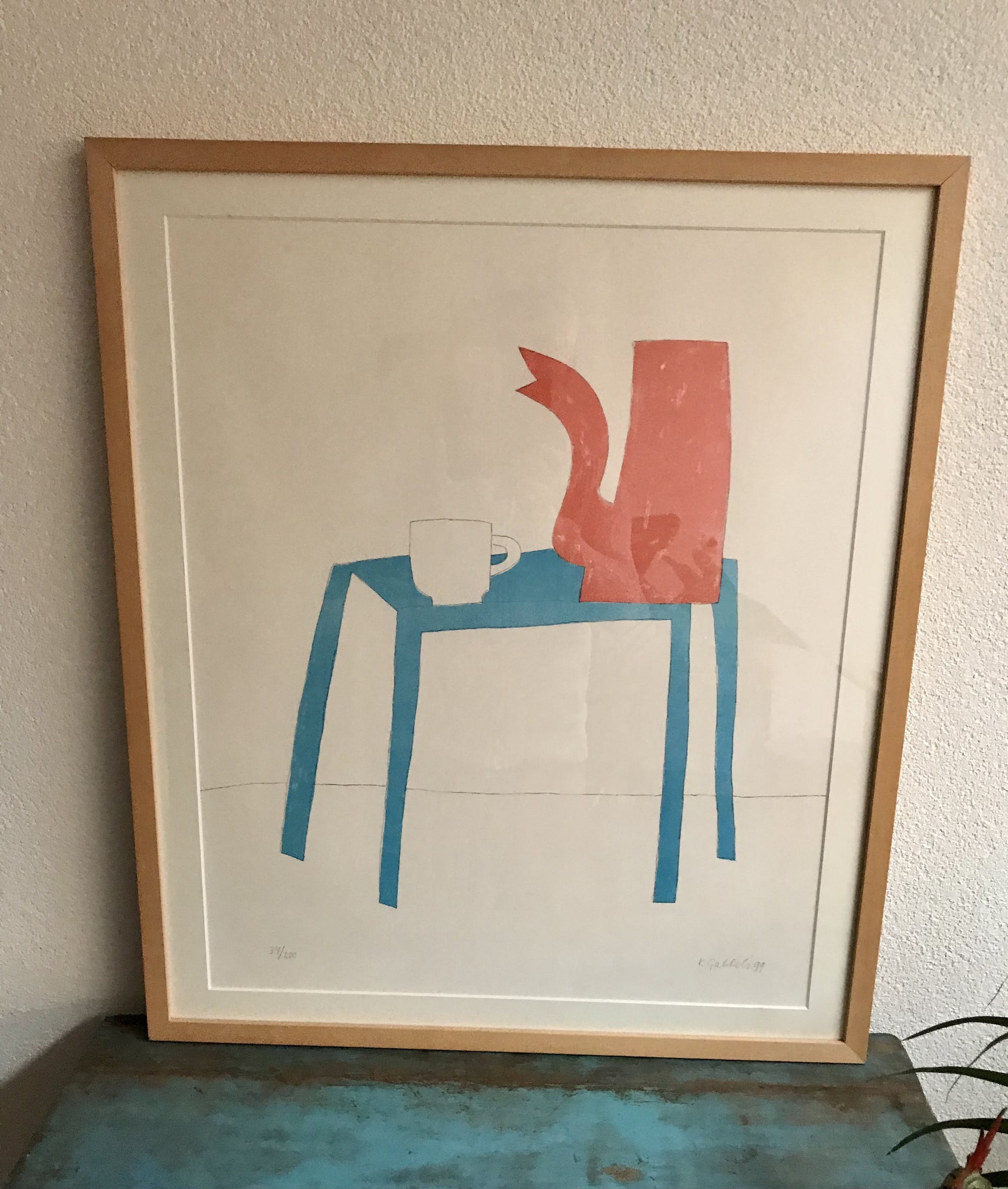 Klaas Gubbels - Litho - Nr. 34 van 200 - Rode kan, witte kop en blauwe tafel In de bekend Klaas Gubbels stijl, uitgevoerd met prachtige kleuren. Het werk is ingelijst in een stevige orginele baklijst. Het werk is komt uit 1999 en is in goede staat.
