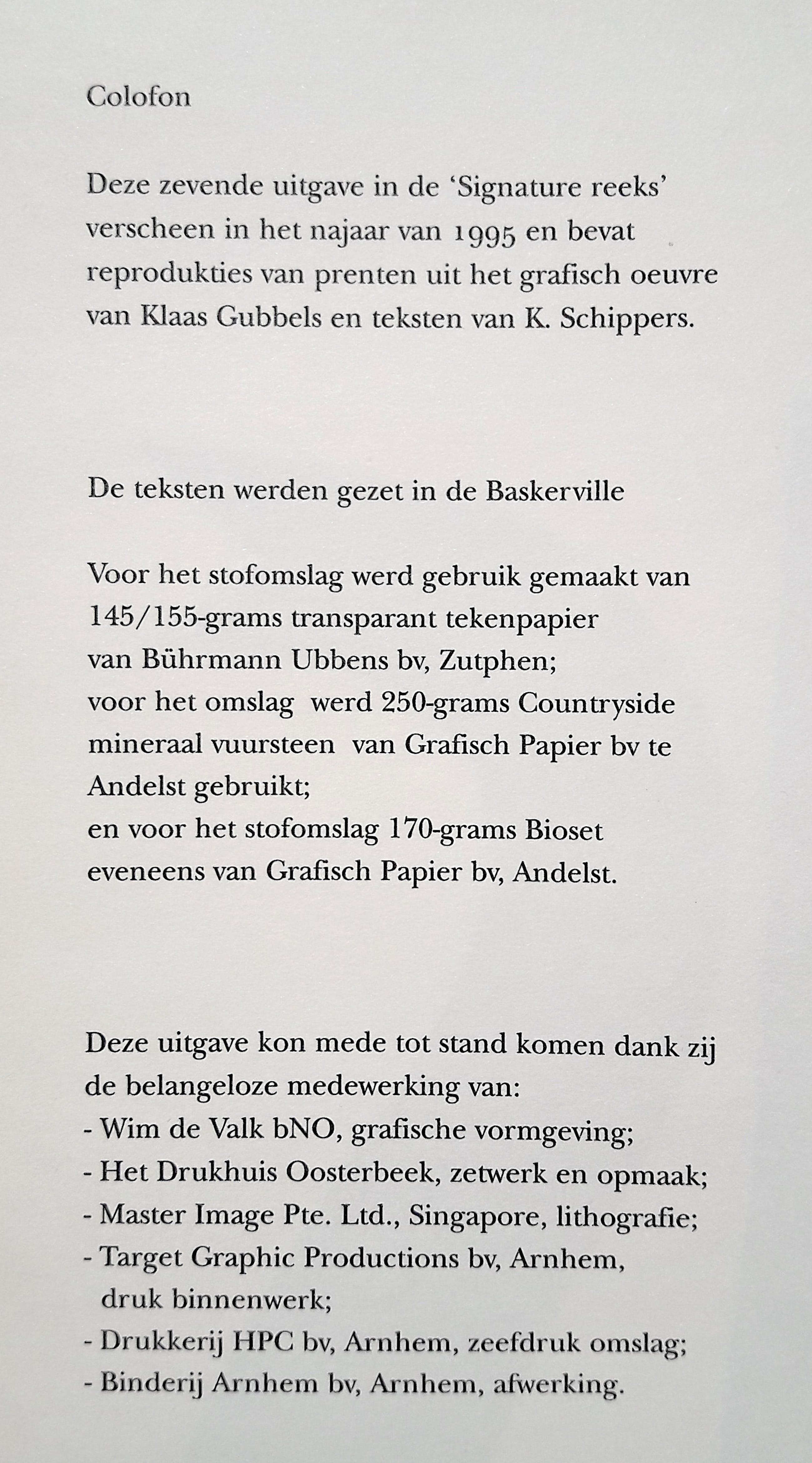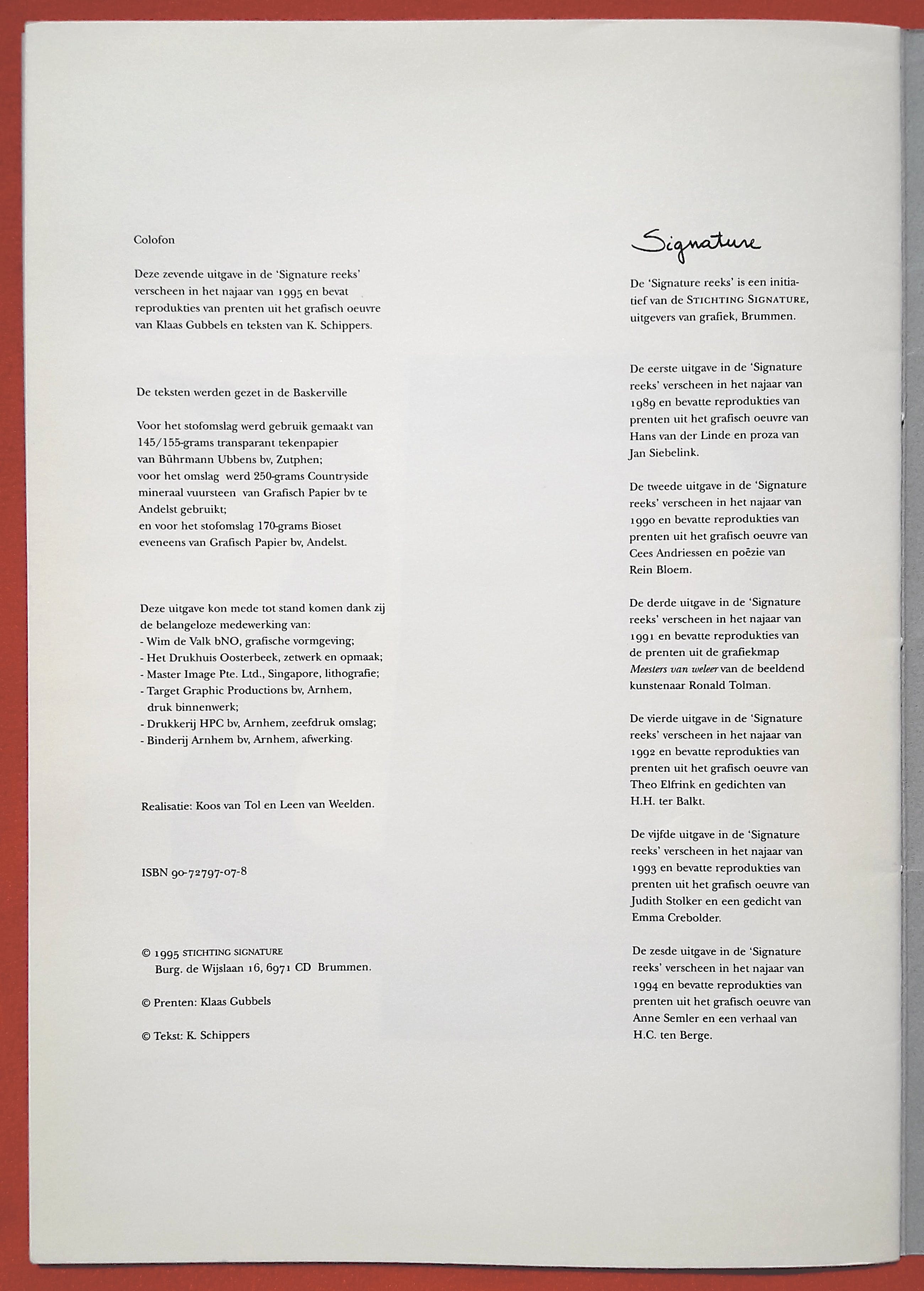 Mooie kan-op-tafel tekening op het titelblad van de 7e uitgave in de Signature reeks. Tekening met stift, rechtsboven voluit gesigneerd en gedateerd (Februari ’96) en rechtsonder gemonogrammeerd en nogmaals gedateerd. De uitgave bevat 7 reproducties (omslag lijkt zelfs wel originele litho) van grafisch werk van Gubbels. In zeer goede conditie.