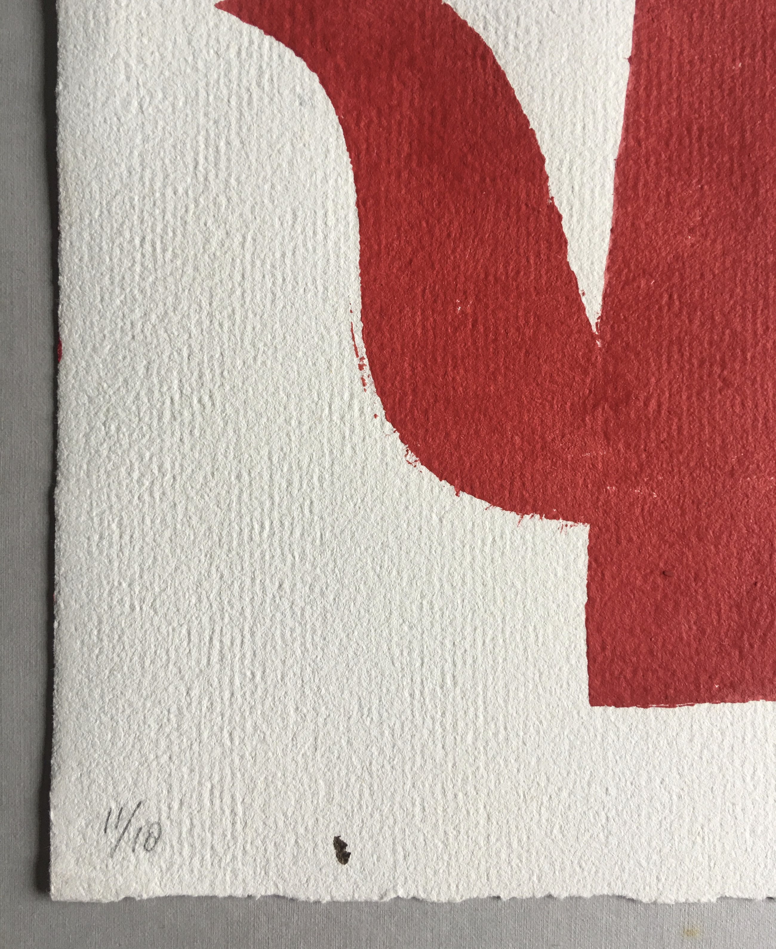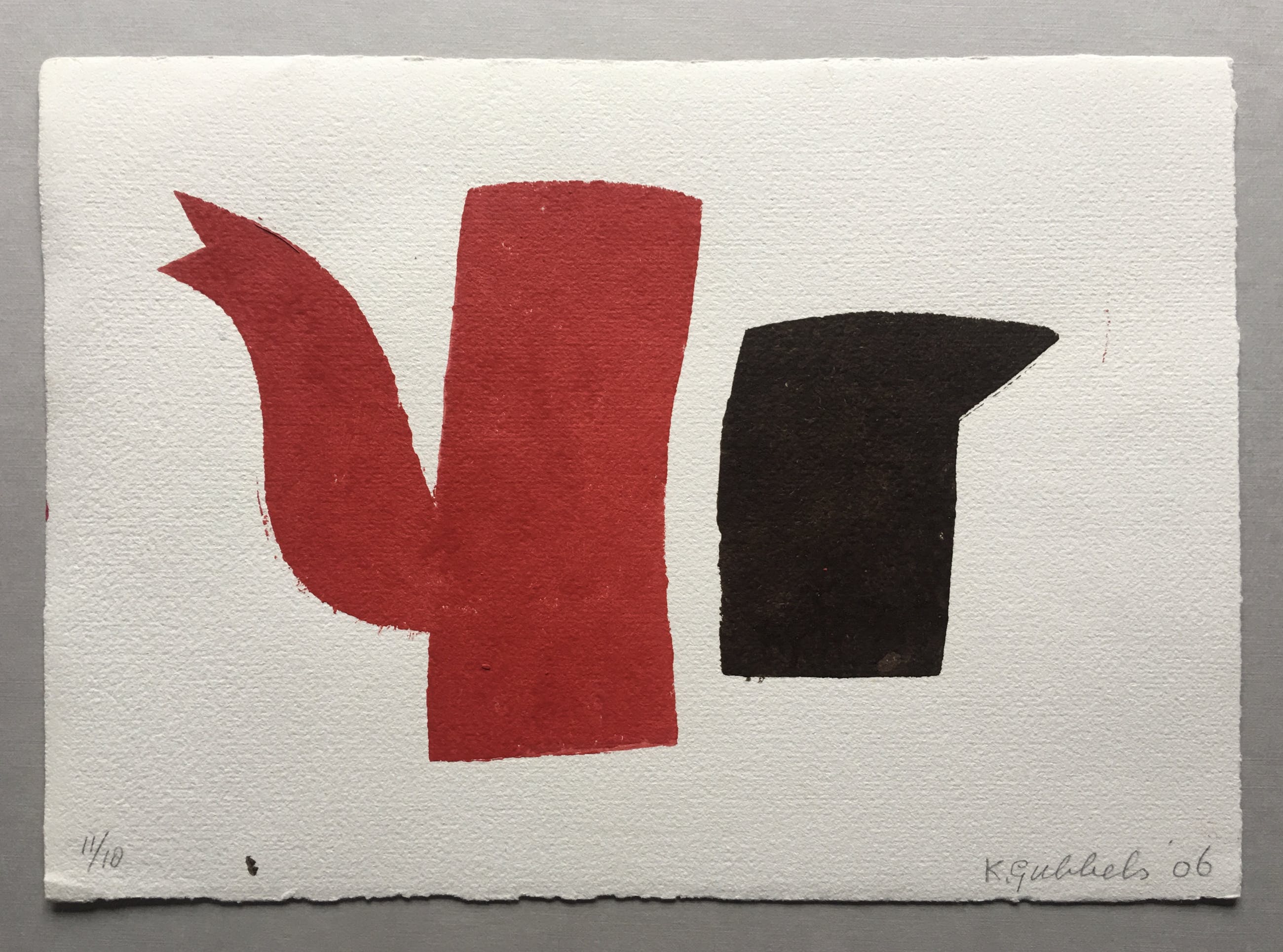 Een zeer fraaie sjabloondruk van Klaas Gubbels, ‘Stilleven in Bruin en Rood’ uit 2006 oplage 18 ex.