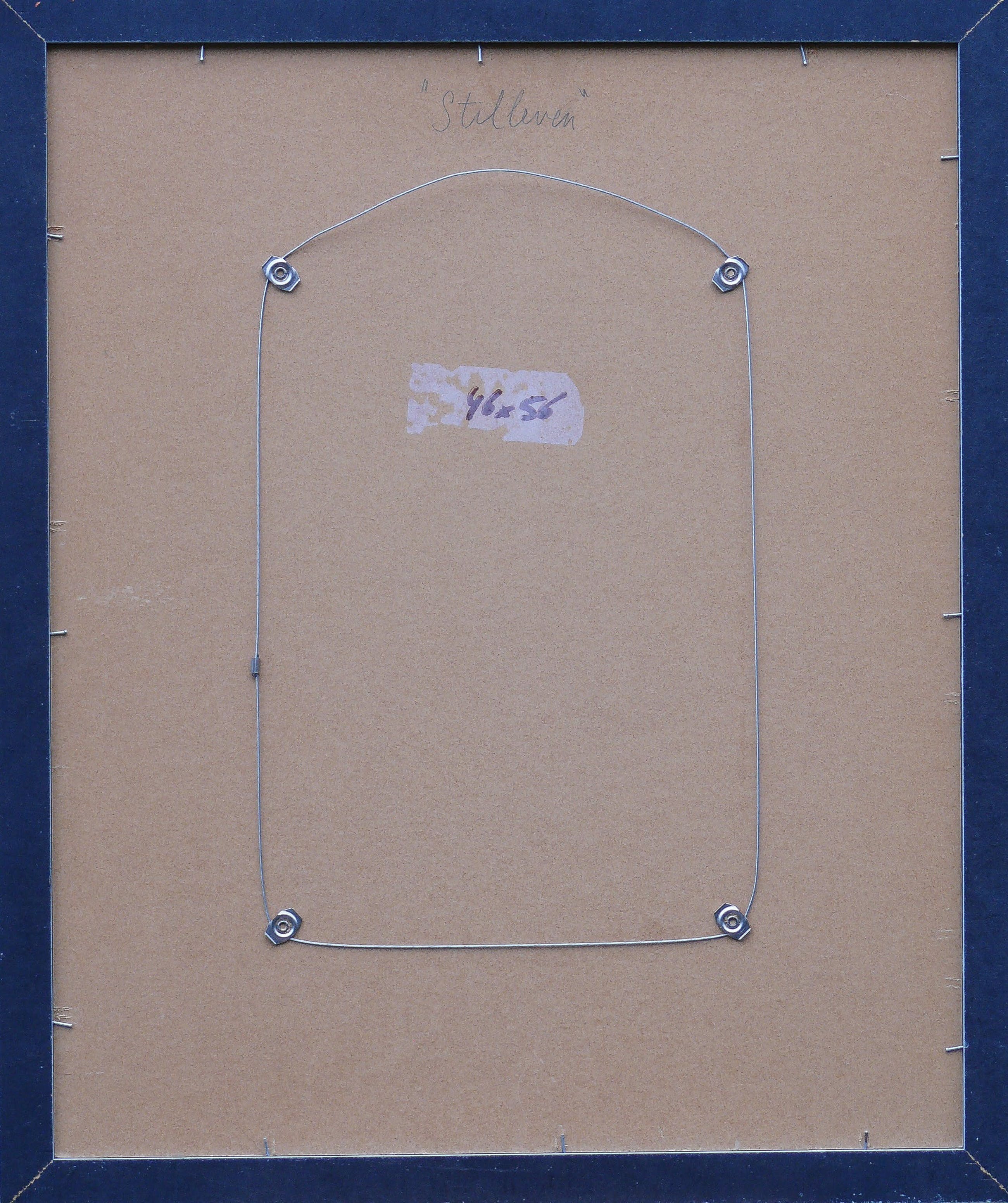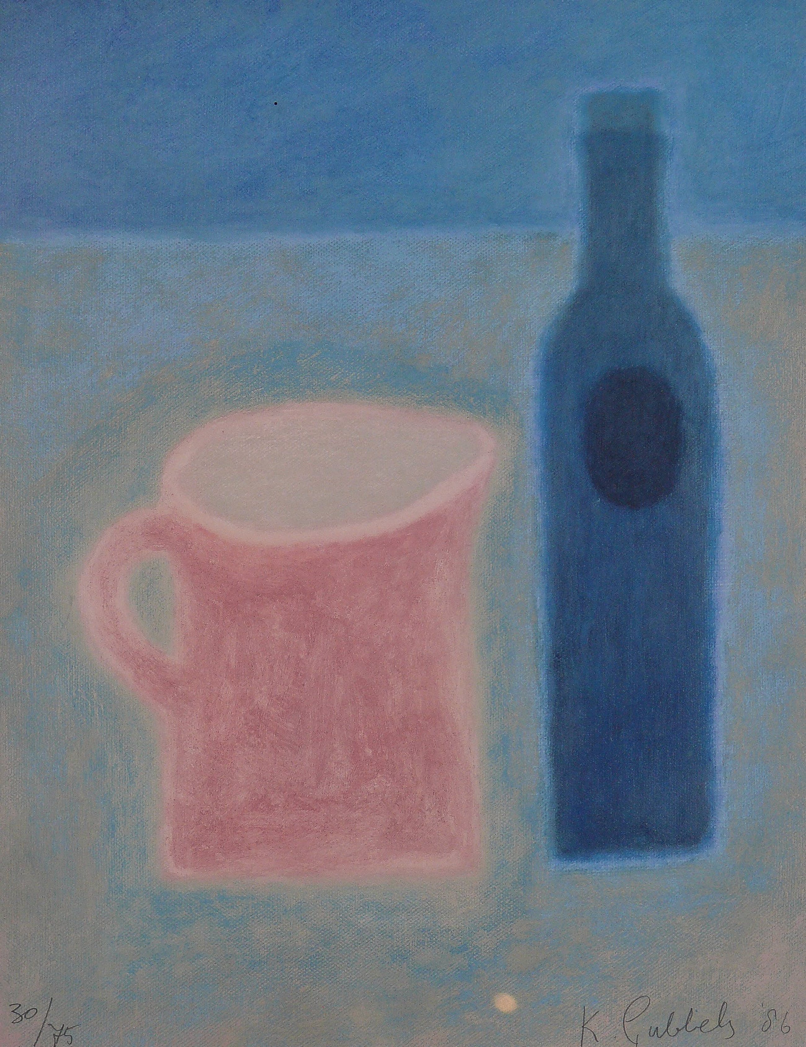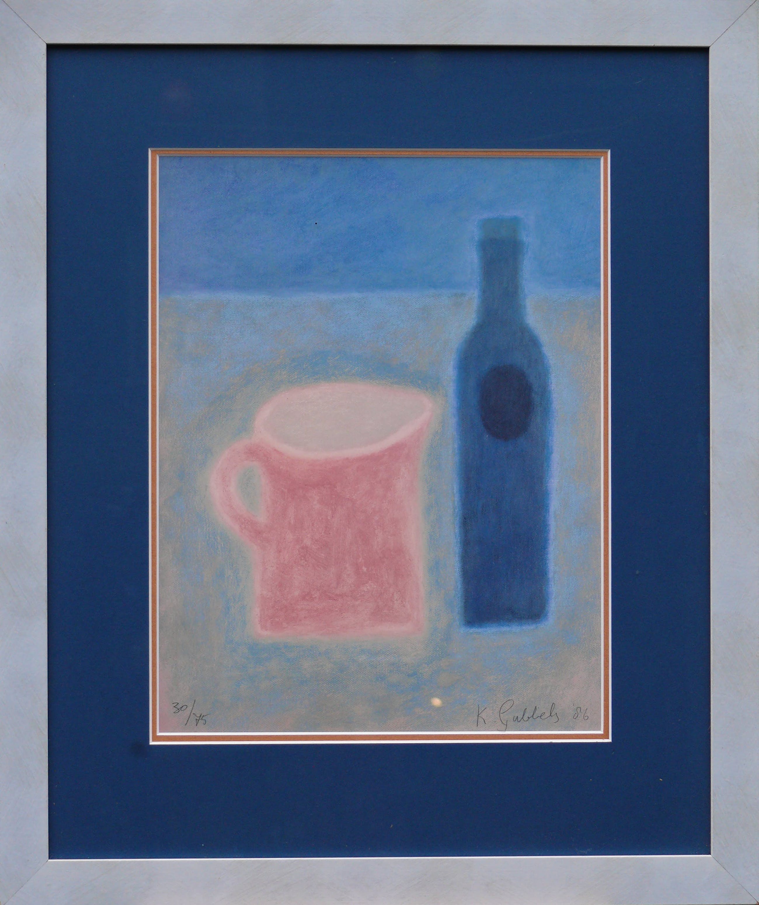 Prachtig stilleven met fles en kan van Klaas Gubbels. Gesigneerd en genummerd. De zeefdruk is met dubbel passe-partout achter glas ingelijst.