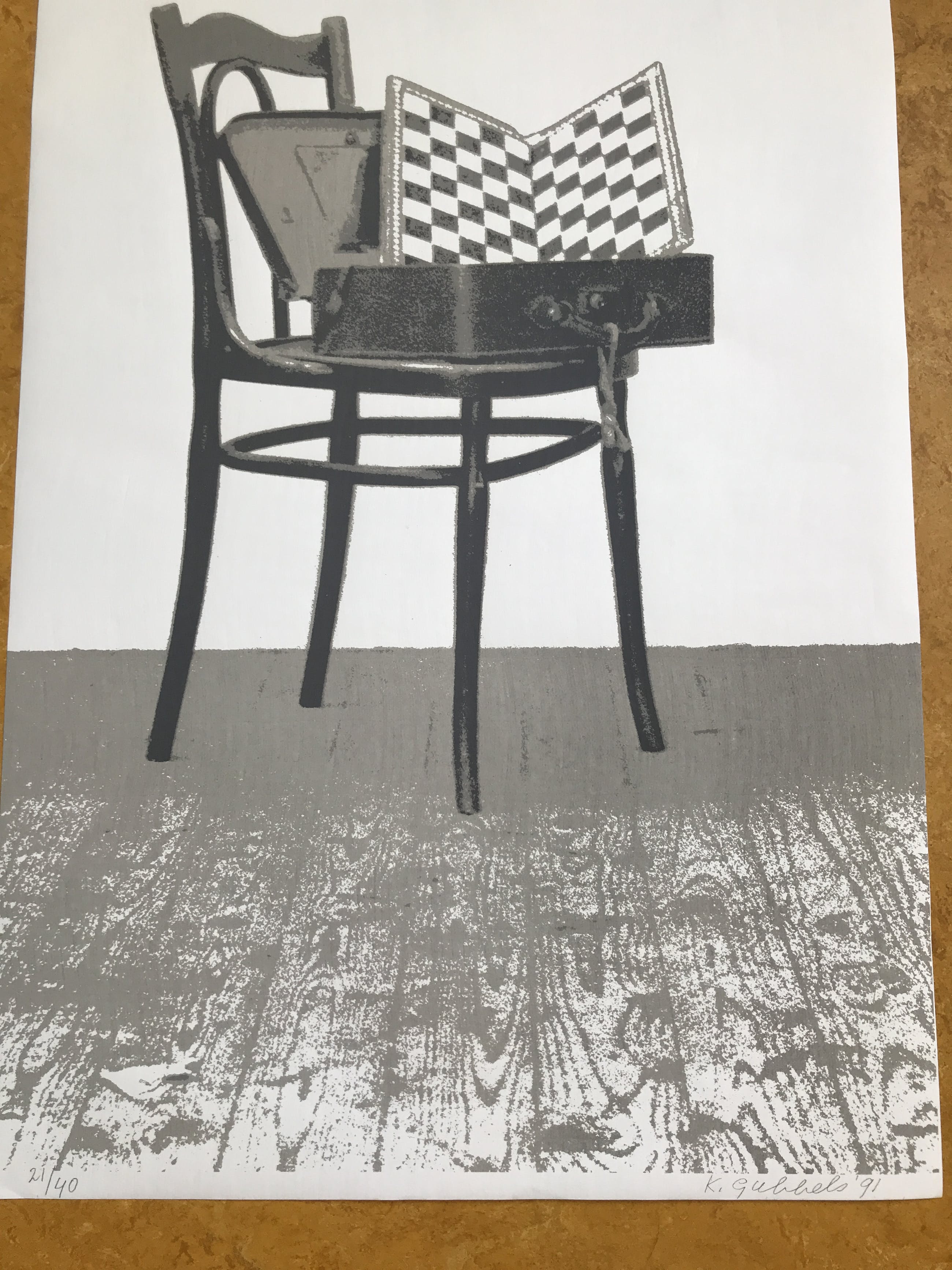 Litho Klaas Gubbels uit 1991 gesigneerd en genummerd 21/40 . Stoel met schaakbord.