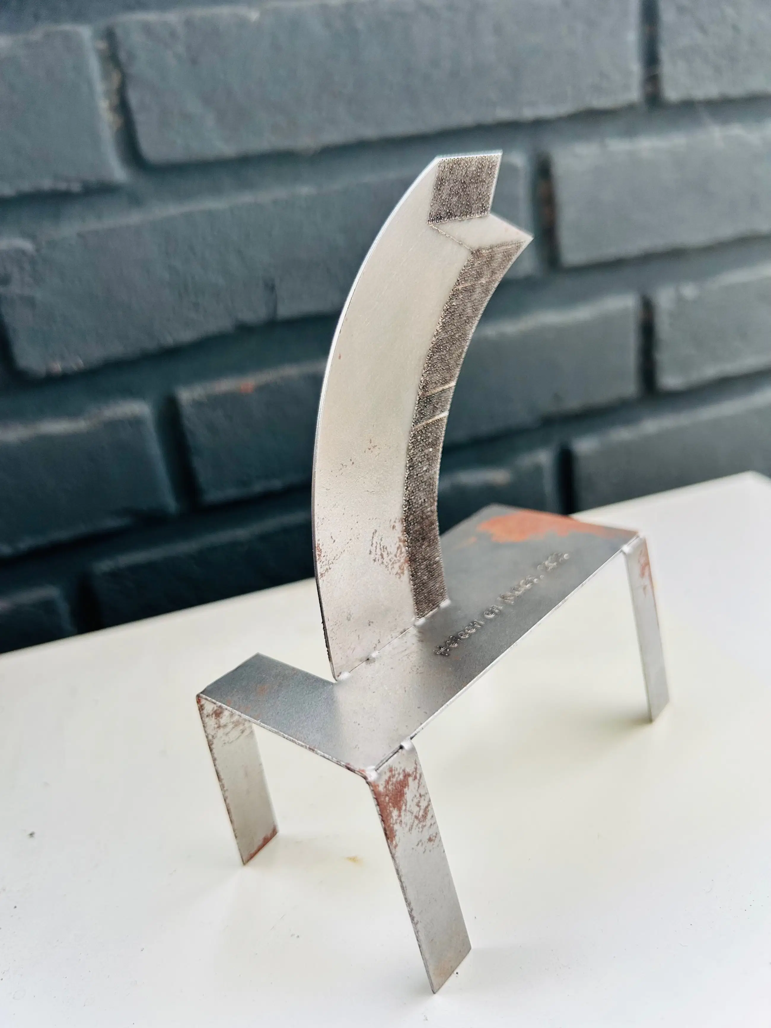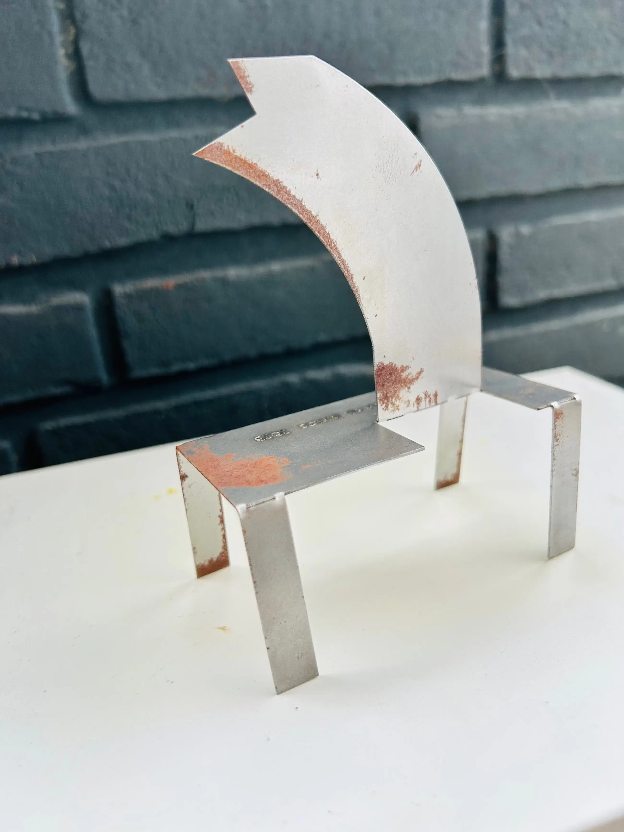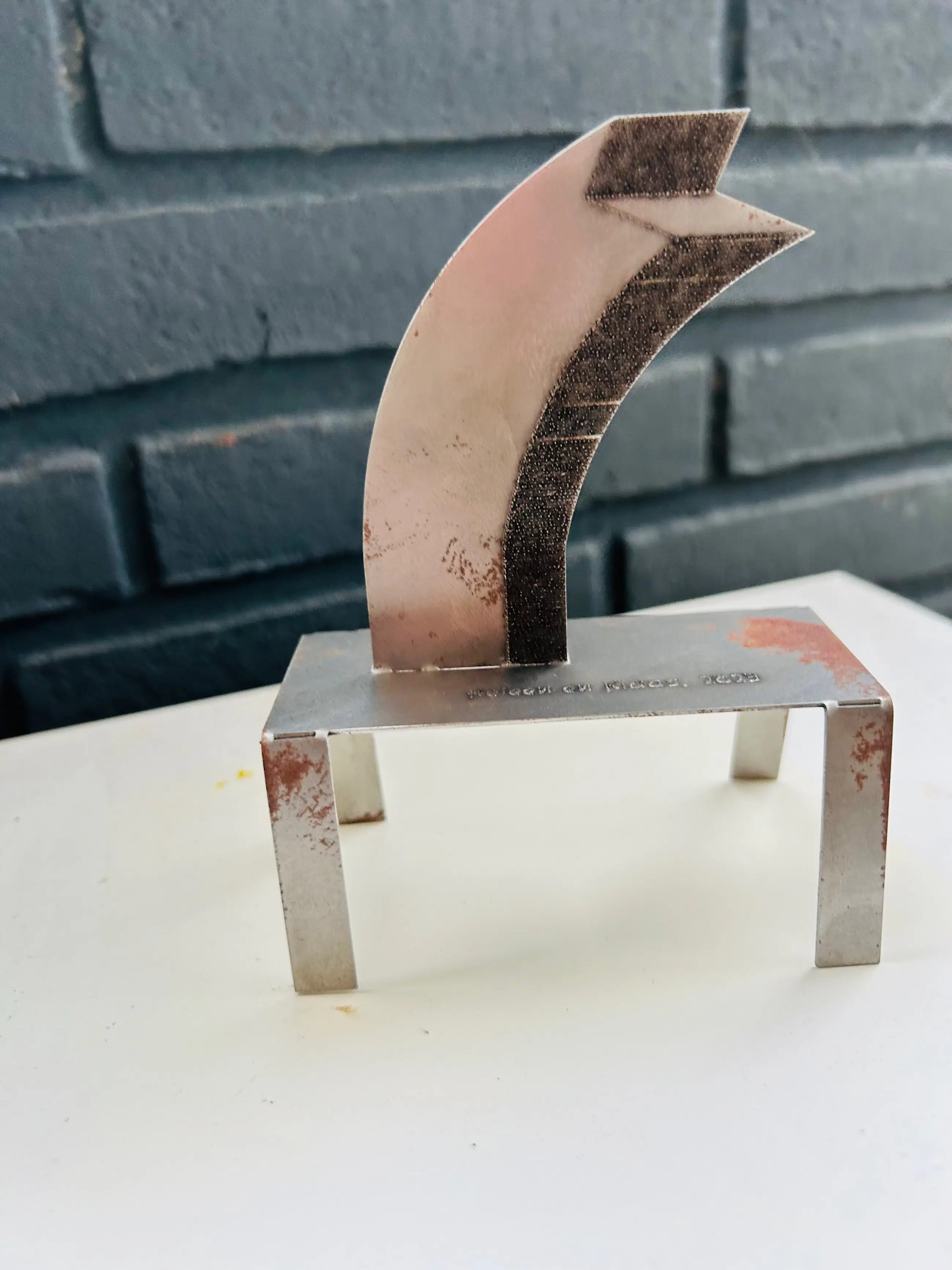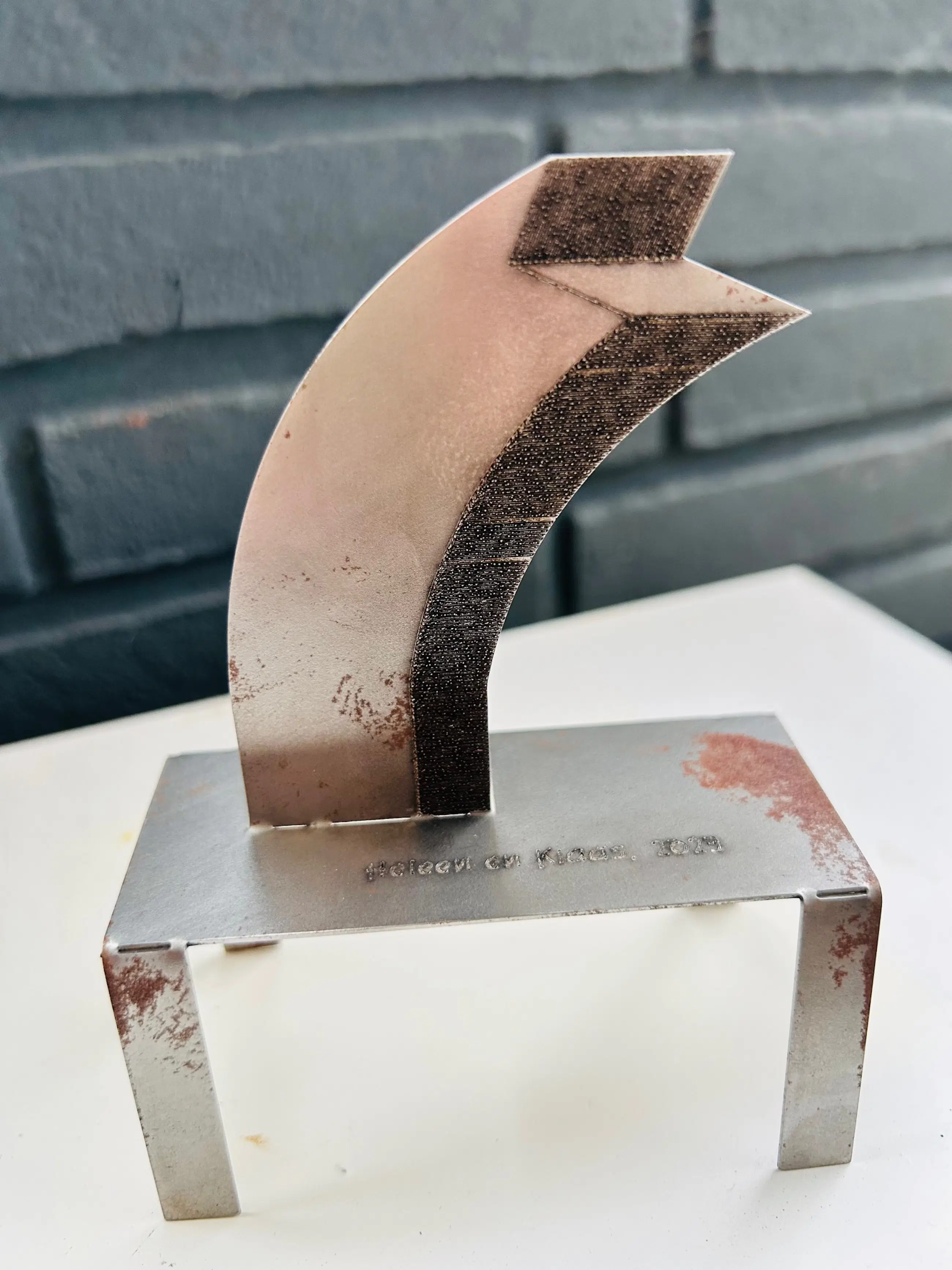 (T) uiteinde is een fraai ijzeren object van Klaas Gubbels. Klaas schilderde het hart rood en naast de gestanste naam ook met viltstift op de bodemplaat. Klein maar fijn! Jaarlijks maakt Klaas zo'n klein object in een zeer beperkte oplage. Vaak ruimtelijke miniaturen van bestaand werk. Dit ijzeren beeldje is 14cm hoog. Het beeldje is op de voet gesigneerd KG in de tafelpoot en aan de achterkant van de lippen 2016..