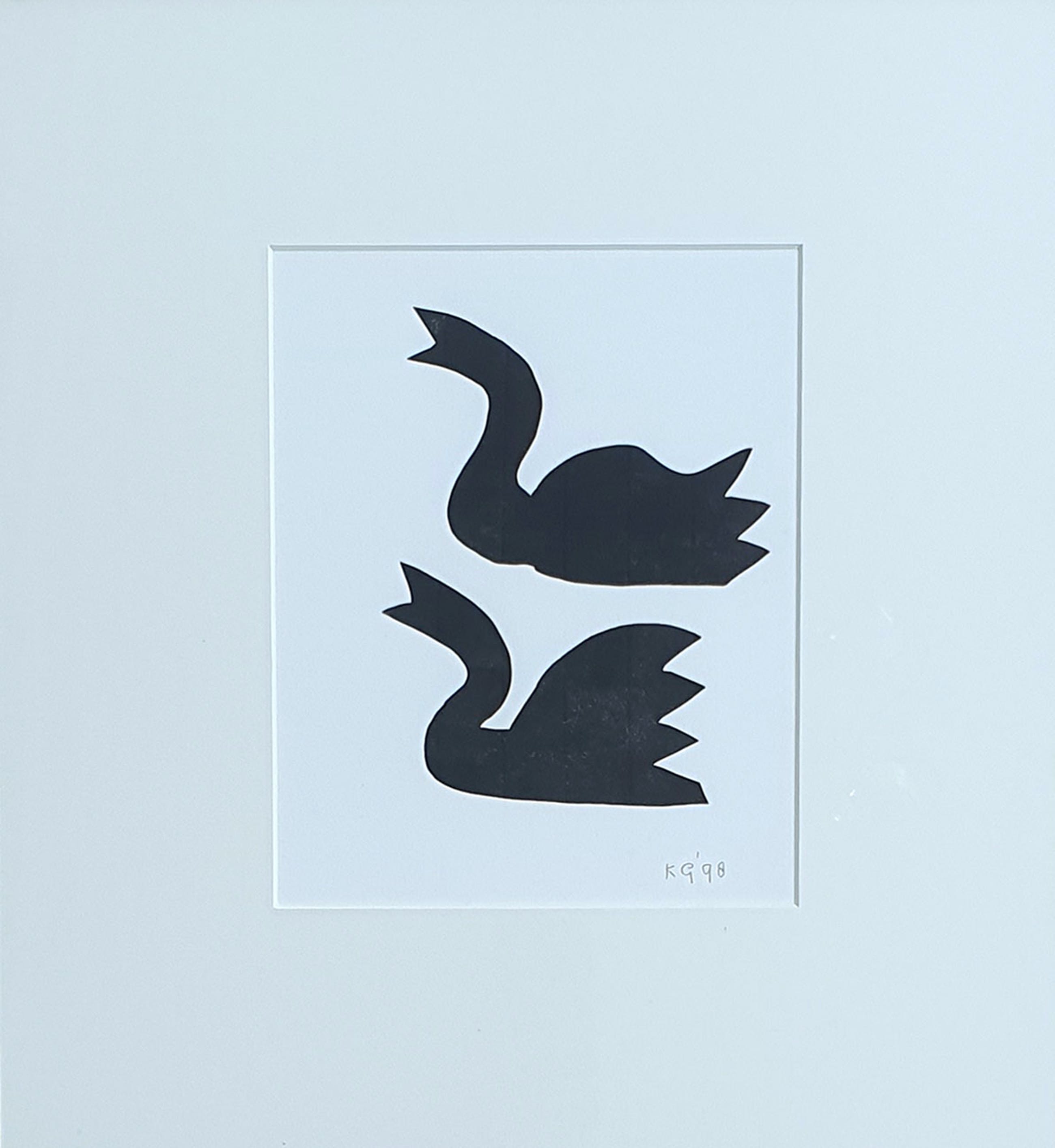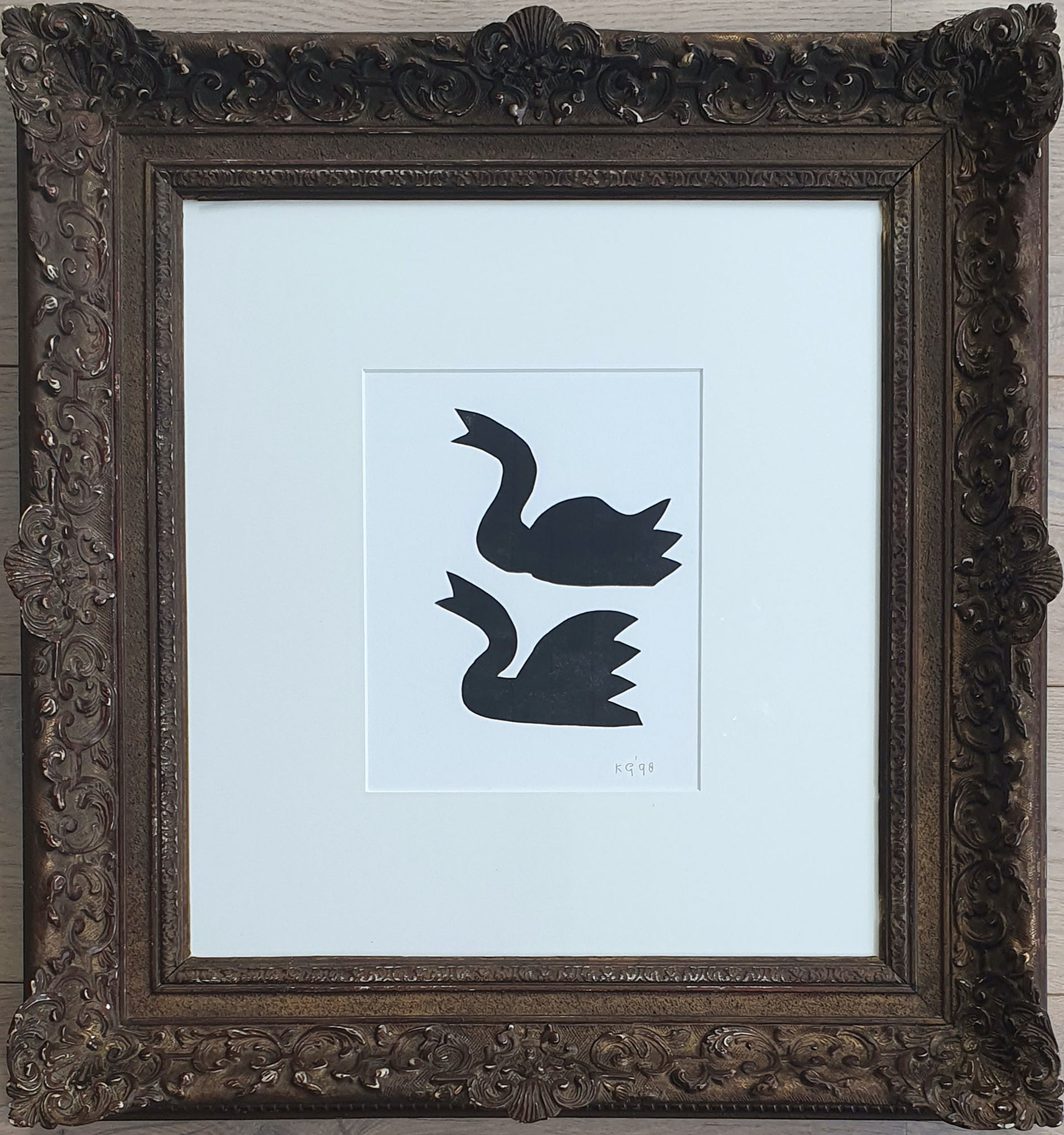 Fraaie sjabloondruk van Klaas Gubbels uit 1998. Het werk is in 2007 voorzien van een boodschap (onder het passe partout) en is rechtsonder met de hand gesigneerd door de kunstenaar.