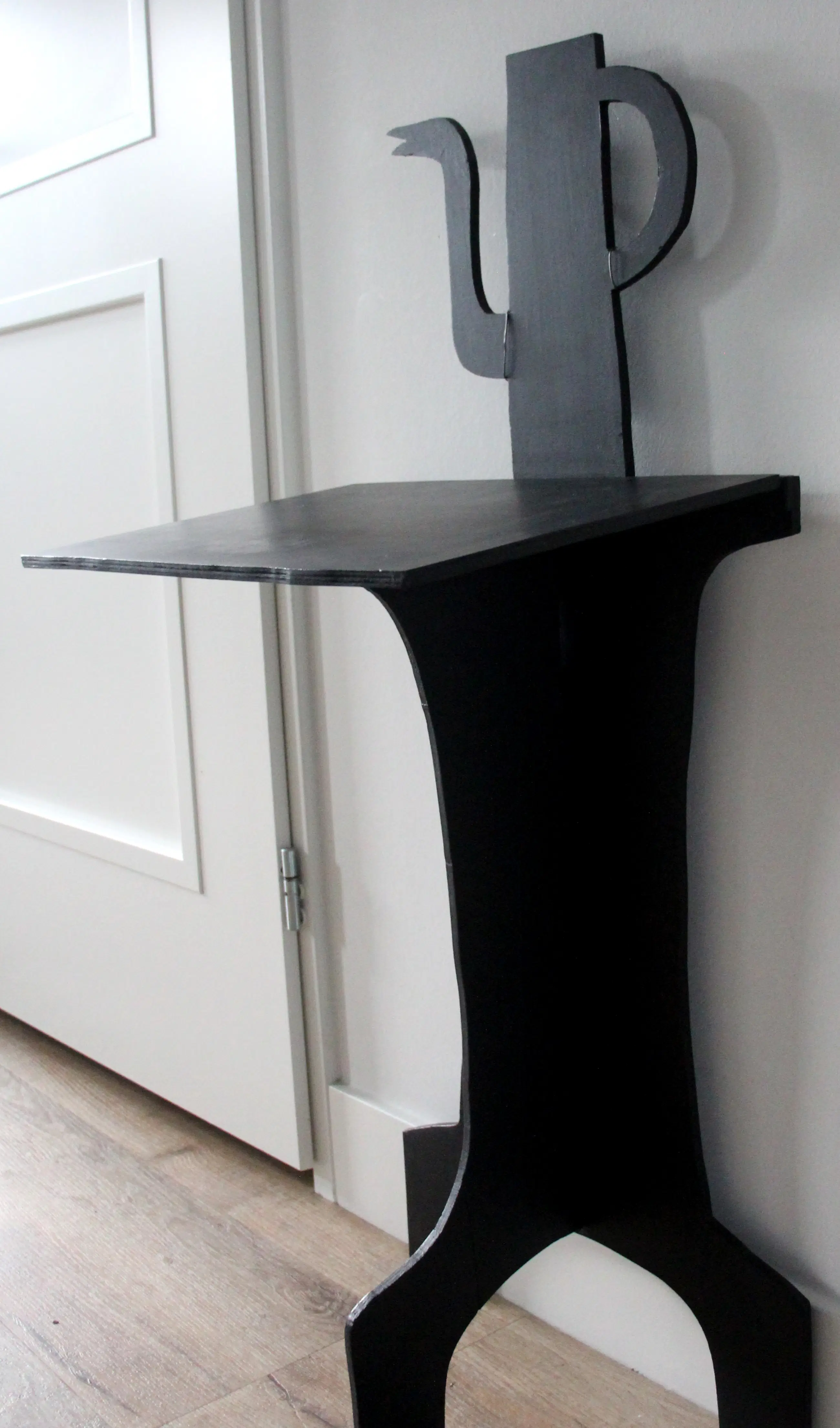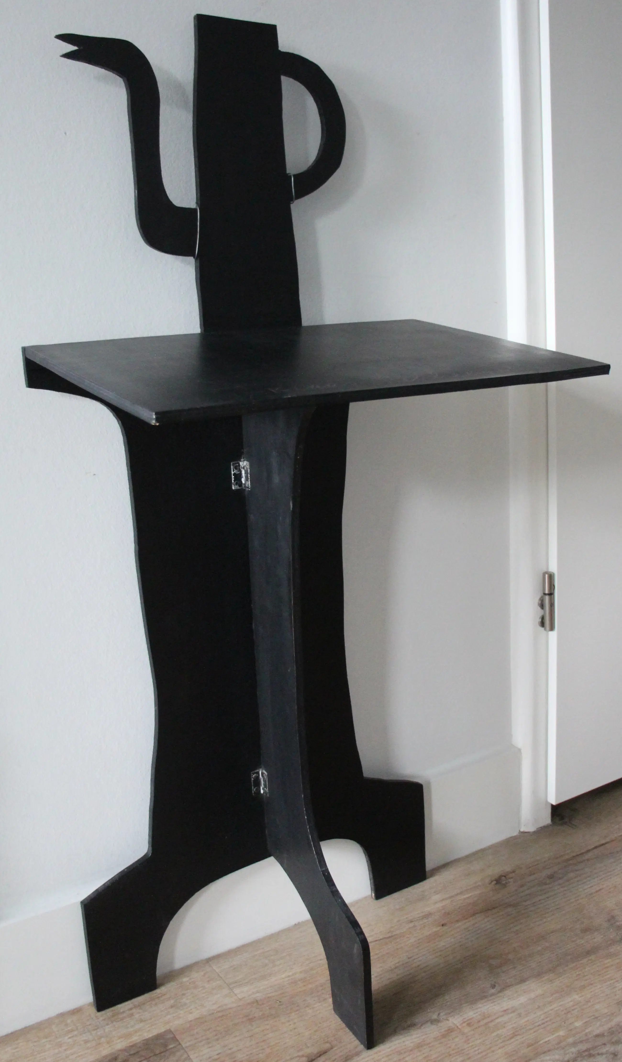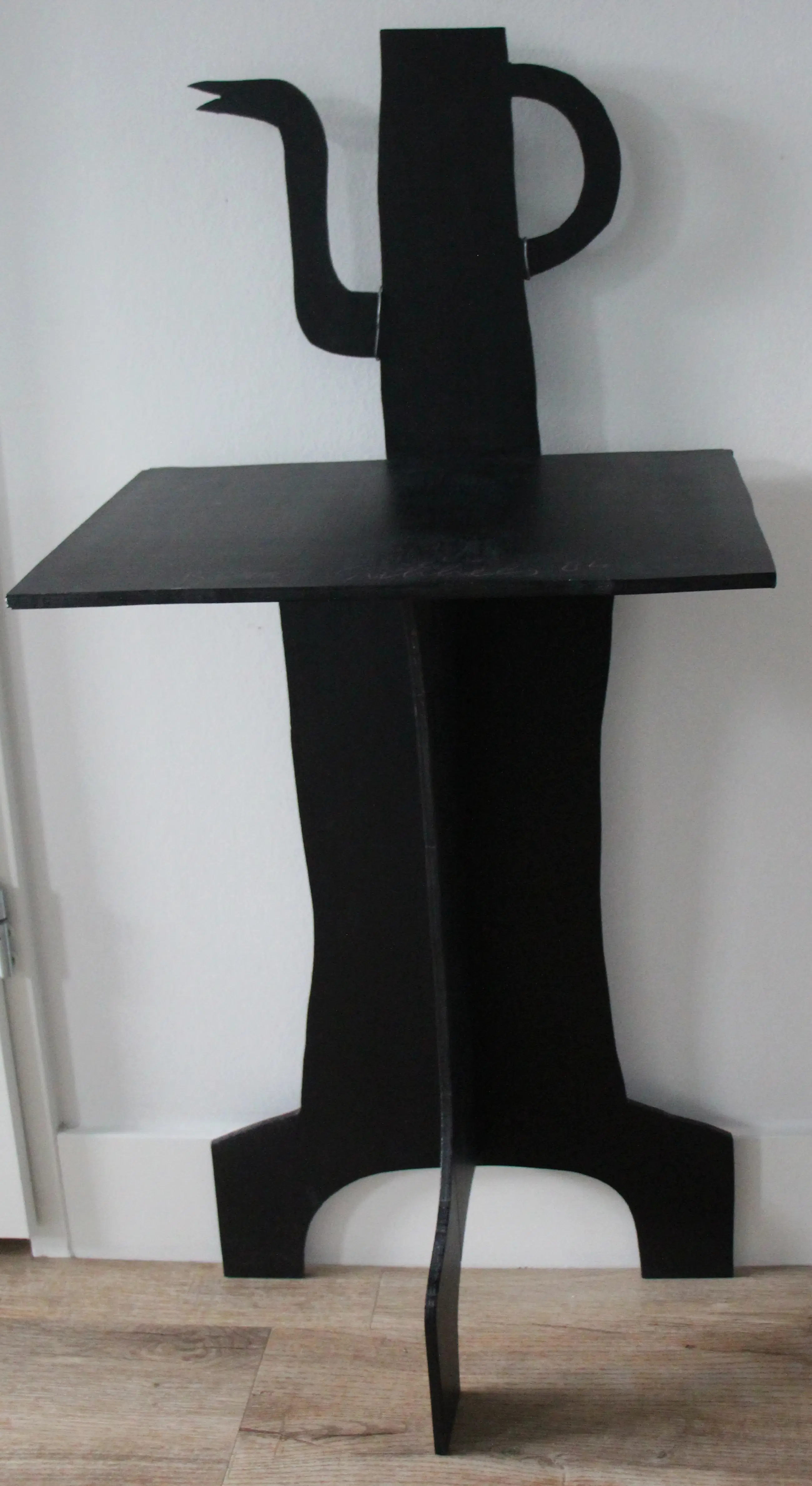 Uitklapbare, door Klaas Gubbels vervaardigde tafel van multiplex. Op de tafel staat een uitgezaagde kan (zit vast aan tafel). Afmetingen: H92 x b40 x d29 cm. Op de bovenzijde van de tafel gesigneerd en gedateerd. De authenticiteit van het aangeboden werk wordt volledig gegarandeerd. Een certificaat van echtheid kan, op aanvraag, worden gemaild.