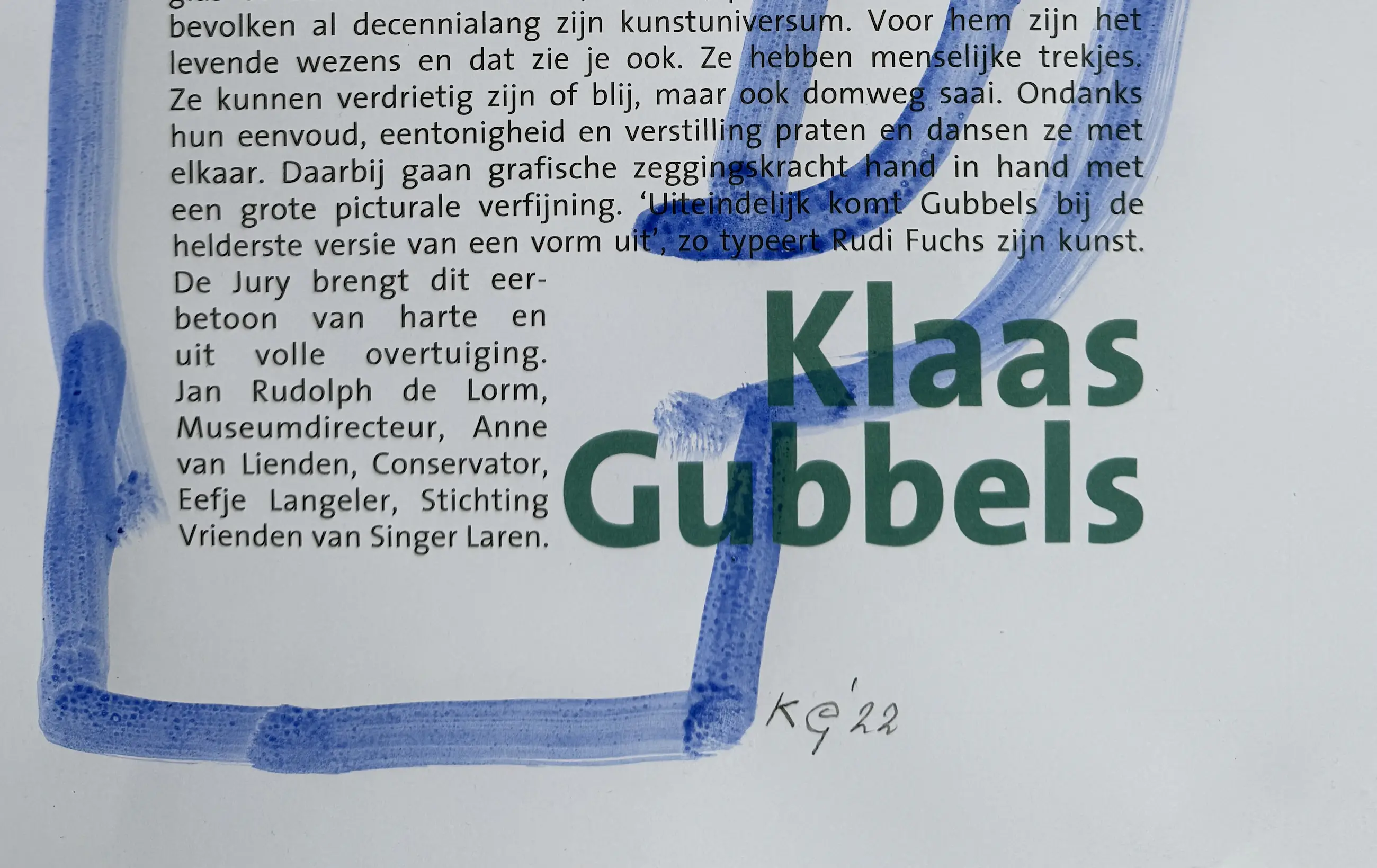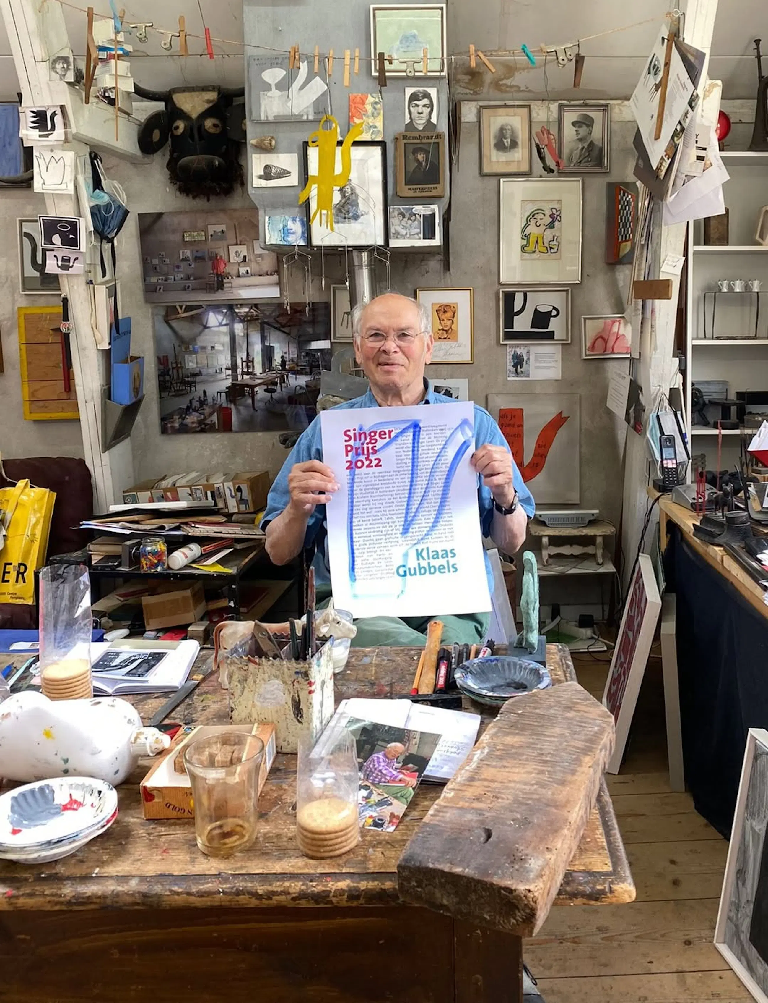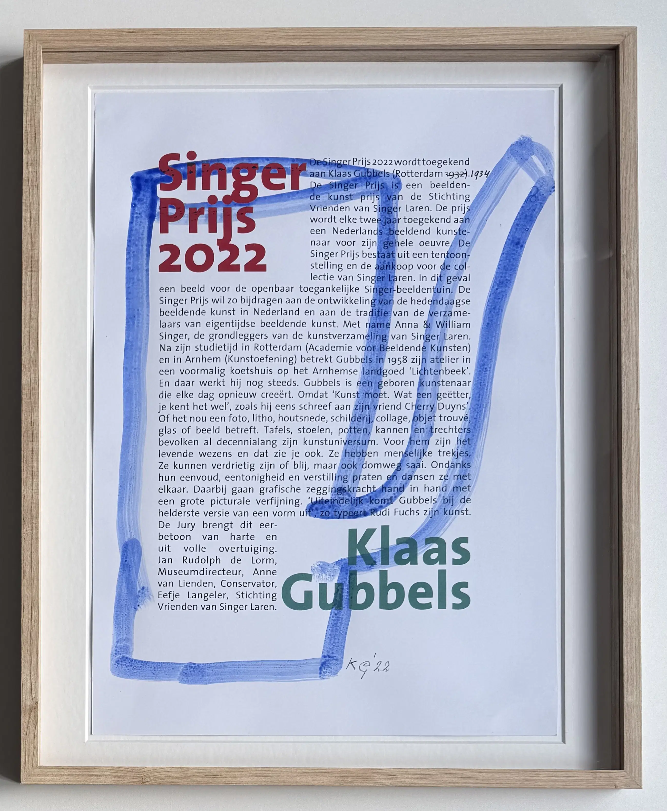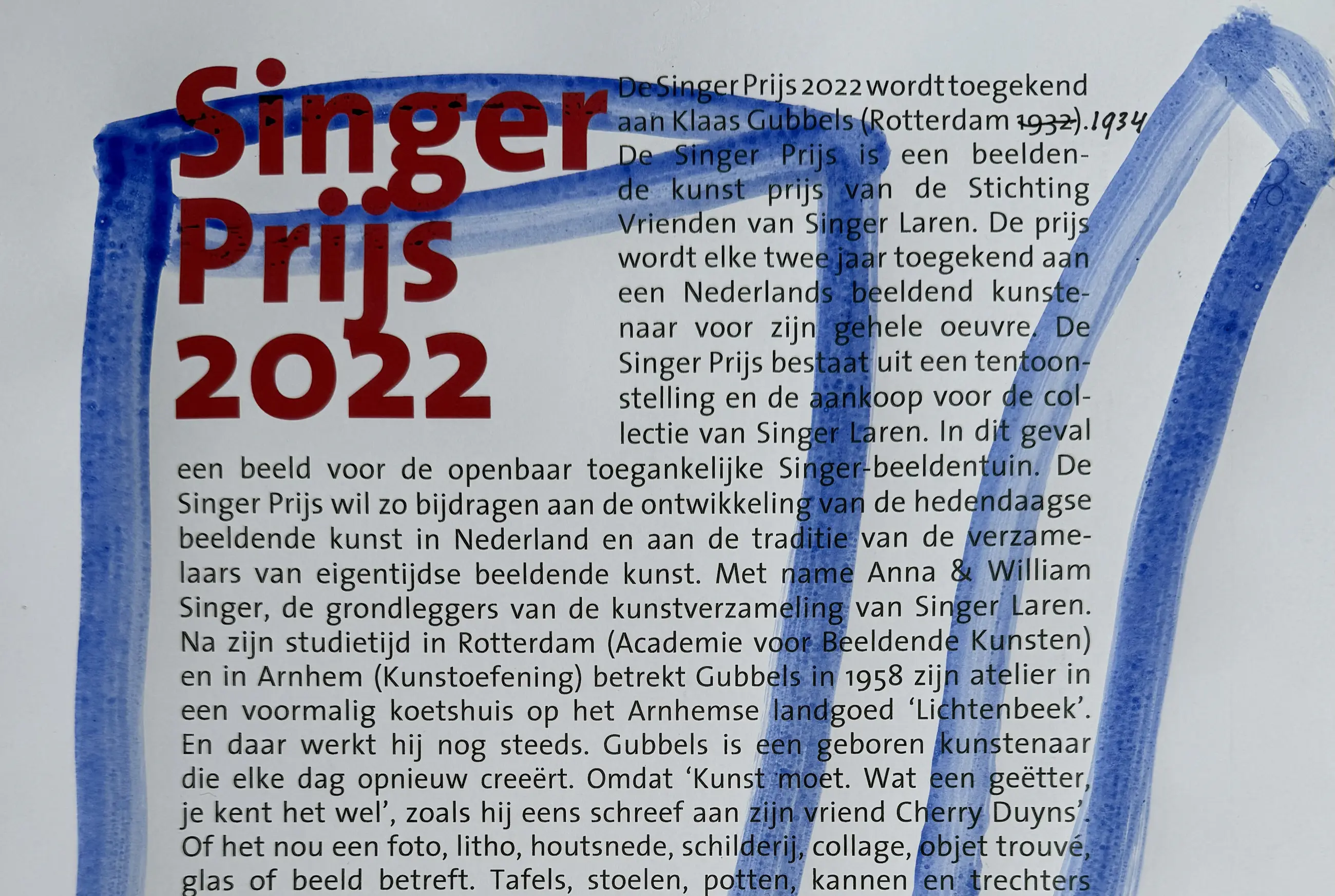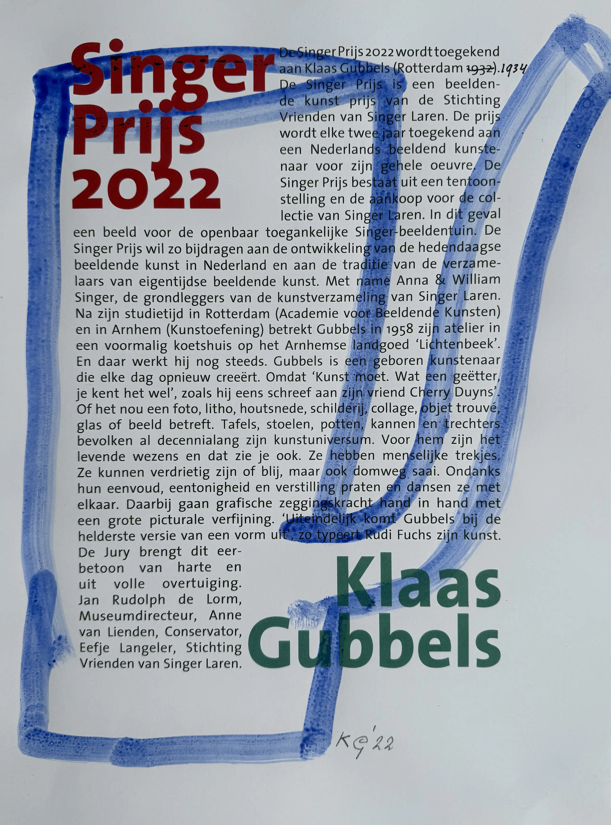 'De Singer Prijs 2022 wordt toegekende aan Klaas Gubbels (Rotterdam 1932). De Singer Prijs is een beeldende kunst prijs van de Stichting Vrienden van Singer Laren. De prijs wordt elke twee jaar toegekend aan een Nederlands beelden kunstenaar voor zijn gehele oeuvre. De Singer Prijs bestaat uit een tentoonstelling en de aankoop voor de collectie van Singer Laren. In dit geval een beeld voor de openbaar toegankelijke Singer-beeldentuin. De Singer Prijs wil zo bijdragen aan de ontwikkeling van de hedendaagse beeldende kunst in Nederland en aan de traditie van de verzamelaars va eigentijdse beeldende kunst. Met name Anna & William Singer, de grondleggers van de kunstverzameling van Singer Laren. Na zijn studietijd in Rotterdam (Academie voor Beeldende Kunsten) en in Arnhem (Kunstoefening) betrekt Gubbels in 1958 zijn atelier in een voormalig koetshuis op het Arnhemse landgoed 'Lichtenbeek'. En daar werkt hij nog steeds. Gubbels is een geboren kunstenaar die elke dag opnieuw creërt. Omdat 'Kunst moet. Wat win geëtter, je kent het wel', zoals hij eens schreef aan zijn vriend Cherry Duins. Of het nou een foto, litho, houtsnede, schilderij, collage, object trouvé, glas of beeld betreft. Tafels, stoelen, potten kannen en trechters bevolken al decennialang zijn kunstuniversum. Voor hem zij het levende wezens en dat zie je ook. Ze hebben menselijke trekjes. Ze kunnen verdrietig zijn of blij, maar ook domweg saai. Ondanks hun eenvoud, eentonigheid en verstilling praten en dansen ze met elkaar. Daarbij gaan grafische zeggingskracht hand in hand met een grote picturale verfijning. 'Uiteindelijk komt Gubbels bij de helderste versie van een vorm uit', zo typeert Rudi Fuchs zijn kunst, De Jury brengt dit eerbetoon van harte en uit volle overtuiging. Jan Rudolph de Lorm, Museumdirecteur, Anne van Lienden, Conservator, Eefje Langeler, Stichting Vrienden van Singer Laren.