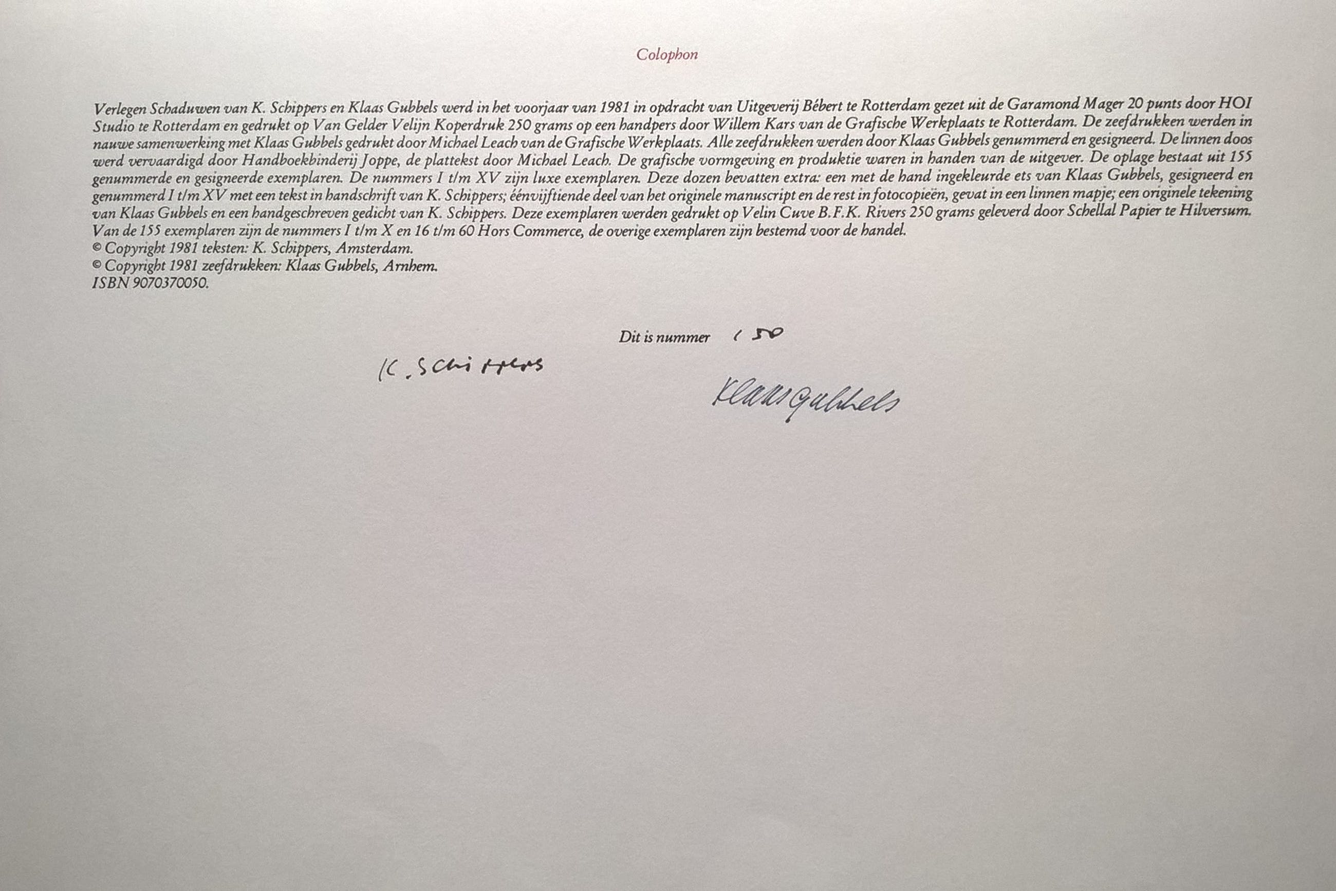 teksten van K. Schippers uit 1981. Door beide in de colophon gesigneerd. Alle 9