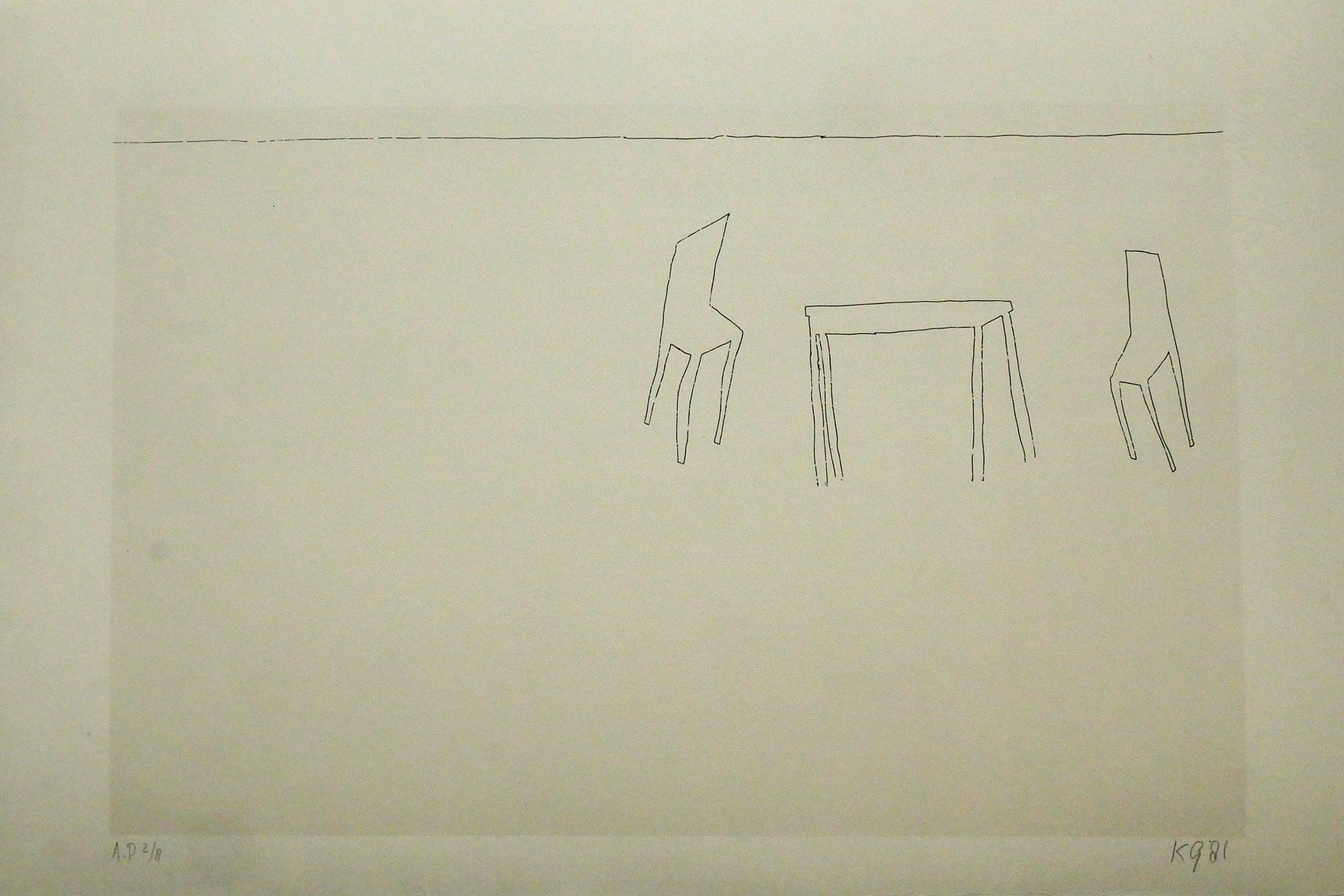 Klaas Gubbels Gesigneerd en gedateerd met potlood. De opgegeven maten zijn de maten van de zeefdruk Met een gedicht van K. Schippers