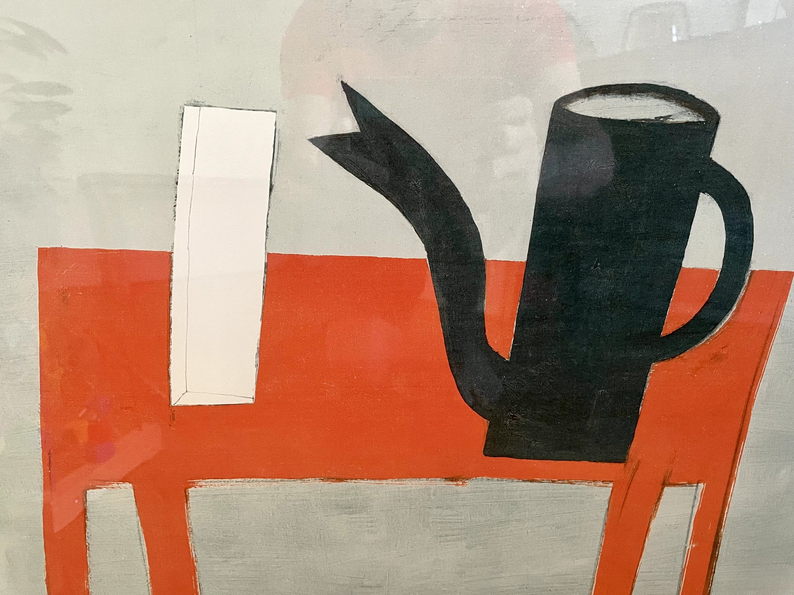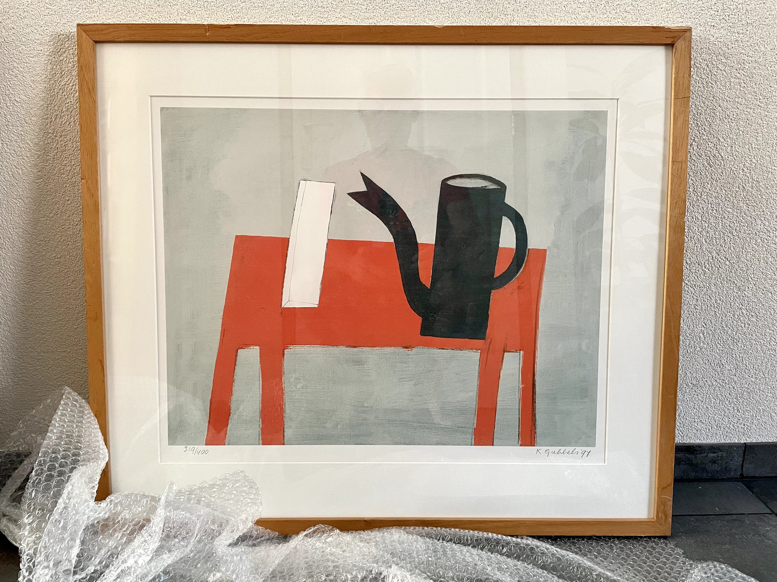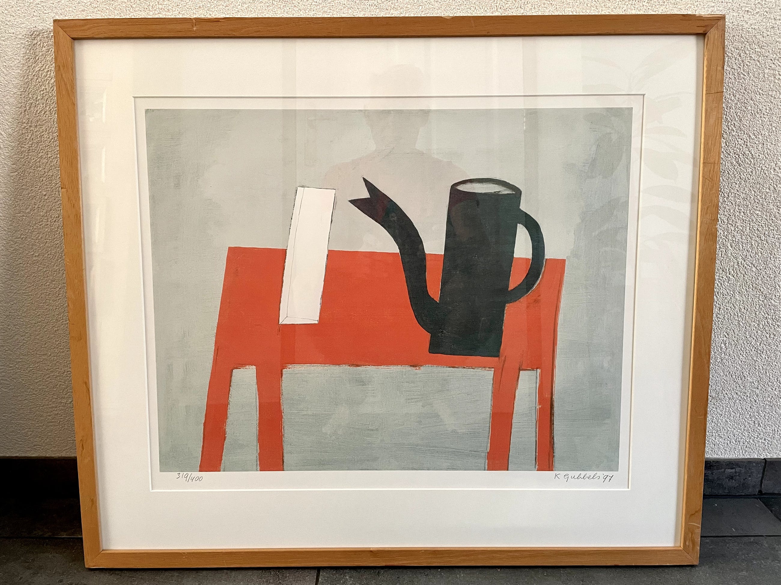 Klaas Gubbels - Witte kan op Oranje tafel - Nr 147 In de bekende Klaas Gubbels stijl, uitgevoerd met prachtige kleuren. Het werk is ingelijst in een stevige originele baklijst. Het werk is komt uit 1997 en is in goede staat. Het werk is voorzien van een nieuwe passe-partout. Dit is gedaan door lijstenmakerij Dalenman uit Leiden.