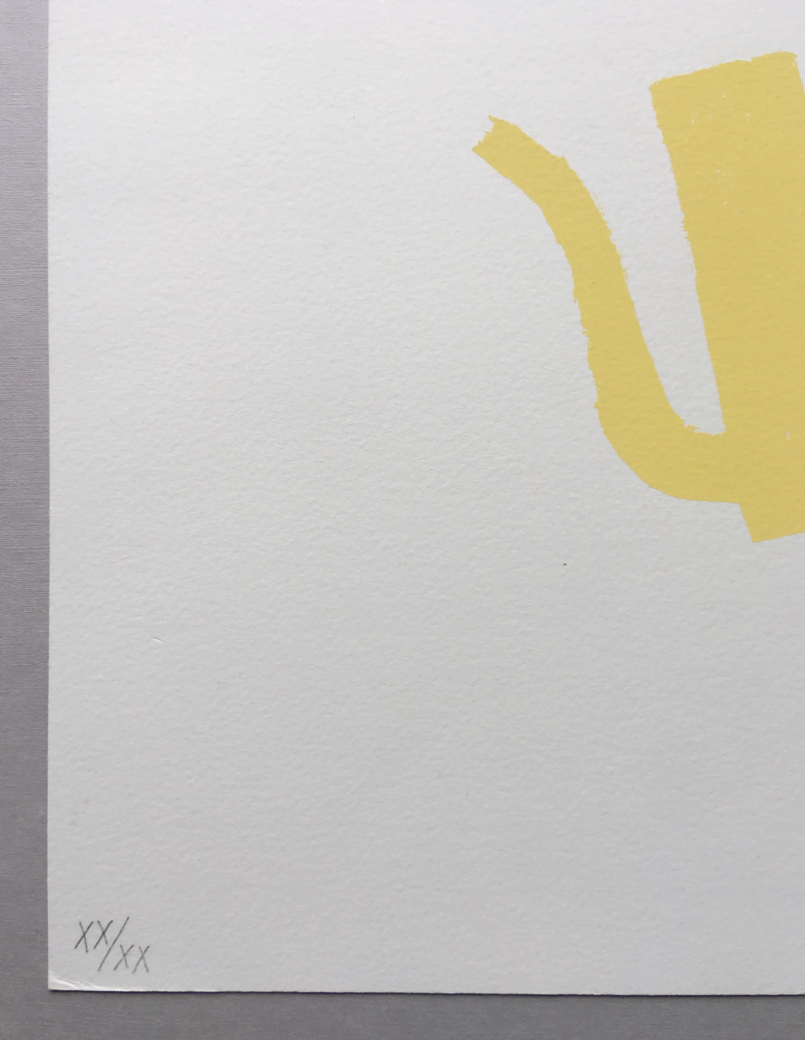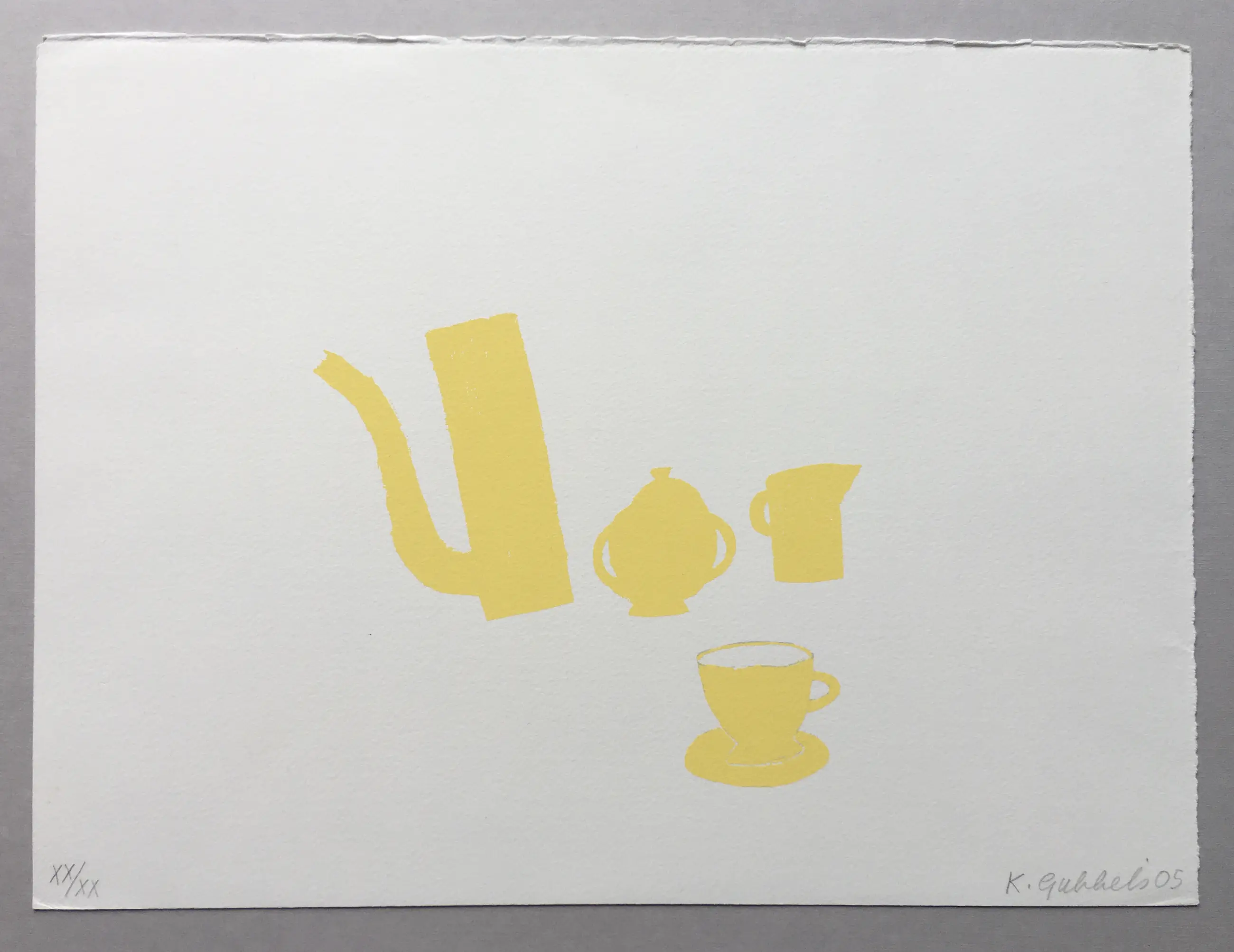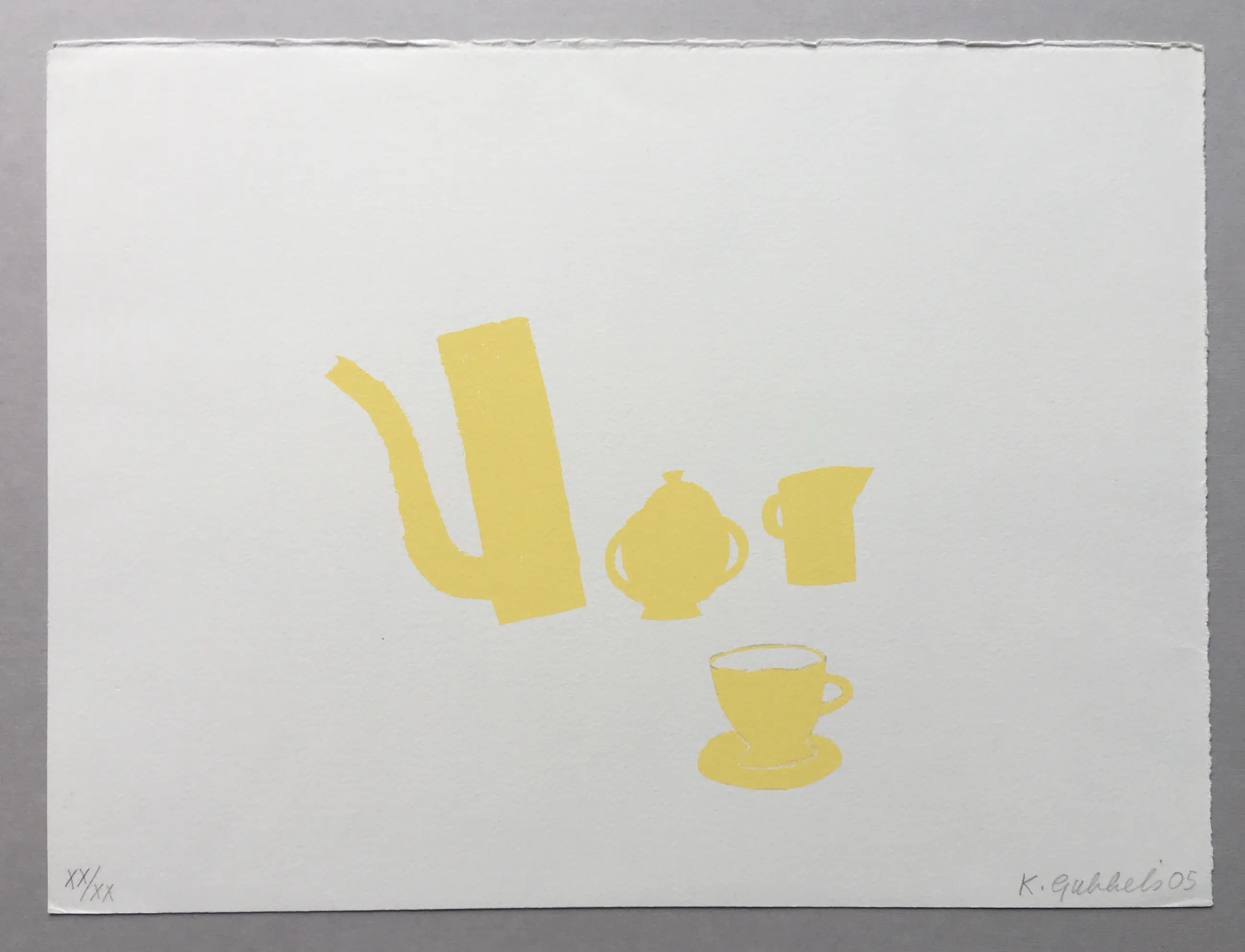 Een fraaie zeefdruk van Klaas Gubbels uit 2005 ‘Geel Servies’. Het werk is gesigneerd en genummerd, oplage XX. De zeefdruk is in zeer goede conditie.