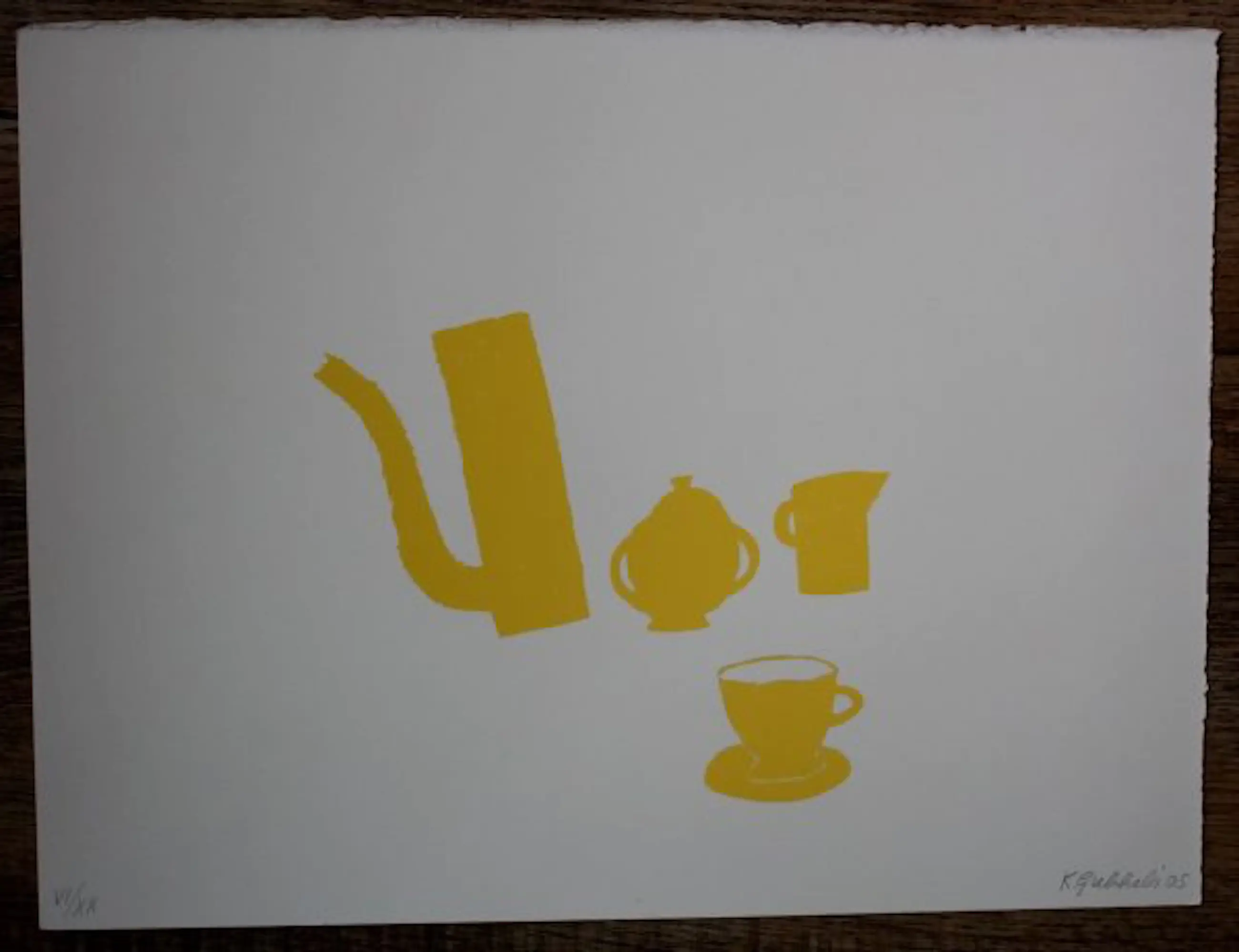 Zeefdruk van Klaas Gubbels. Titel: Kannen en kopje geel. Jaar: 2005. Oplage: VI/XX. Afmetingen werk: H21 x b16cm, afmetingen voorstelling: H12.5 x b7.5cm.