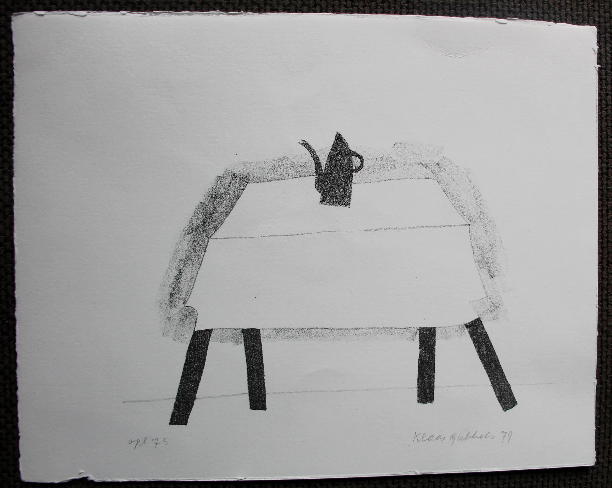 Zeefdruk van Klaas Gubbels uit 1979. Koffiekan op tafel. Oplage: 75. Afmetingen blad: H26 x b33cm. Afmetingen voorstelling: H16 x b24.5cm. Het werk is, rechts onderaan, gesigneerd door de kunstenaar. De authenticiteit van het aangeboden werk wordt volledig gegarandeerd. Een certificaat van echtheid kan, op aanvraag worden gemaild.