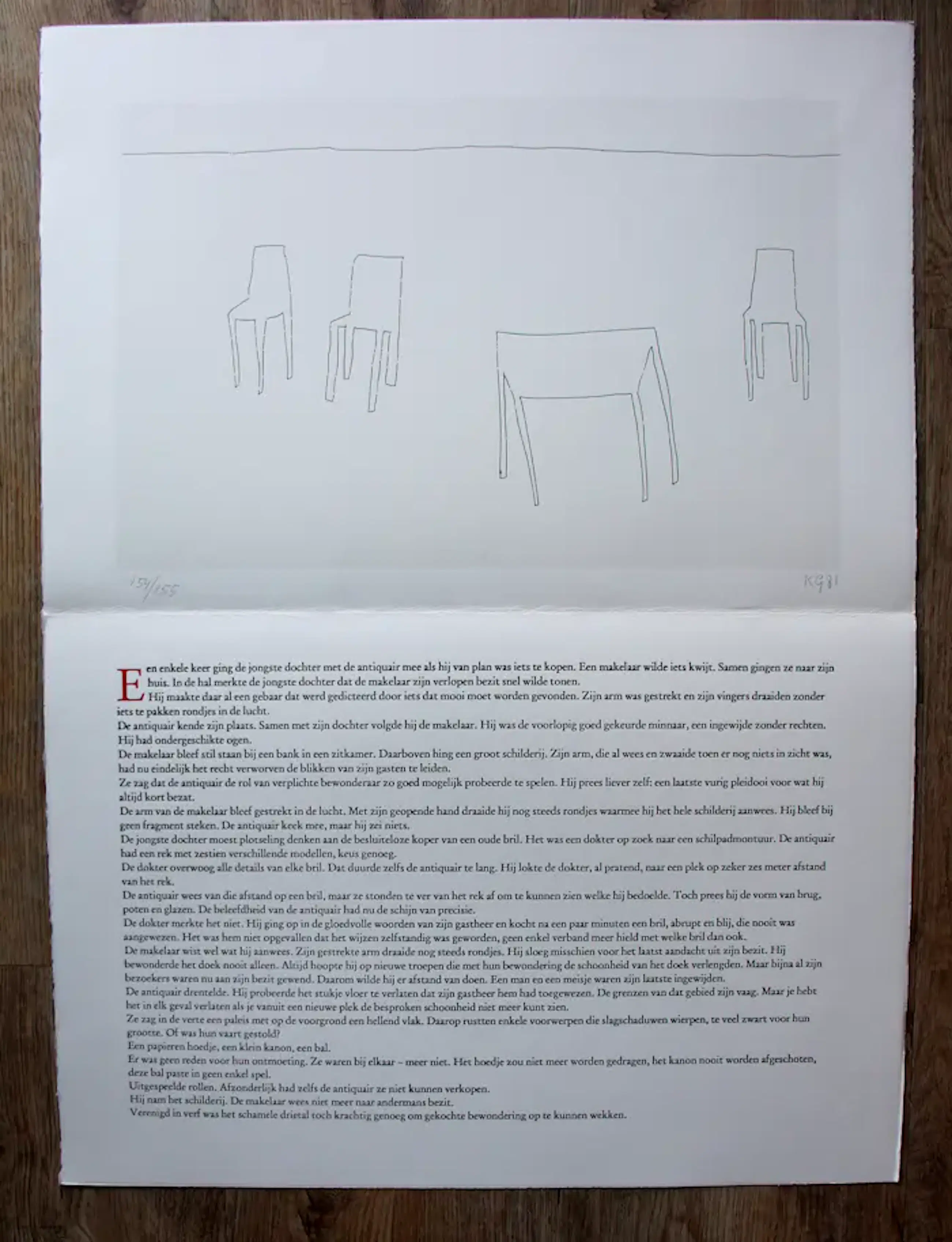 Zeefdruk van Klaas Gubbels met tekstblad van K. Schippers. Jaar: 1981. Nummer: 154/155. Afmetingen inclusief tekstblad: H76 x b56cm. Afmetingen zeefdruk blad: H56 x b38 cm. Afmetingen voorstelling: H14 x b38 cm. Dit werk komt uit de map "Verlegen schaduwen". Uitgegeven door Bebert. Gedrukt op Van Gelder Velijn koperdruk 250 grams papier. Het werk is rechtsonder gesigneerd en gedateerd in potlood door de kunstenaar. De authenticiteit van dit werk wordt volledig gegarandeerd. Een certificaat van echtheid kan, op verzoek, worden gemaild.