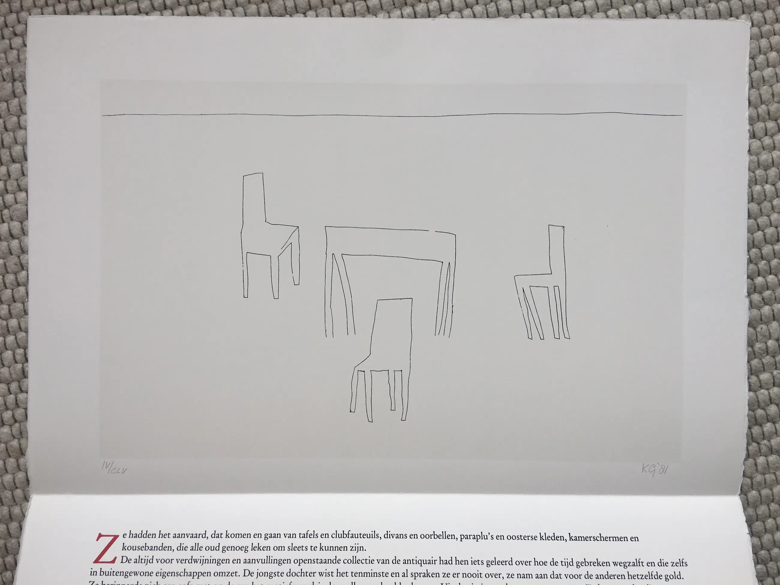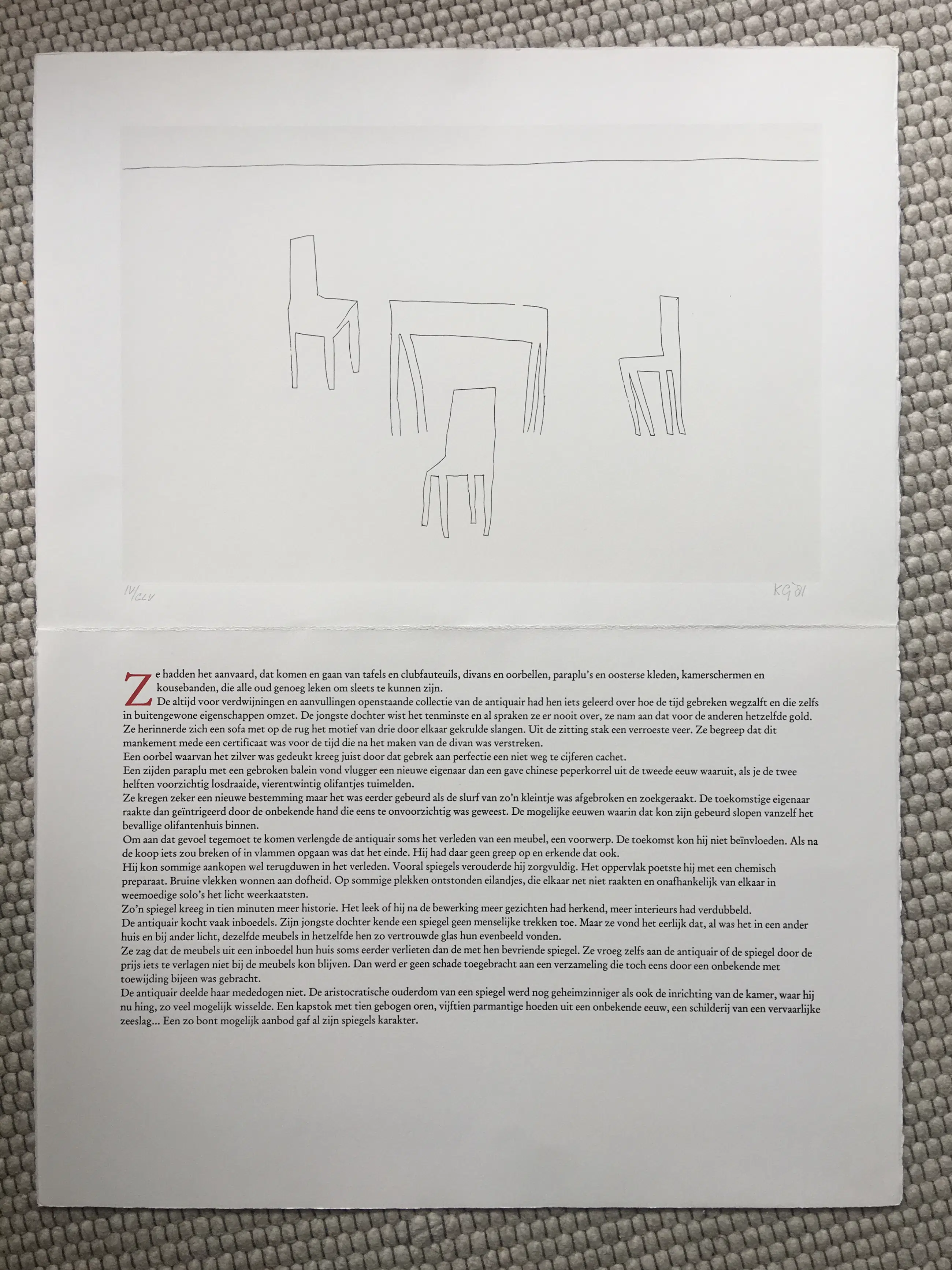 Tijdloos werk van Klaas Gubbels uit 1981. Het werk is gesigneerd en genummerd, oplage CLV. Totale afmeting inc, tekstblad; 76 x 57 cm.