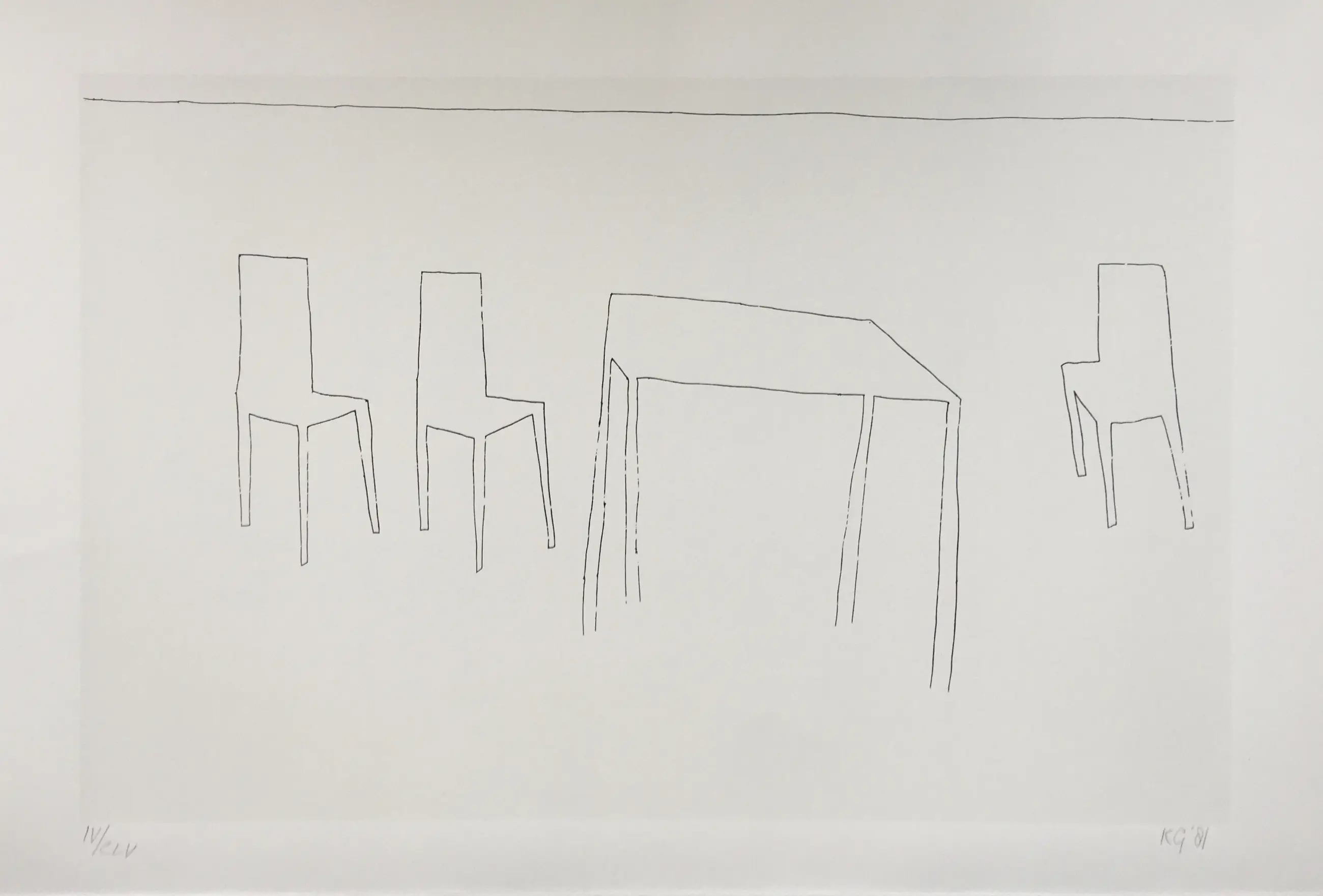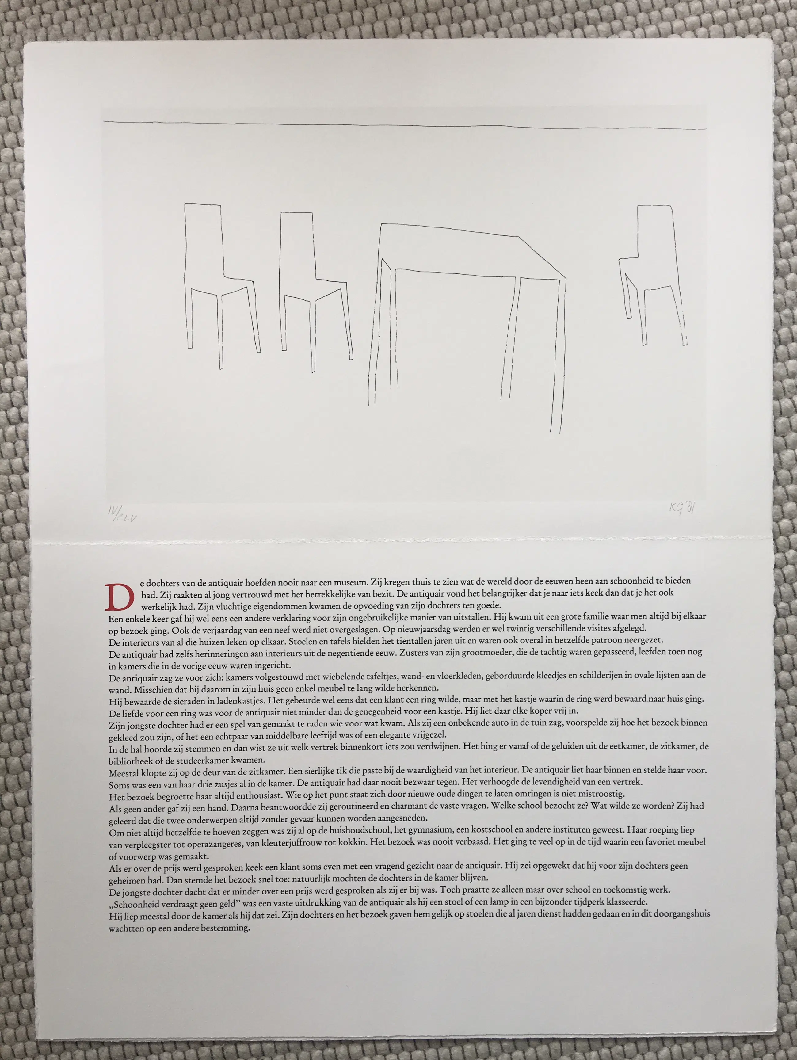 Tijdloos werk van Klaas Gubbels uit 1981. Het werk is gesigneerd en genummerd, oplage CLV. Totale afmeting inc, tekstblad; 76 x 57 cm.