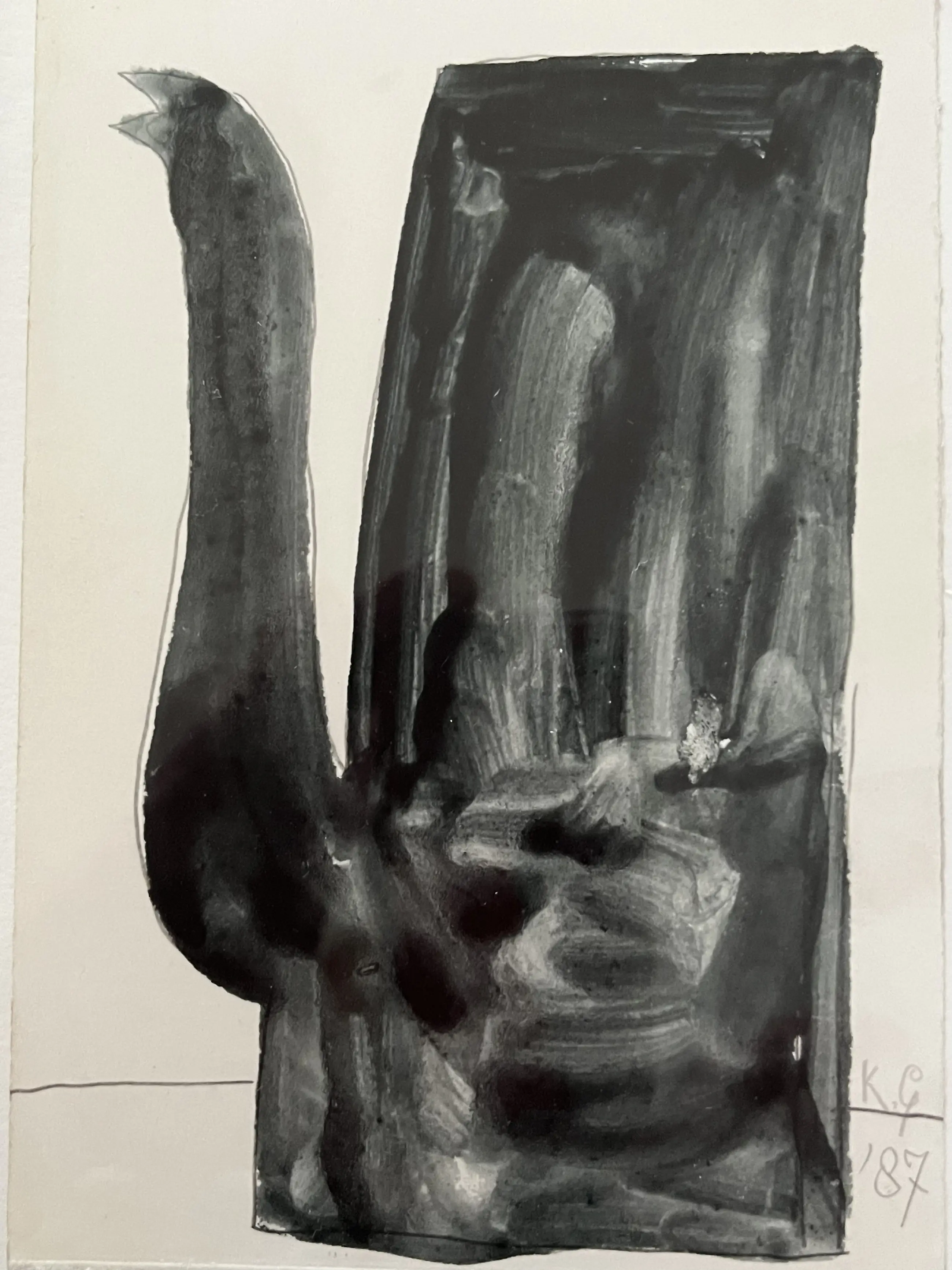 Karakteristiek werk, zowel wat onderwerp als materiaalgebruik. Klein, maar sterk kunstwerkje. De kan “staat” er. Afmeting aquarel 16 x 11 cm. Inclusief witgewassen houten lijst 42 x 32 cm.