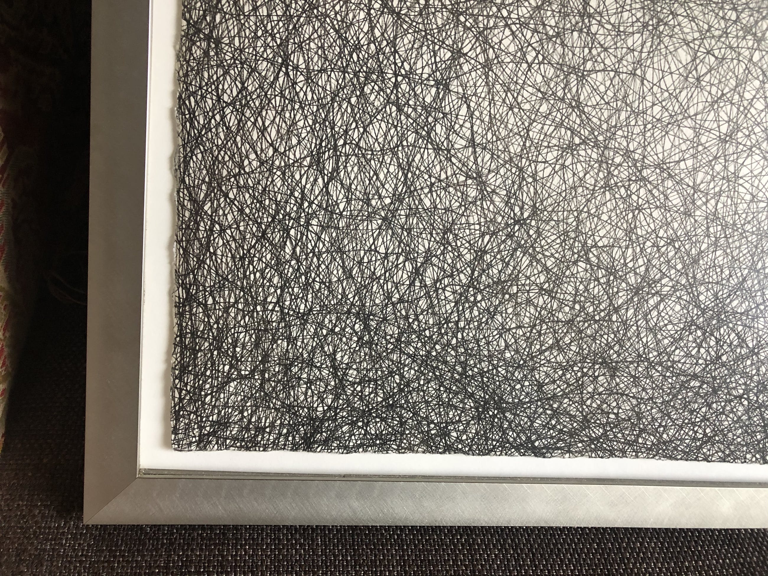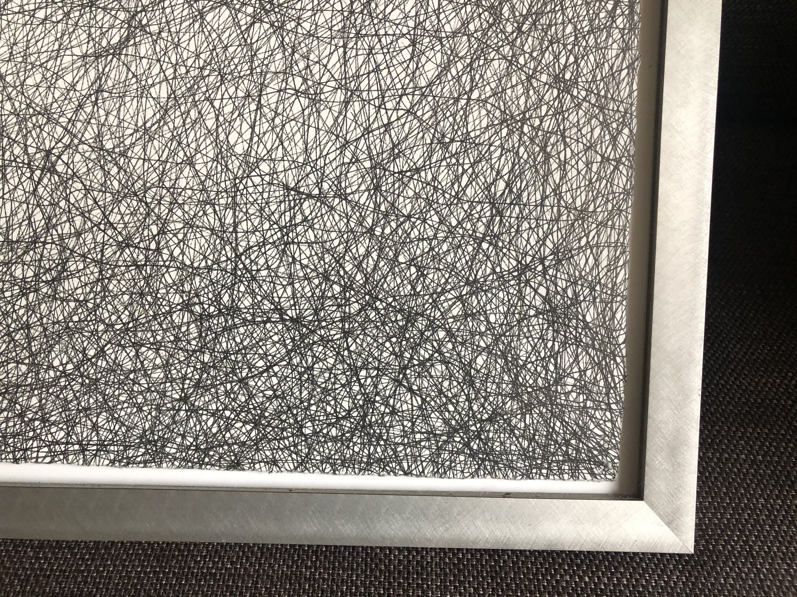 Dit lijnenspel kan zowel horizontaal ('landscape') als verticaal ('portrait') worden opgehangen, zo is te zien aan het dubbele ophangsysteem achterop - zie foto.