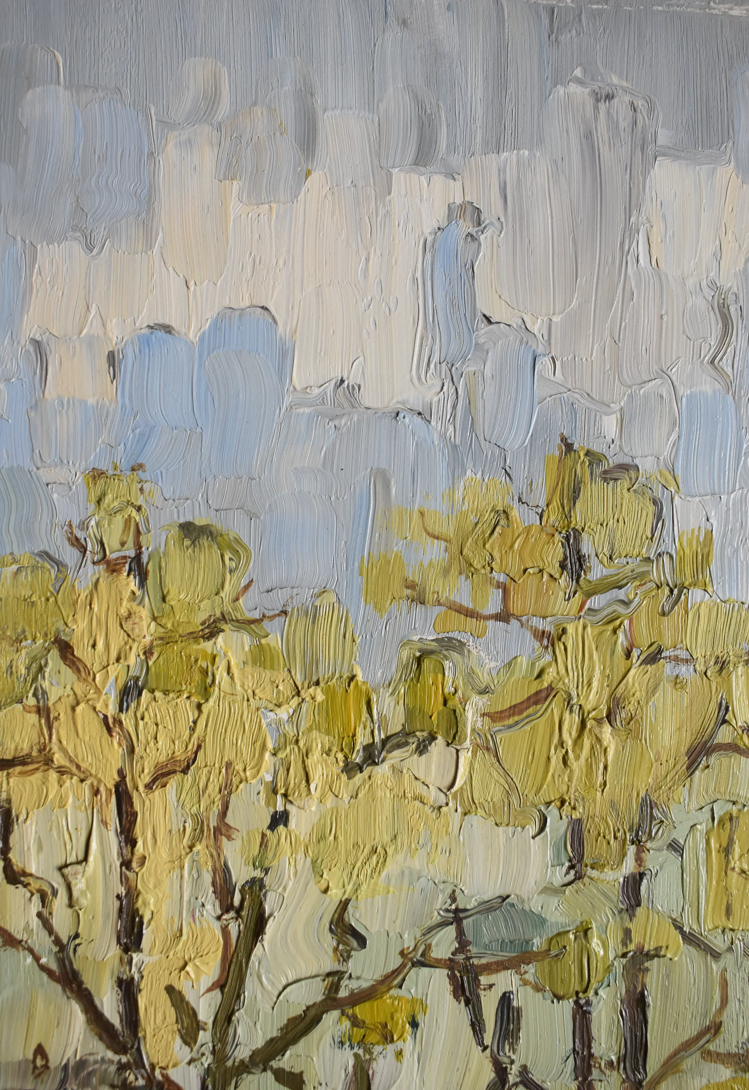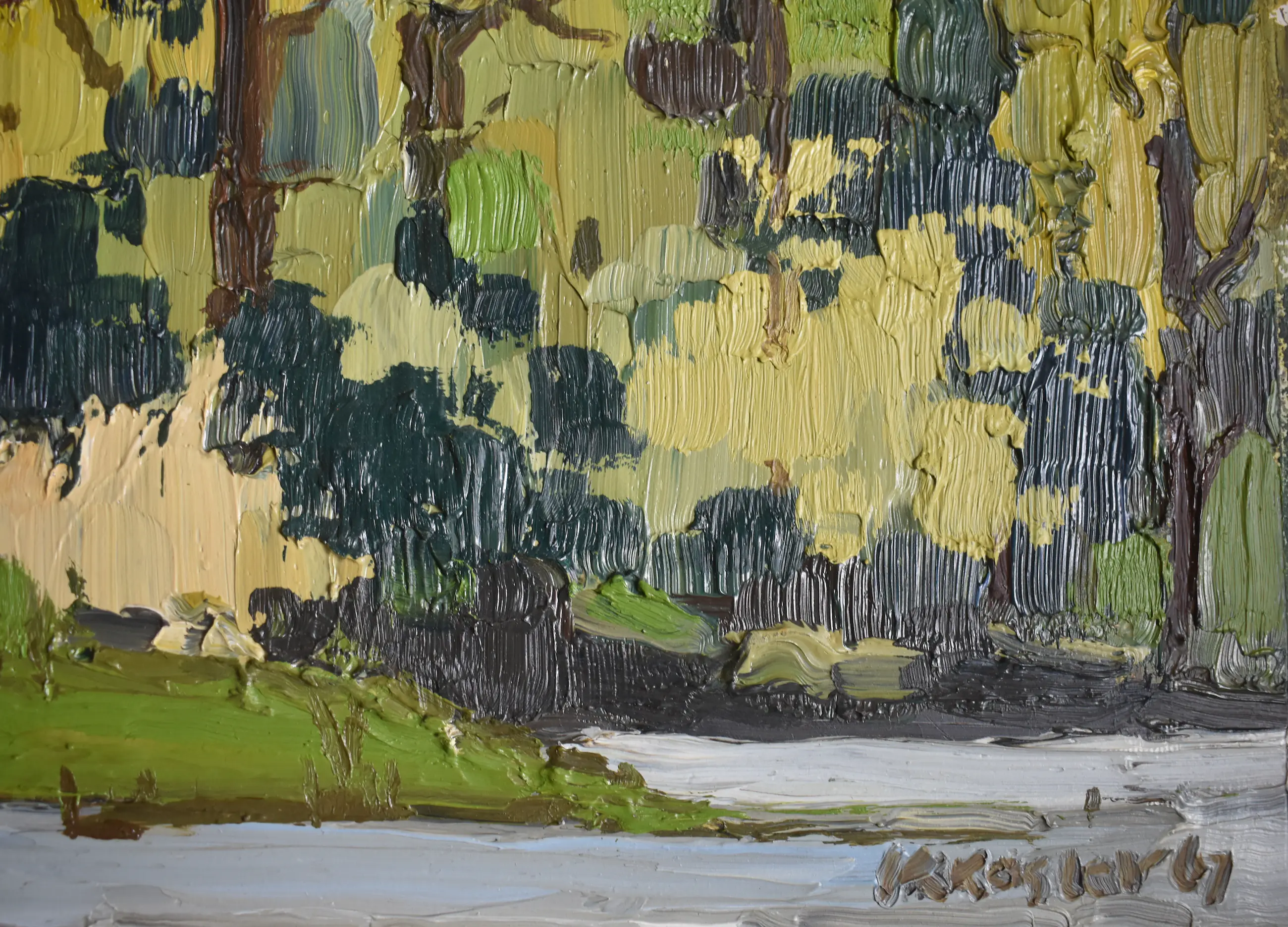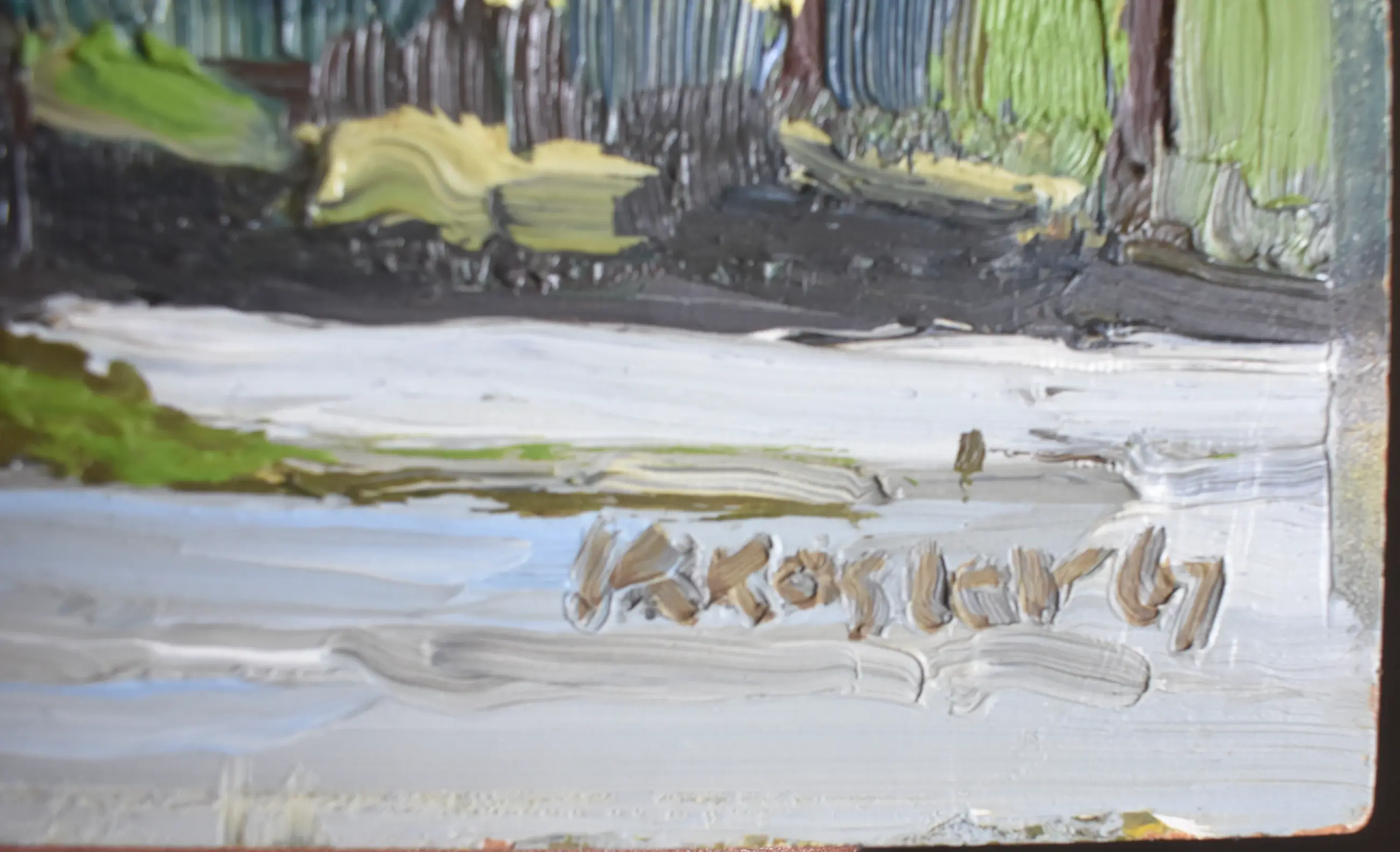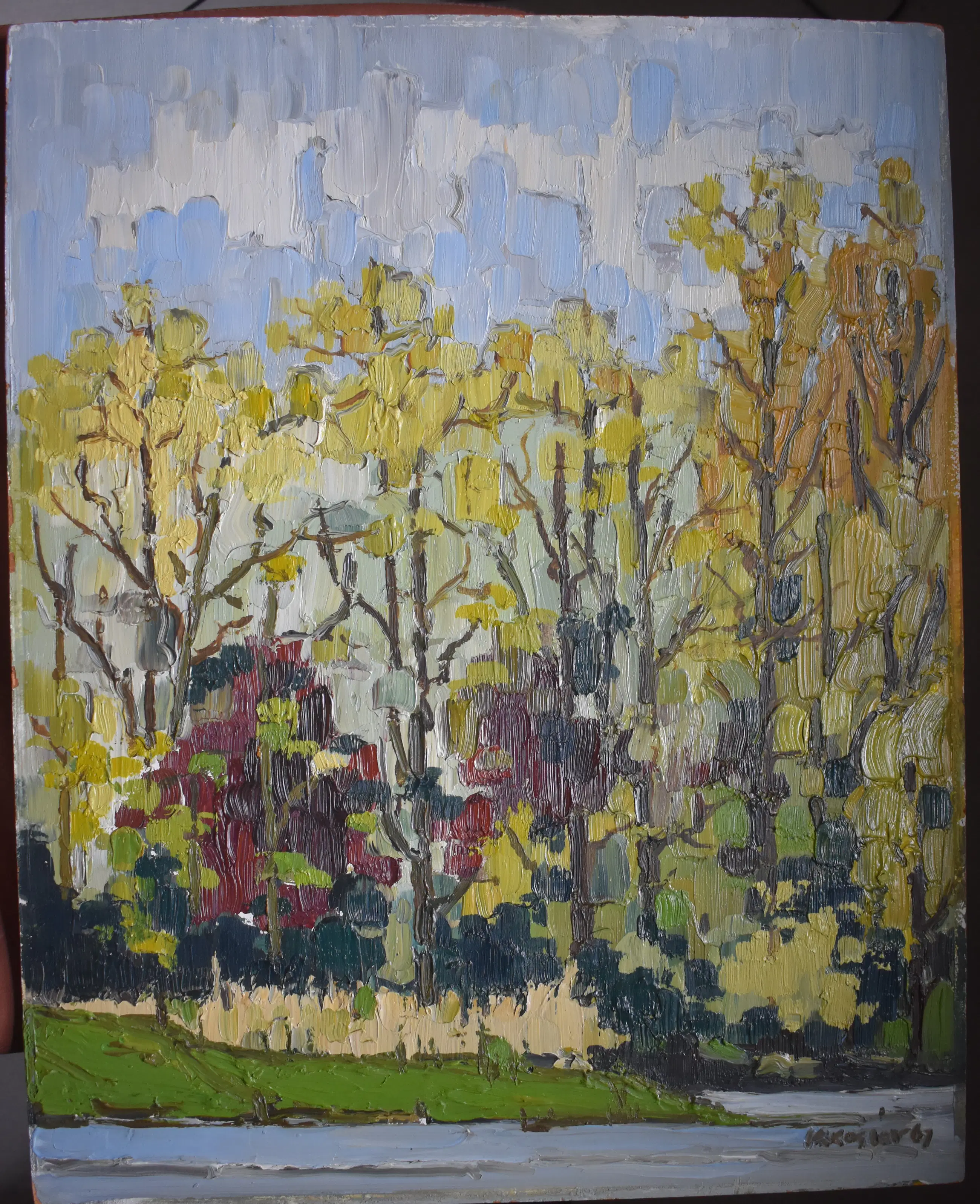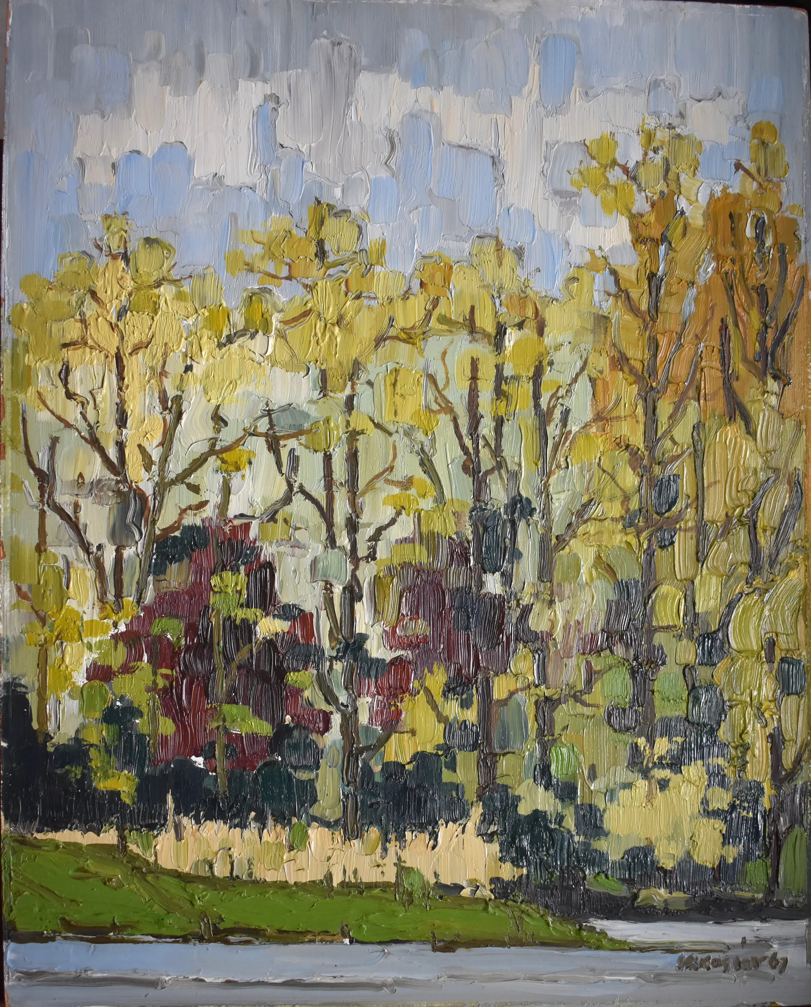 Klaas Koster werkte in 1967 in Dordrecht. Mogelijk is dit herstgezicht daar gemaakt. Hij gebruikte fraaie verfstreken gecombineerd met paletmes. Dit werk is 100 % onbeschadigd en sterk van uitstraling. Professioneel schilderpaneel. Heeft een mooie lijst nodig, standaard maat 50x40 cm.