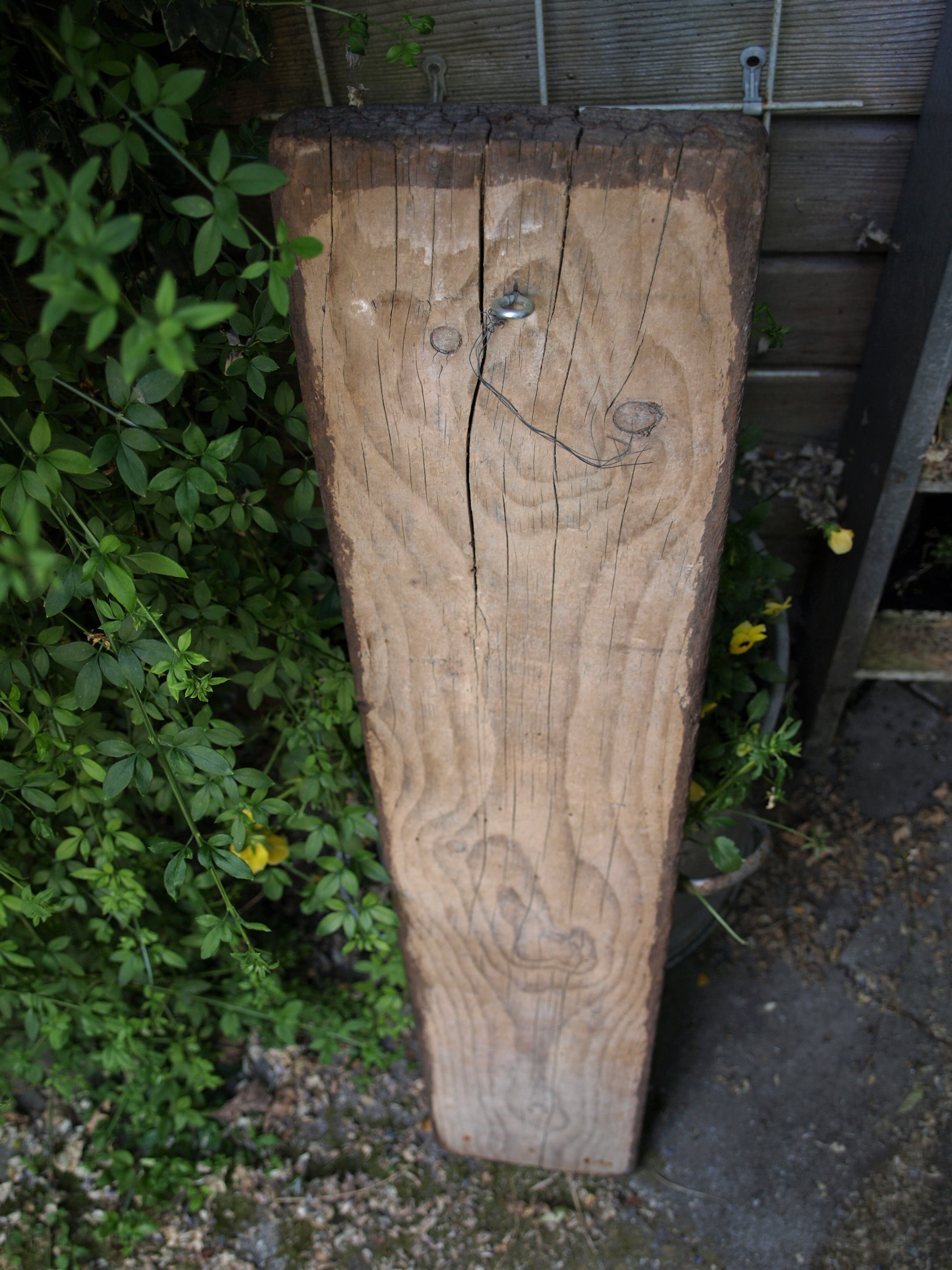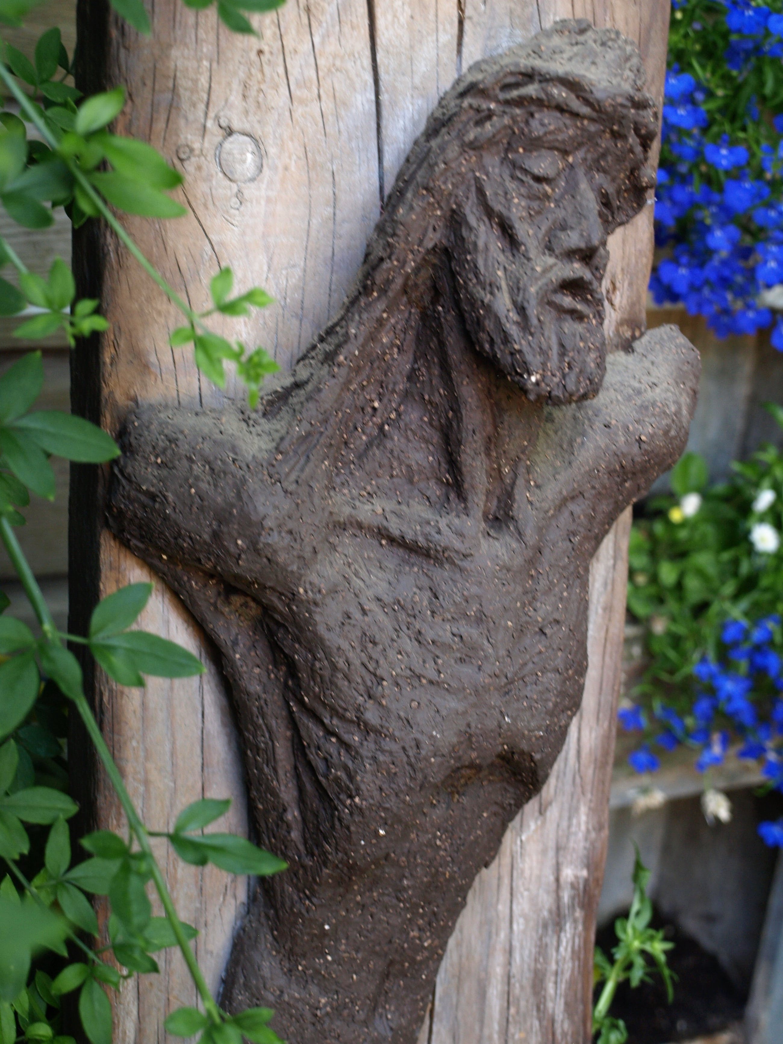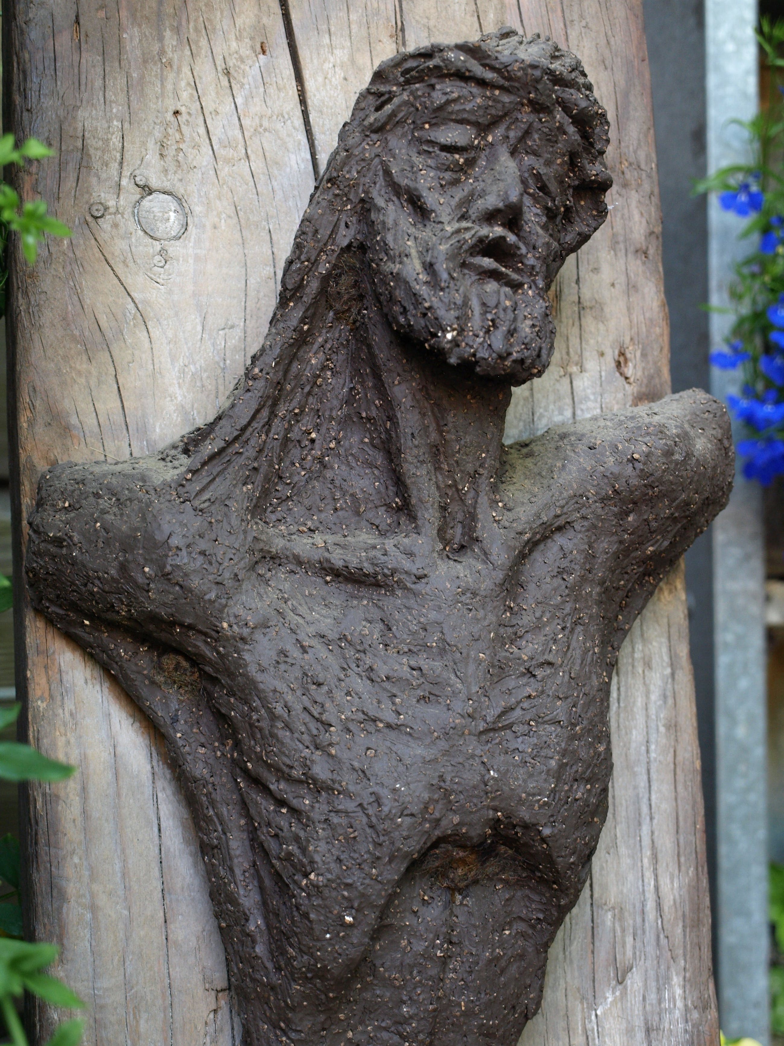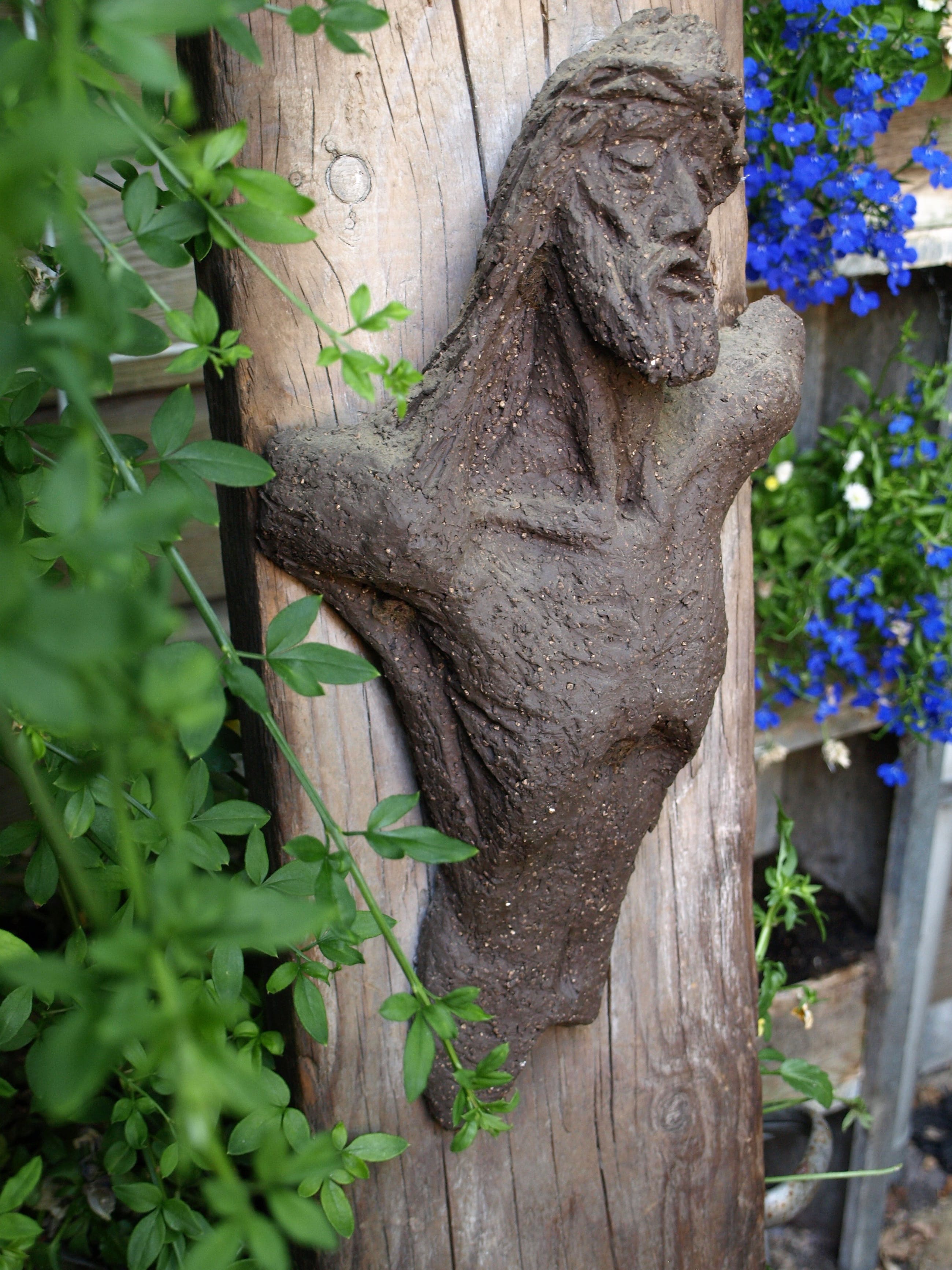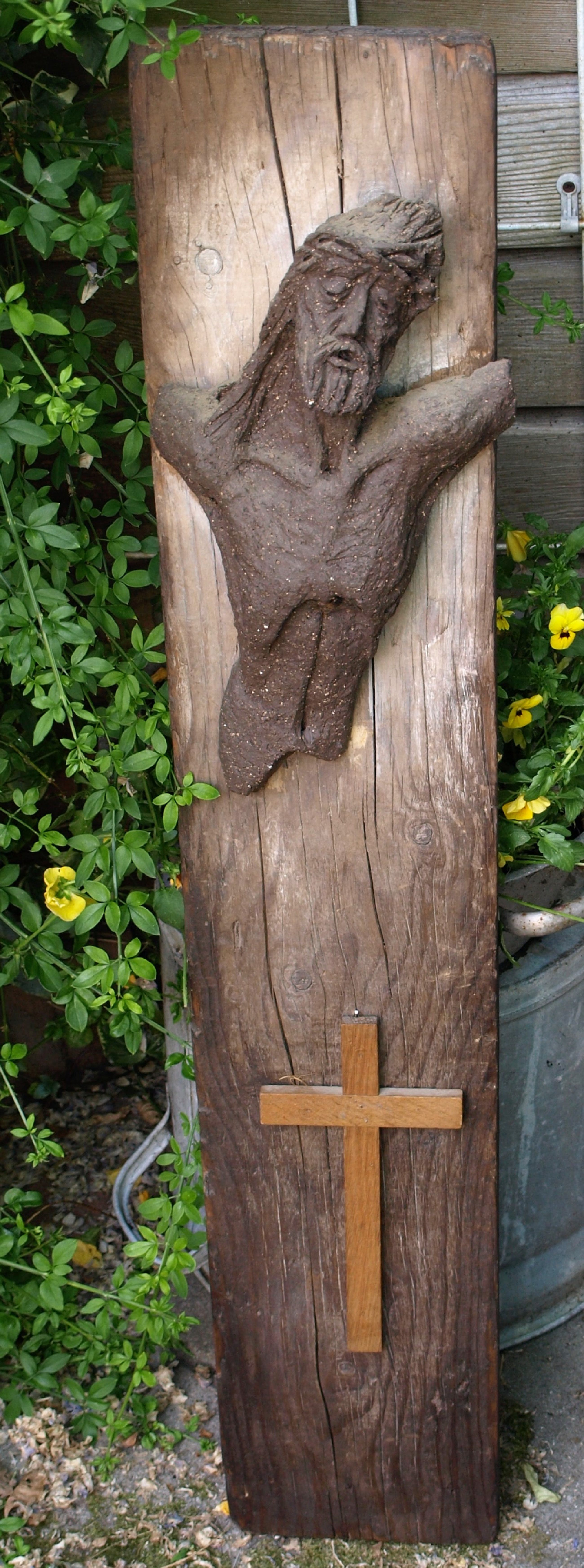 -Gemaakt van aardewerk (‘chamotte’), bevestigd op een dikke plank hout. Op deze plank hangt ook een houten kruis aan een spijkertje.