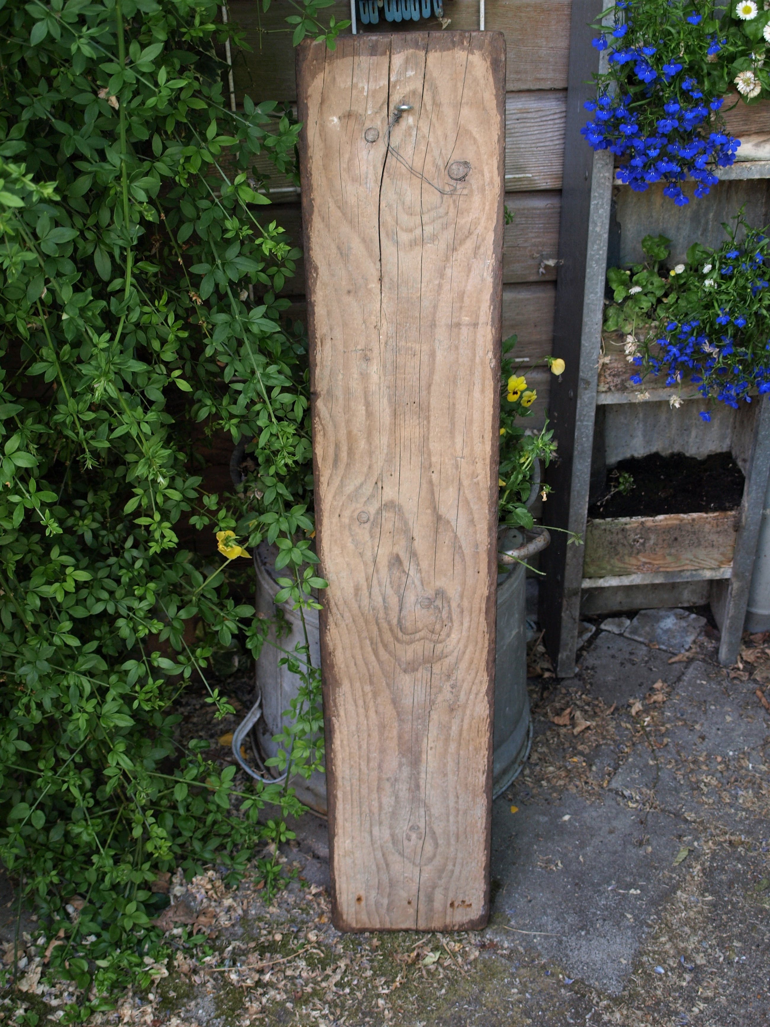 -Afmetingen: Plank hout, 100 x 19 x 3,5 cm. Buste, 36 x 20 x 9 cm. Houten kruis, 25 x 12,5 x 1 cm.