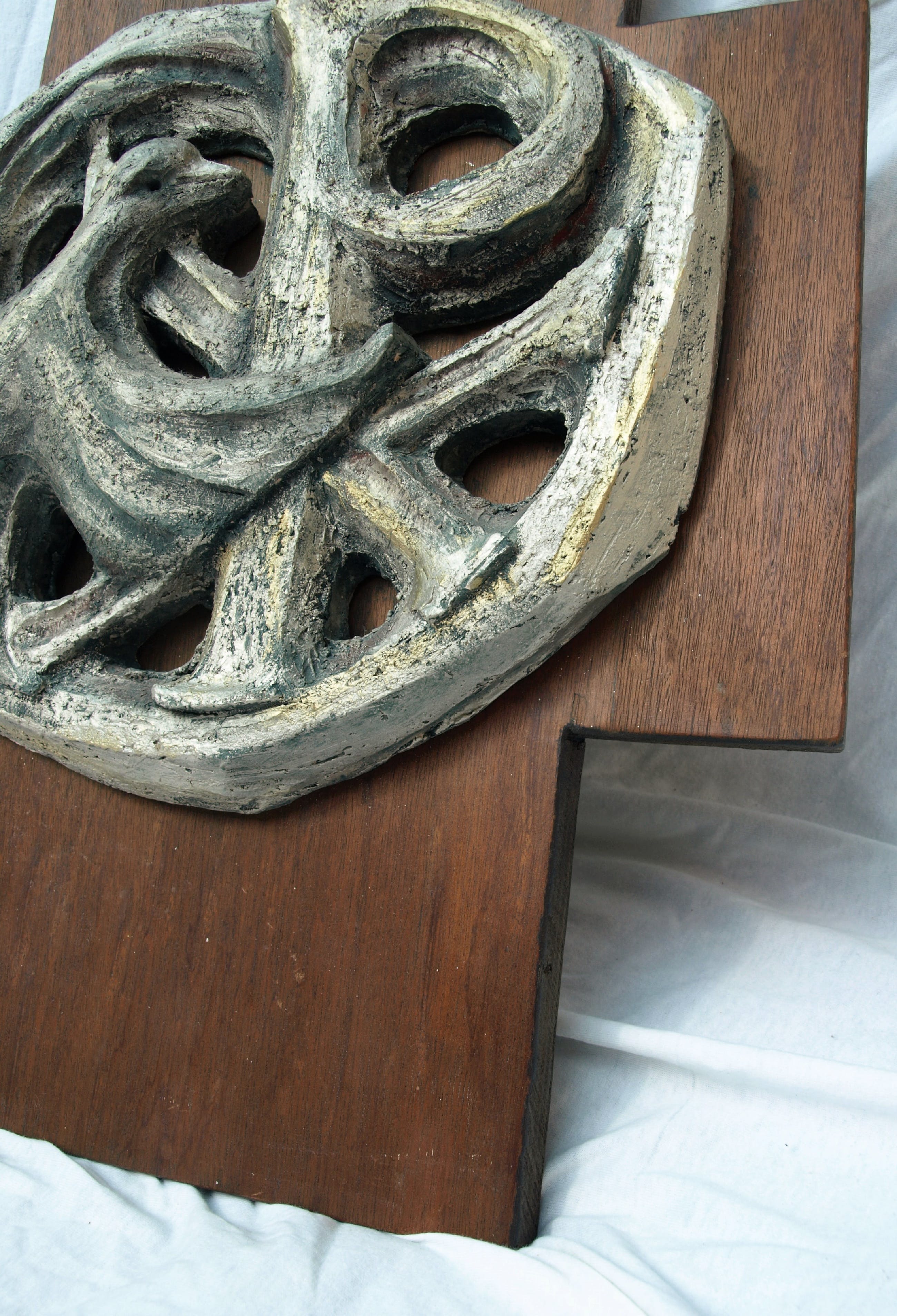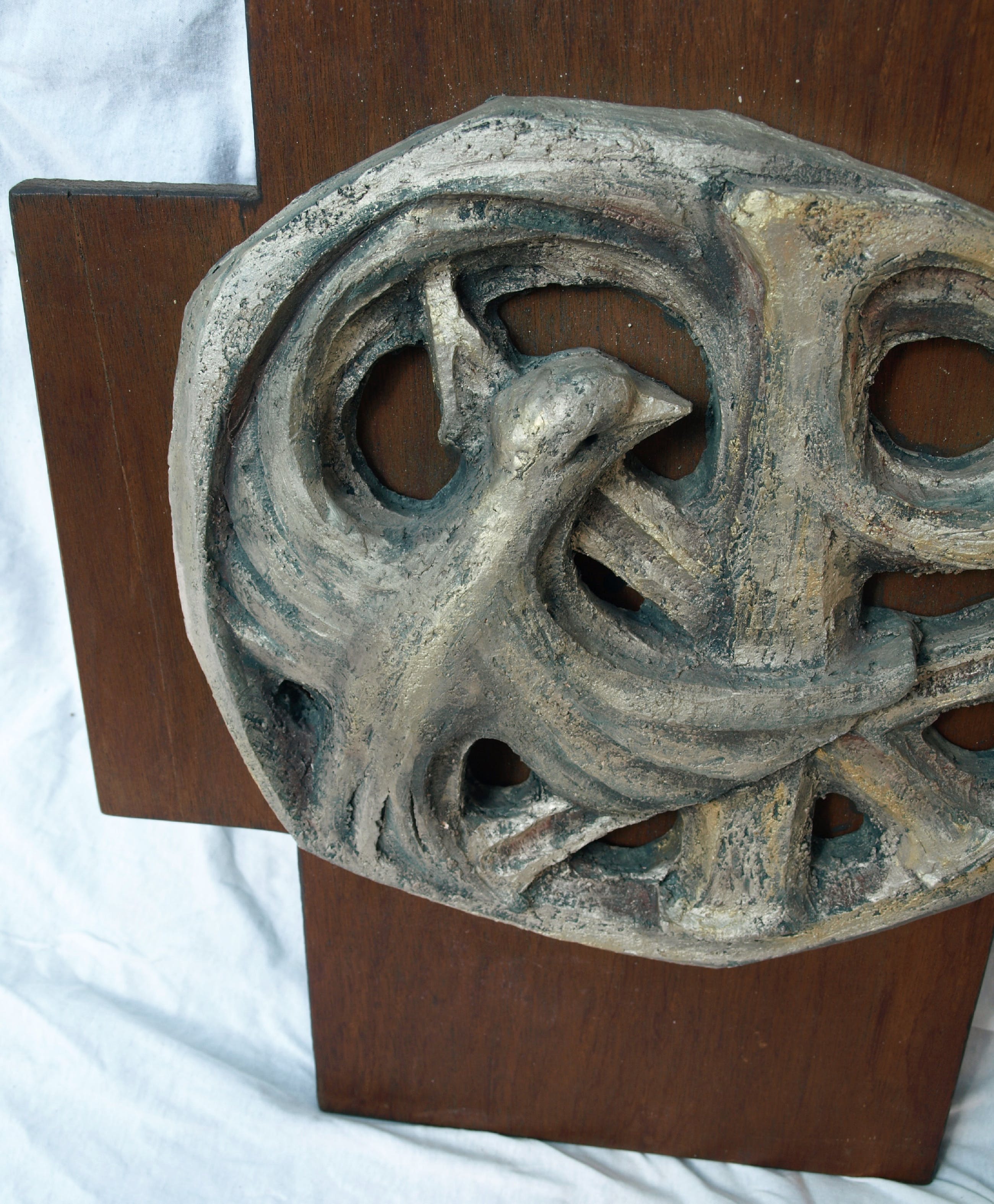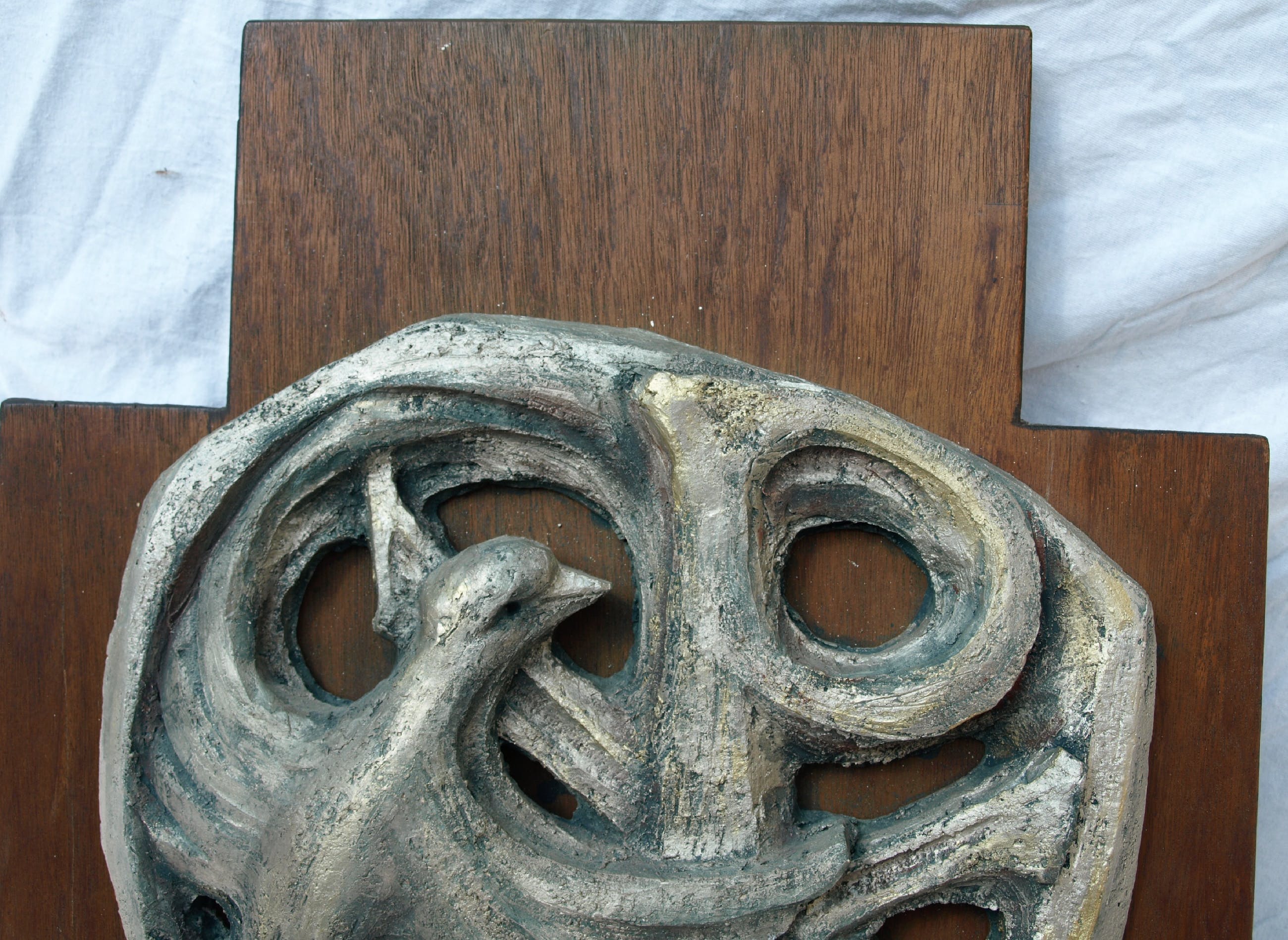 -Afmetingen: Hout, ca. 48 x 38 x 2 cm. Beeld, ca. 28 x 30 x 5 cm.