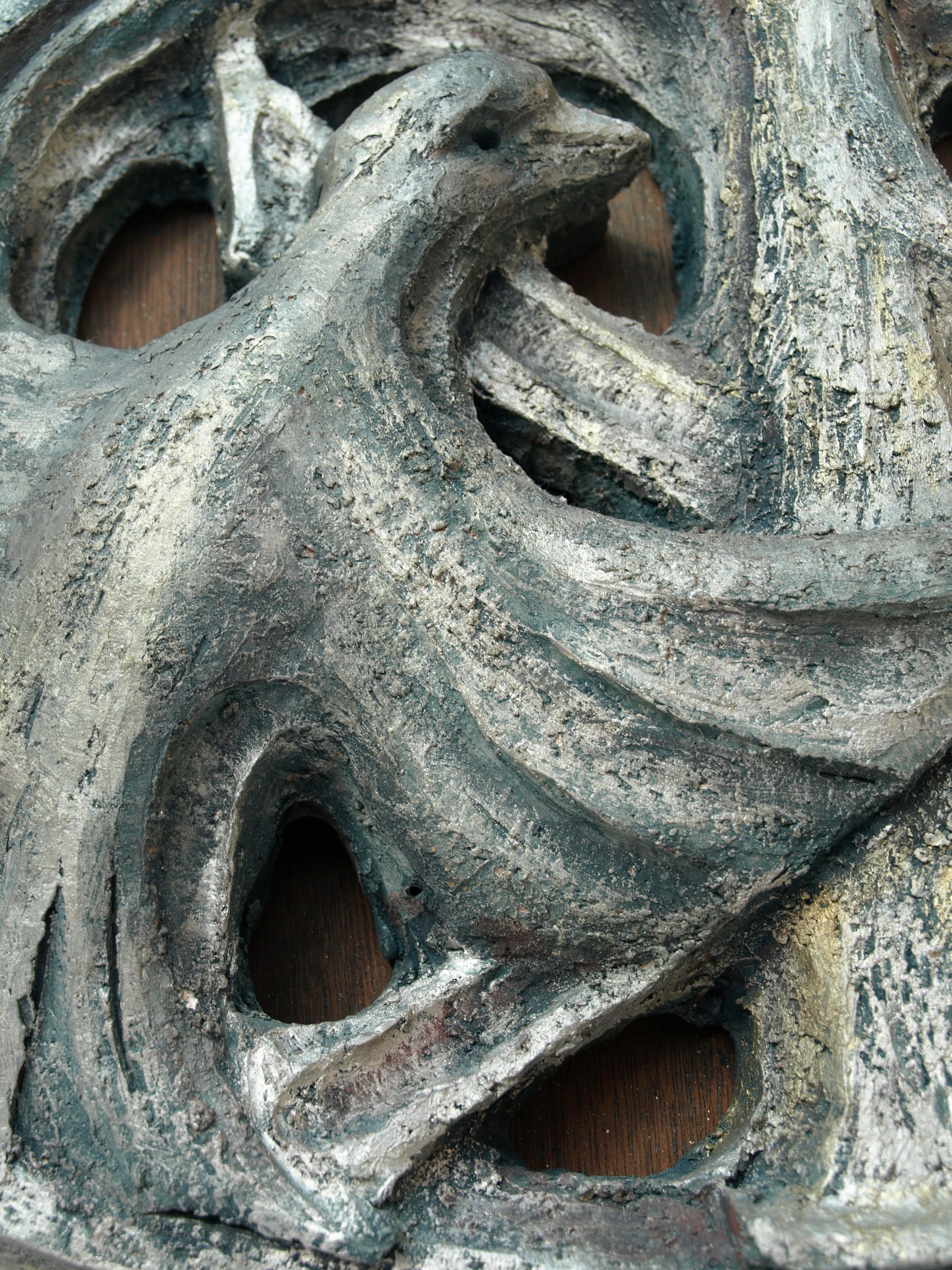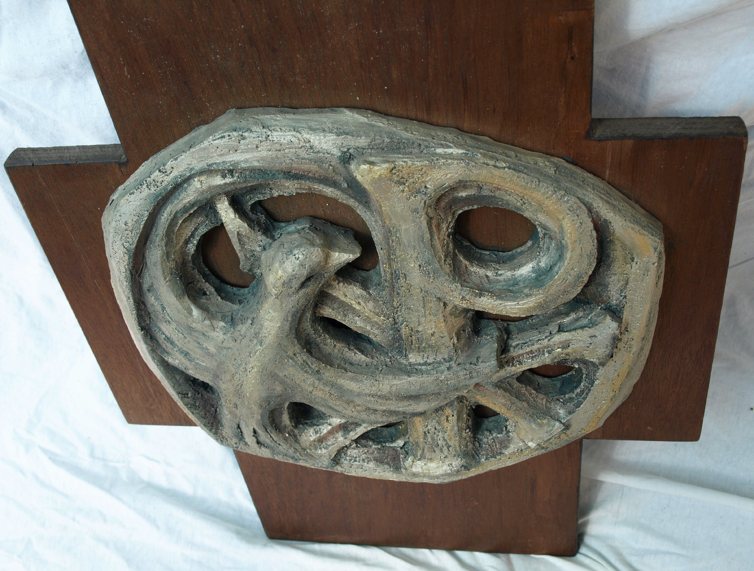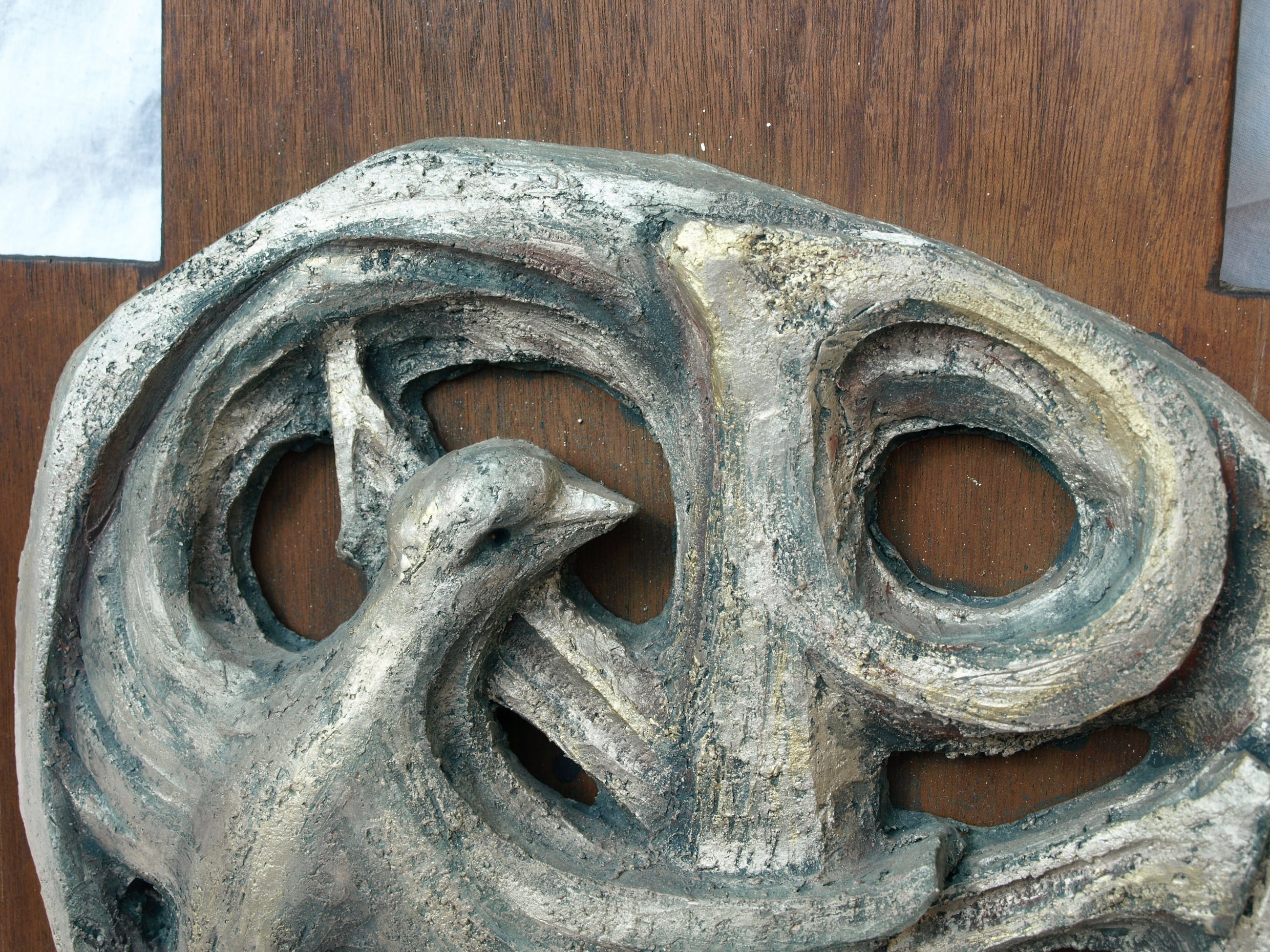 -Gemaakt van aardewerk (‘chamotte’), bevestigd op een paneel hout. Met ophangsysteem.