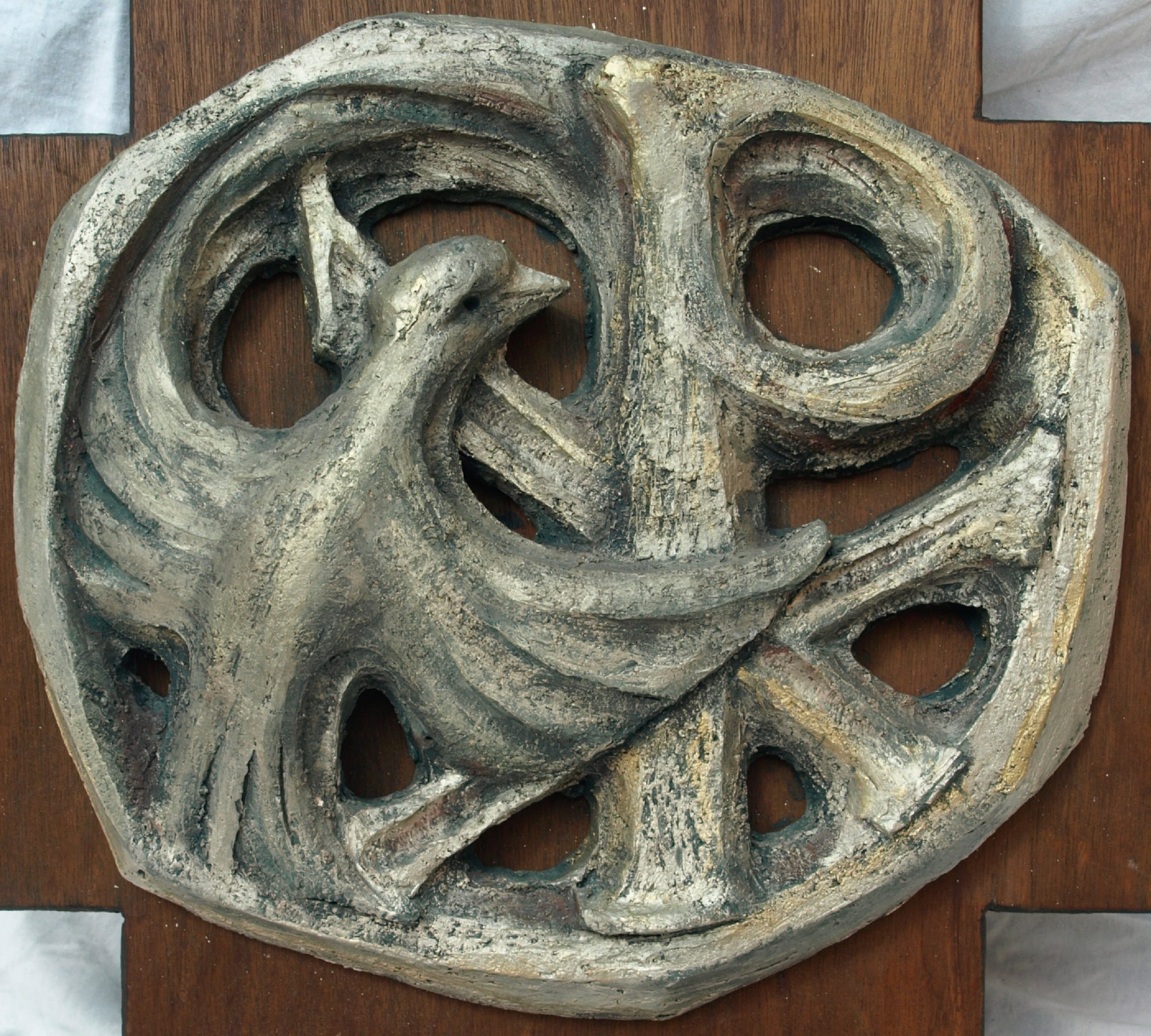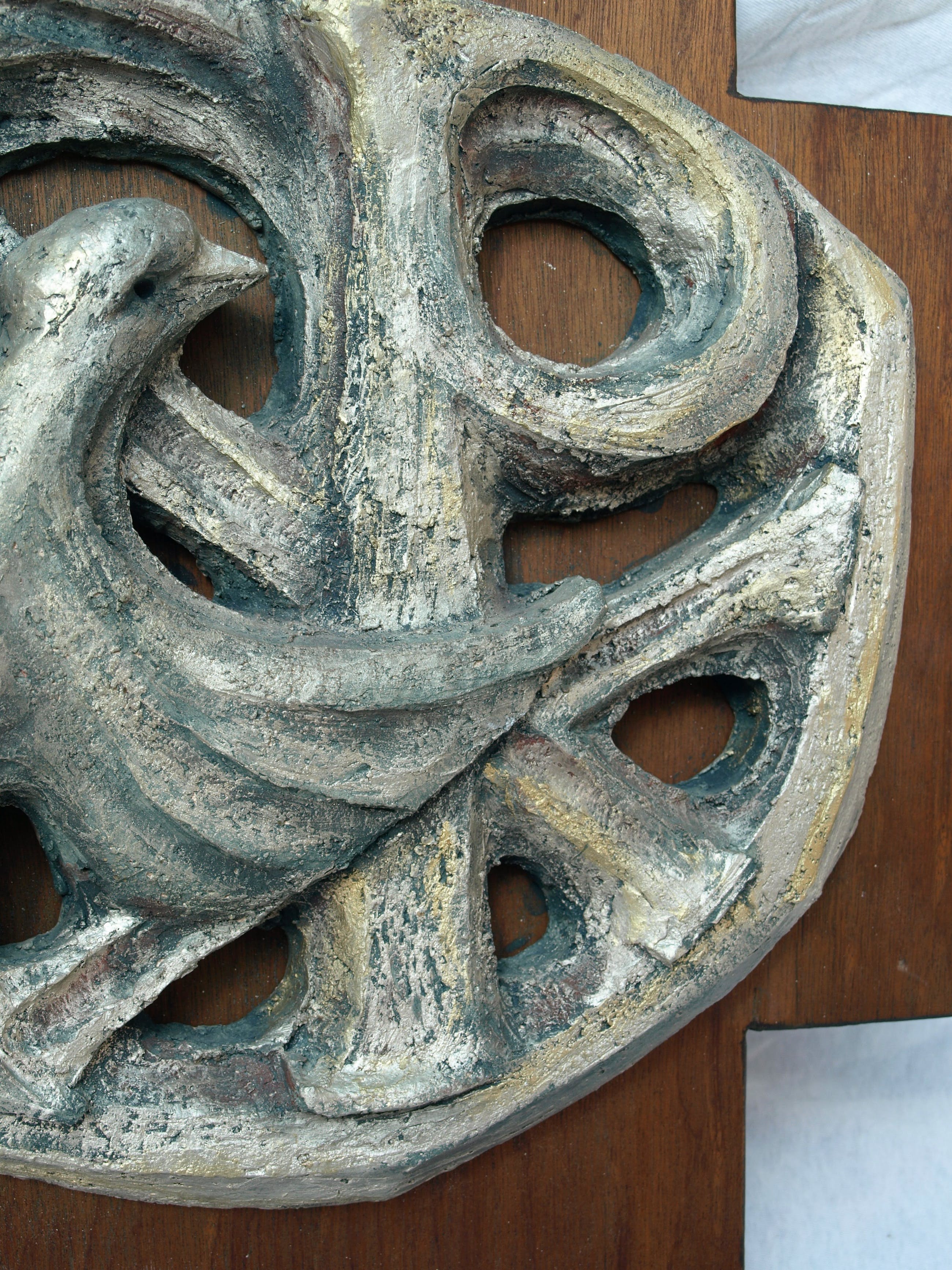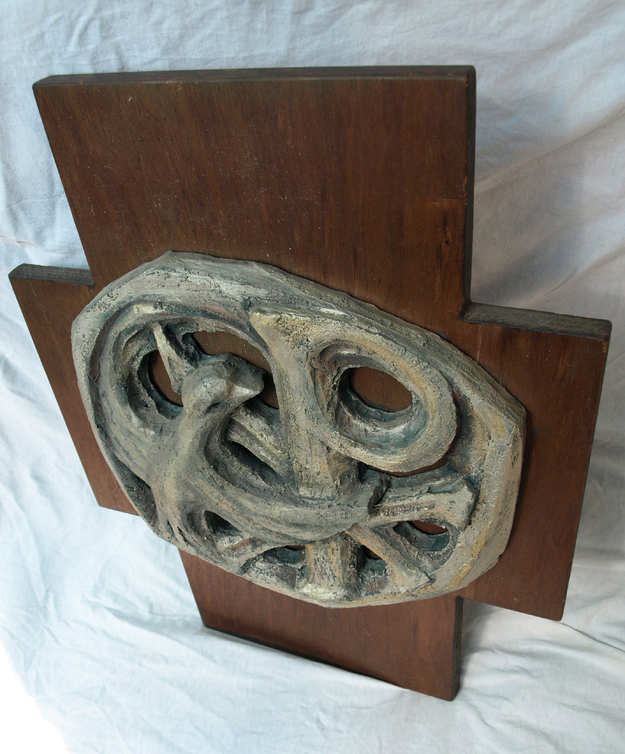 -Gemaakt van aardewerk (‘chamotte’), bevestigd op een paneel hout. Met ophangsysteem.