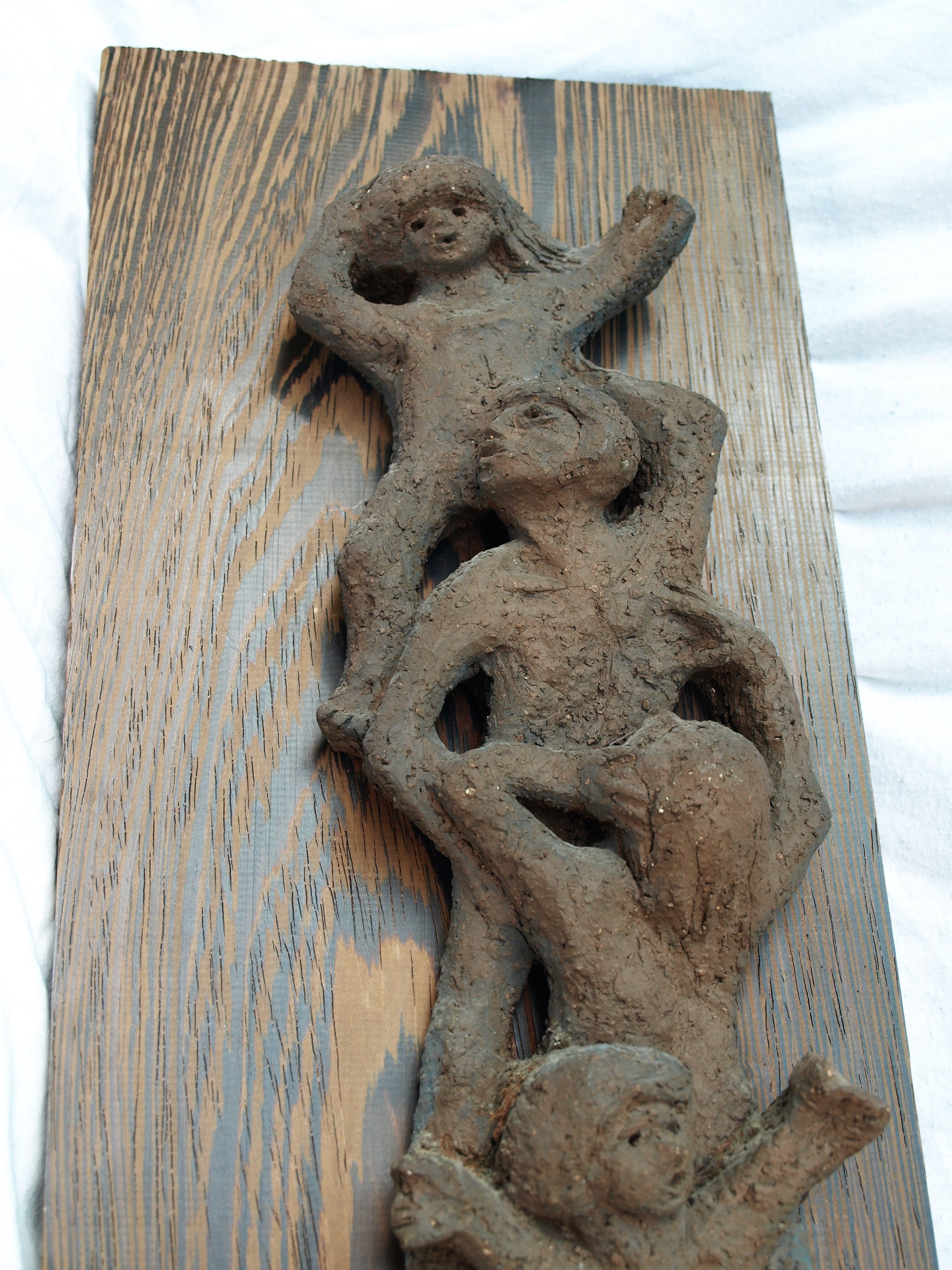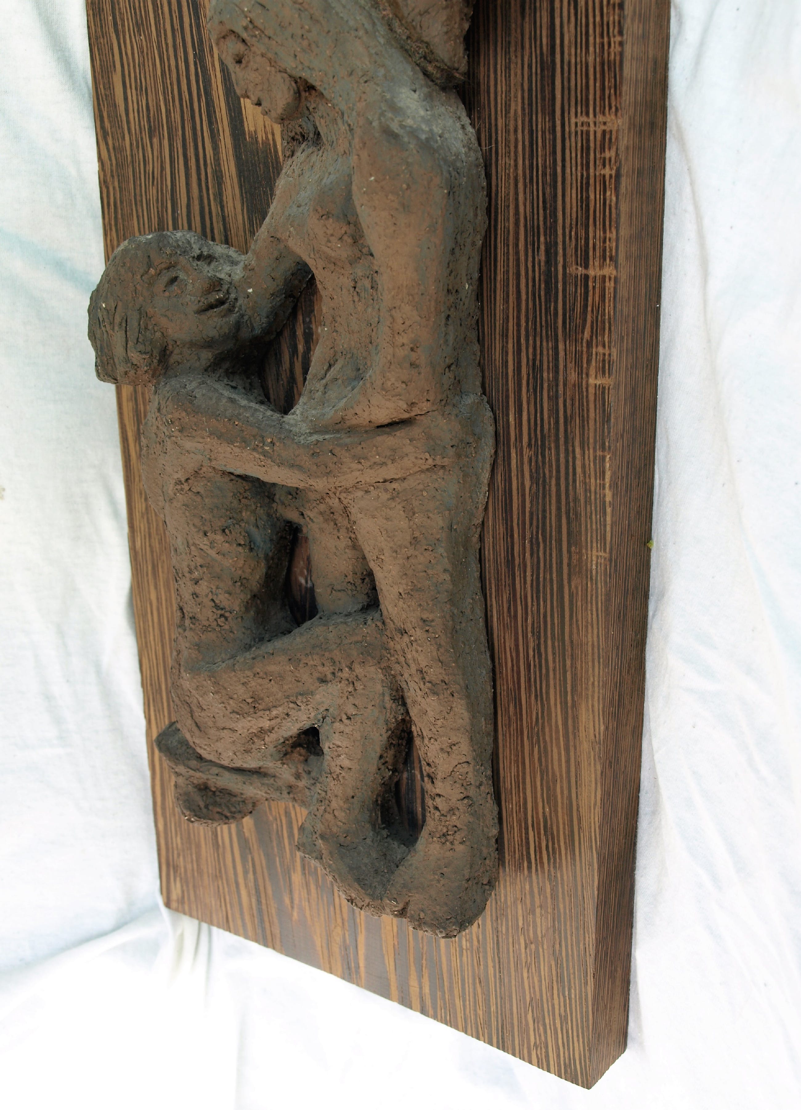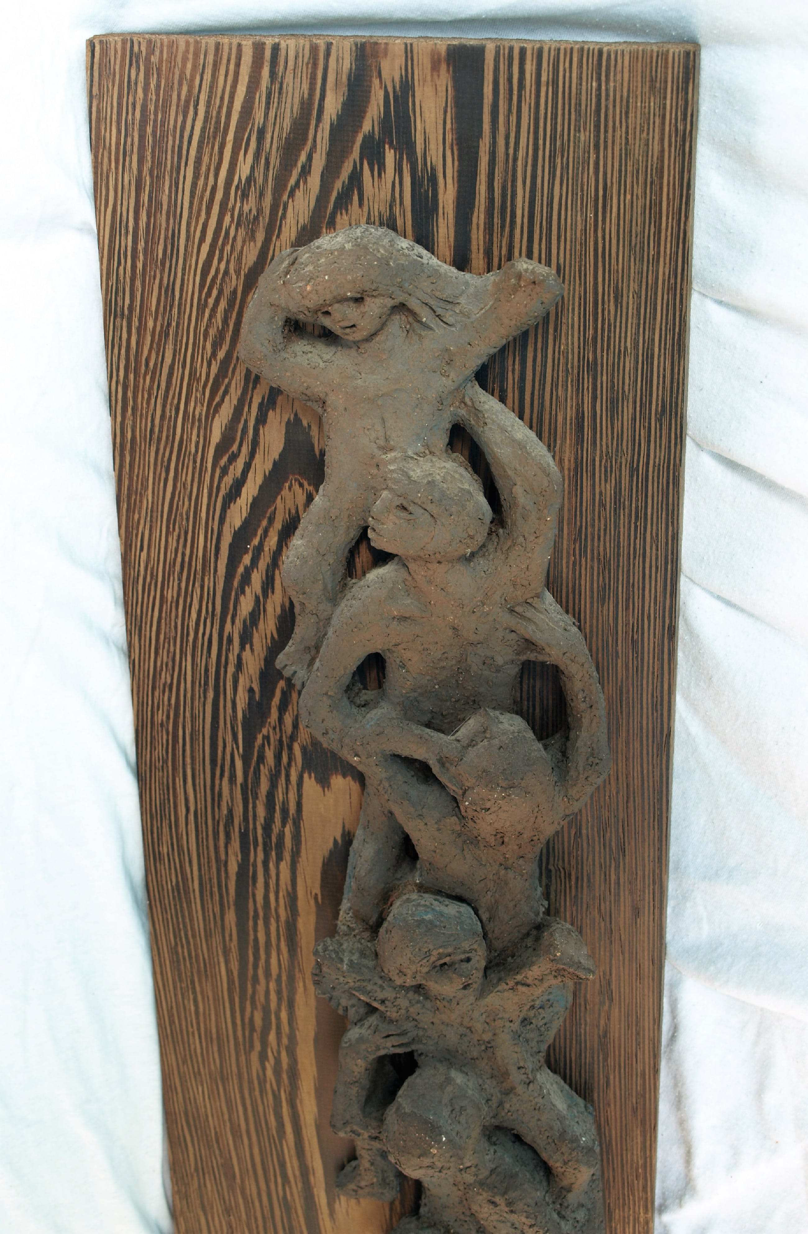 -Gemaakt van aardewerk (‘chamotte’), bevestigd op een paneel hout.