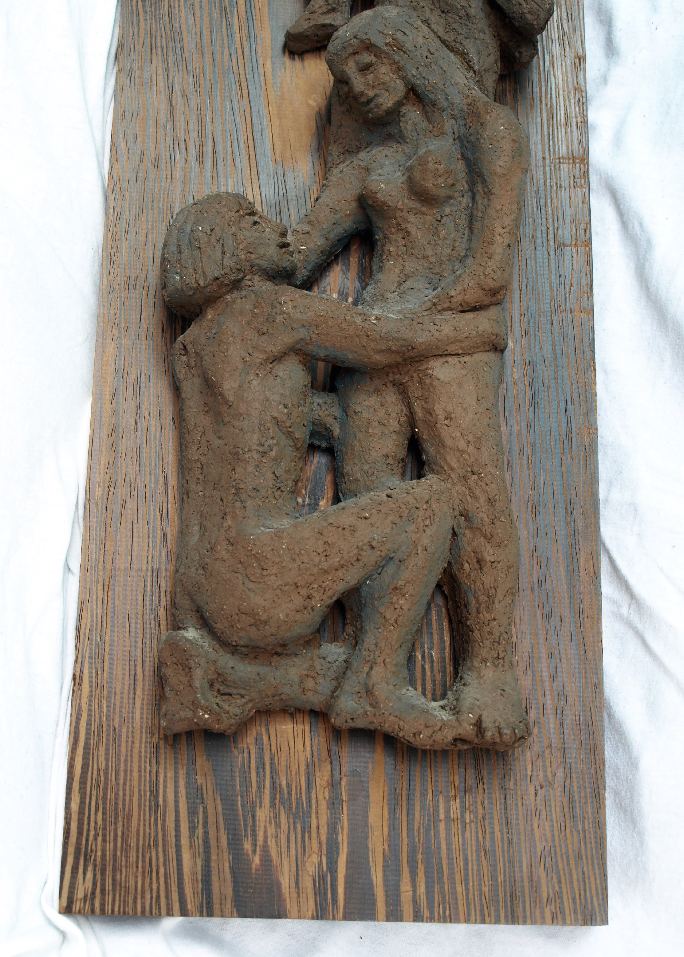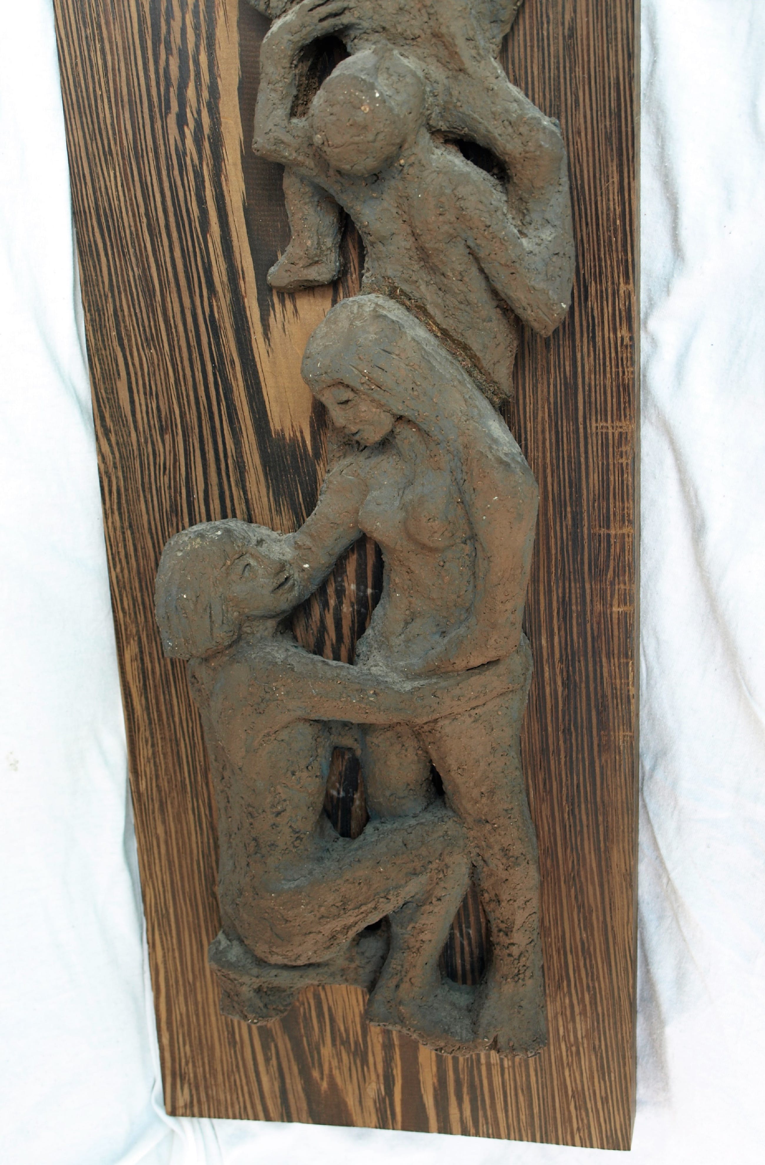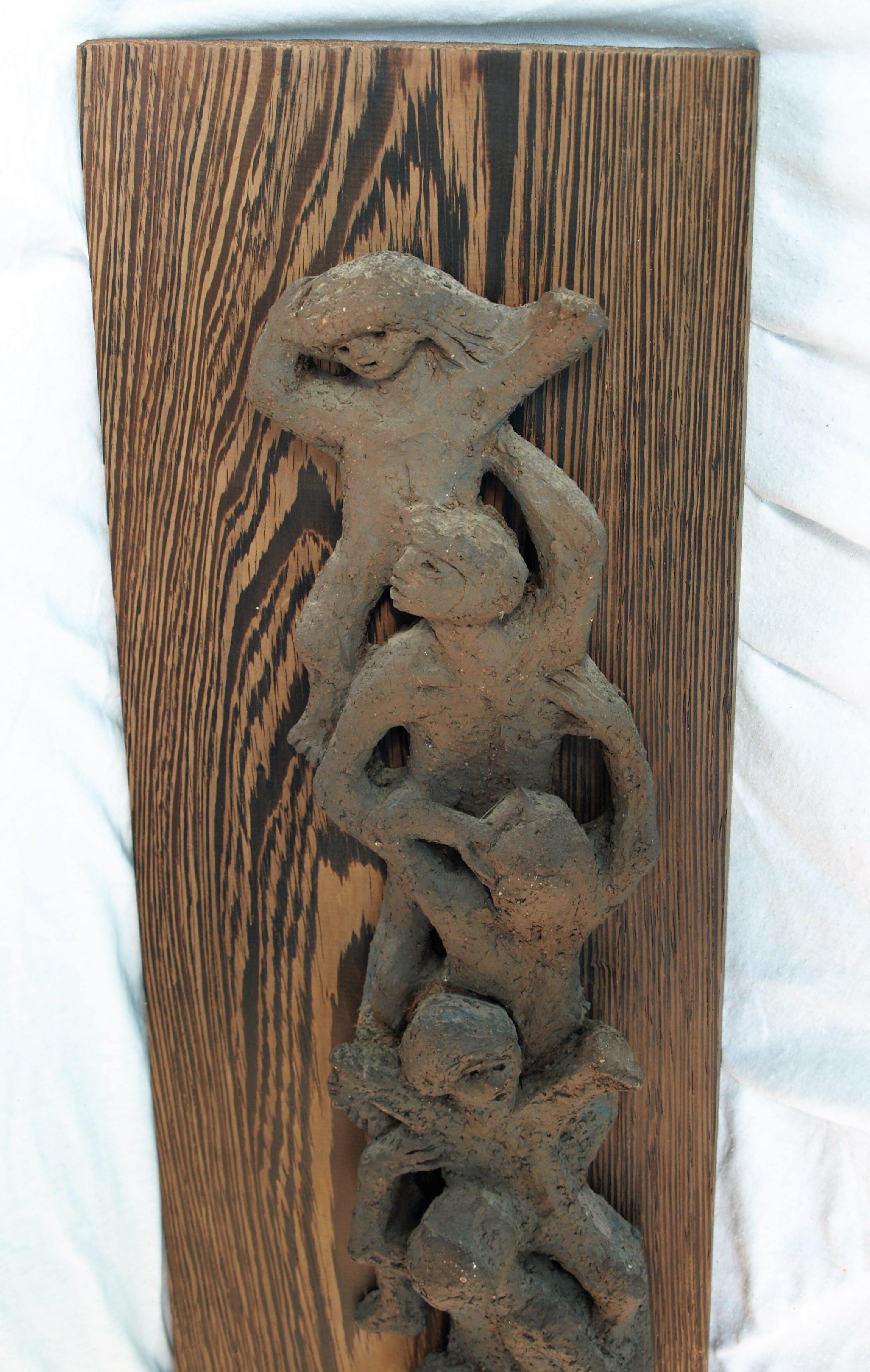 -Gemaakt van aardewerk (‘chamotte’), bevestigd op een paneel hout.