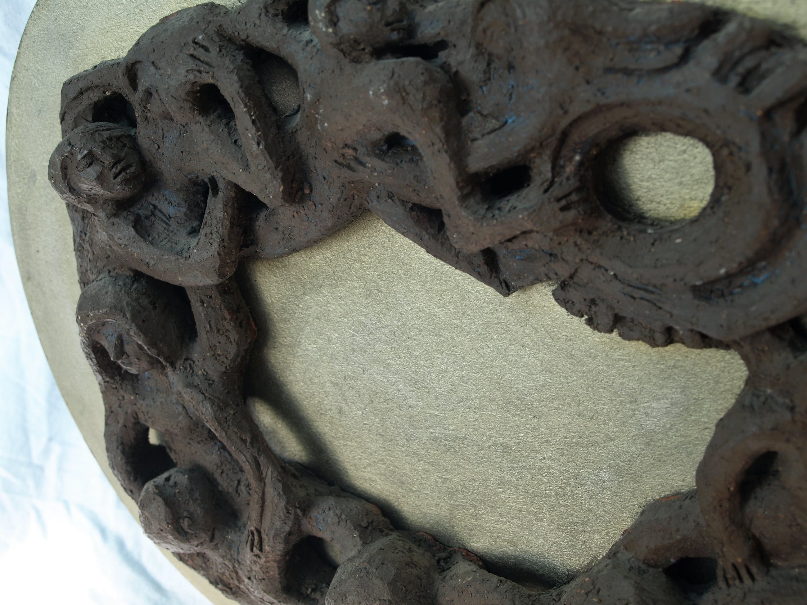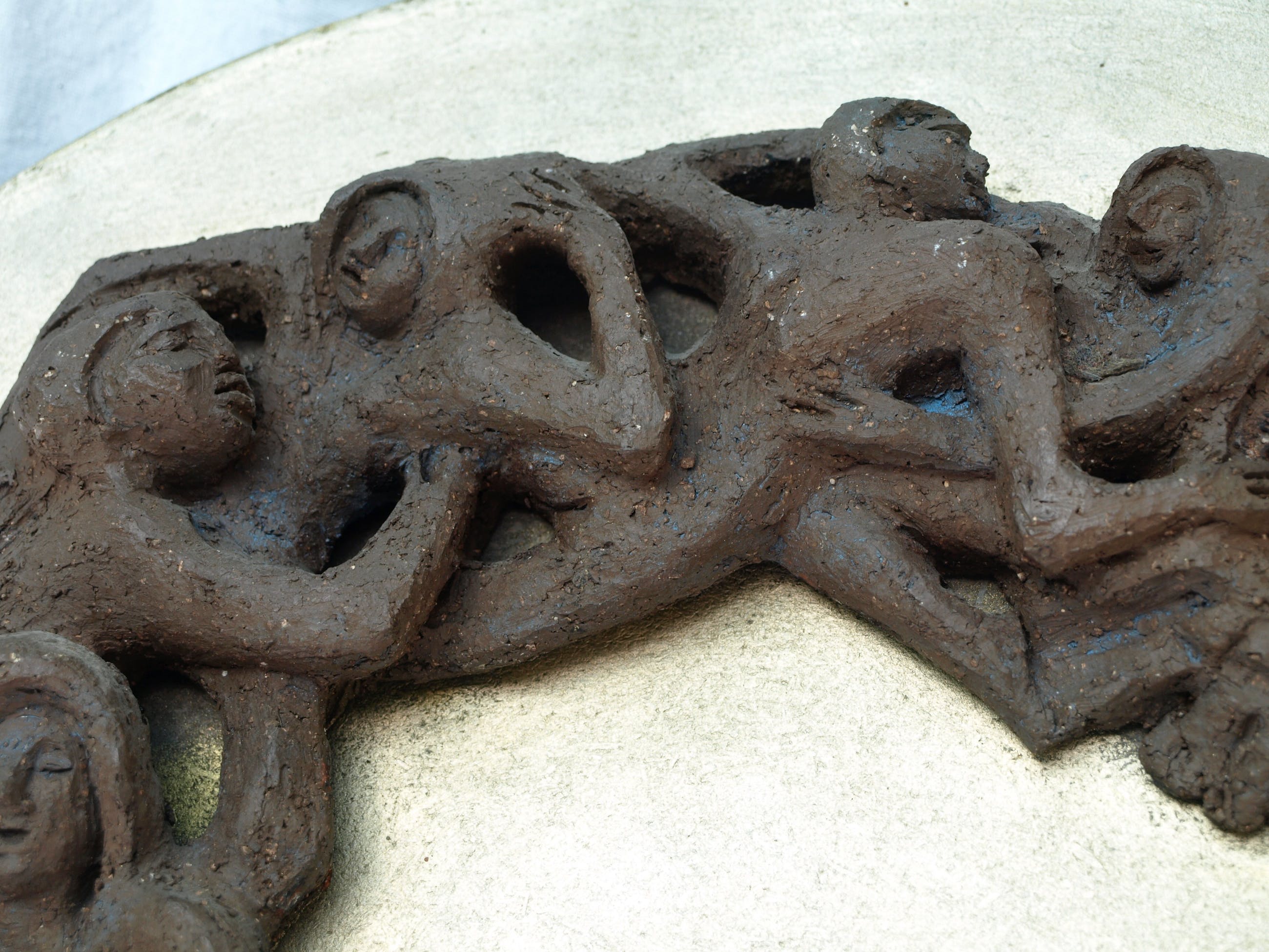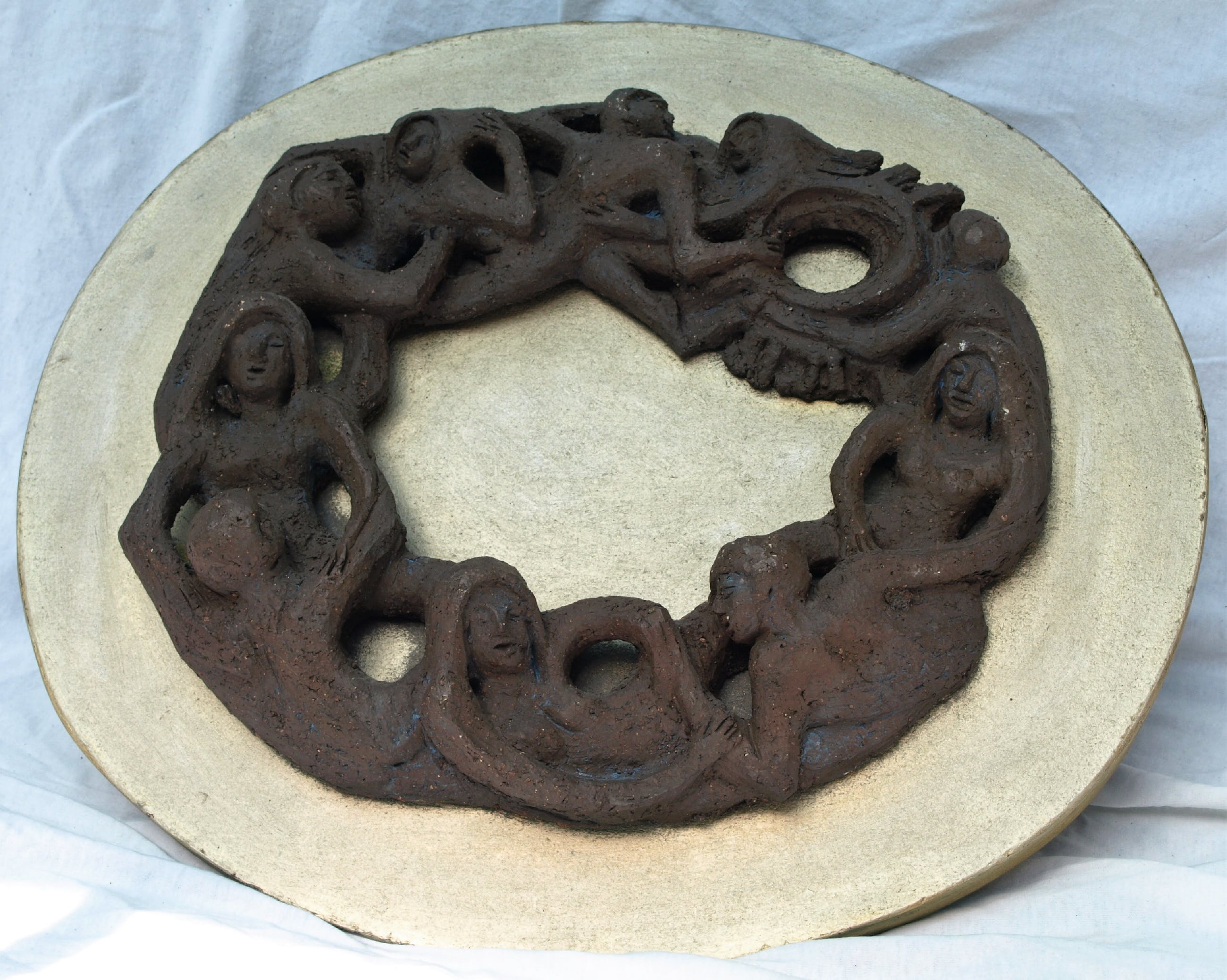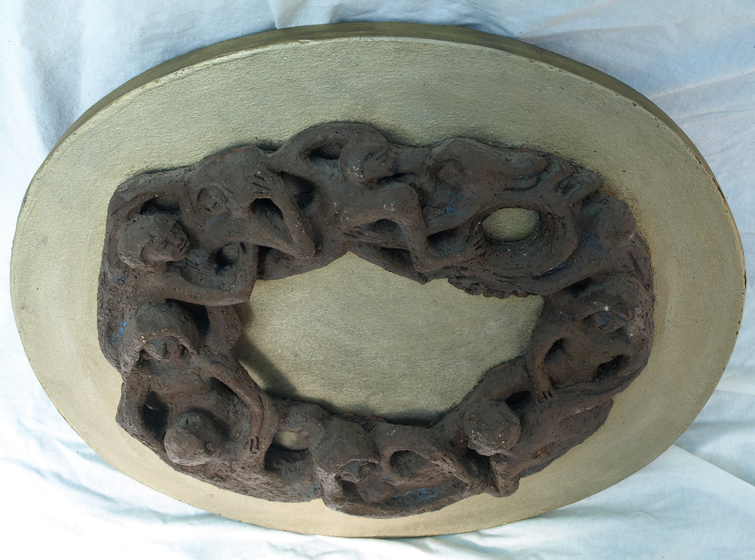 -Gemaakt van aardewerk (‘chamotte’), bevestigd op een paneel hout. Met ophangsysteem.