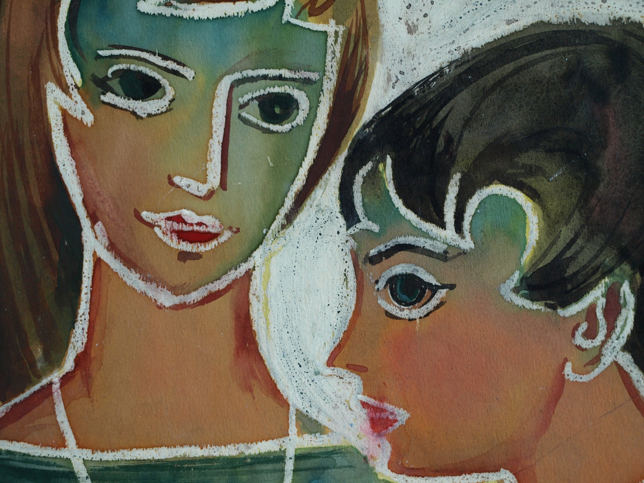 -Een combinatie van oliepastelkrijt en gouache en ecoline op karton.