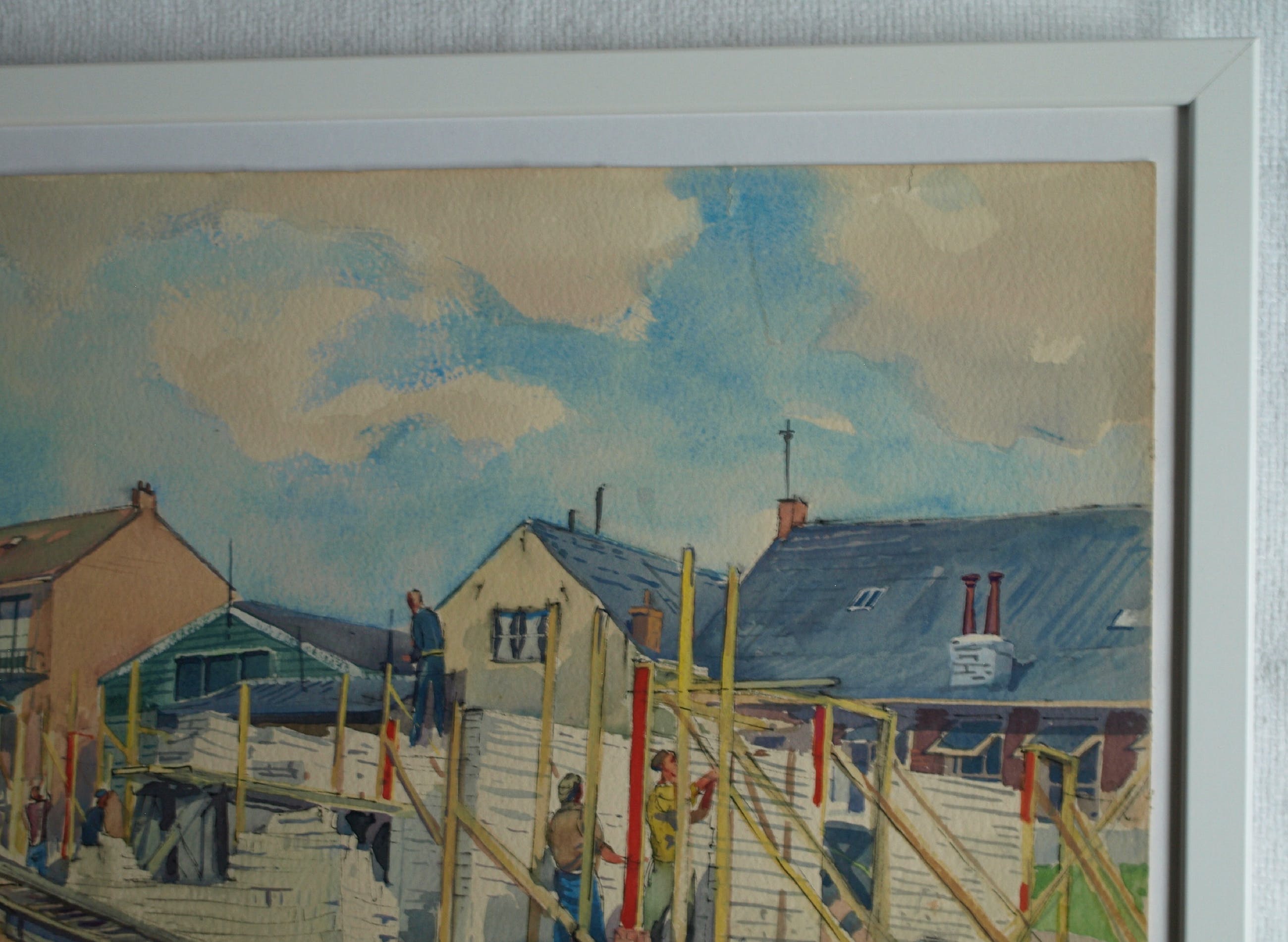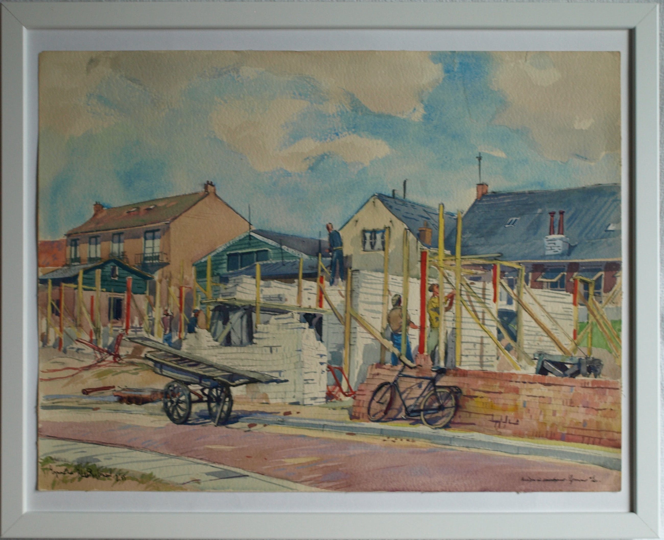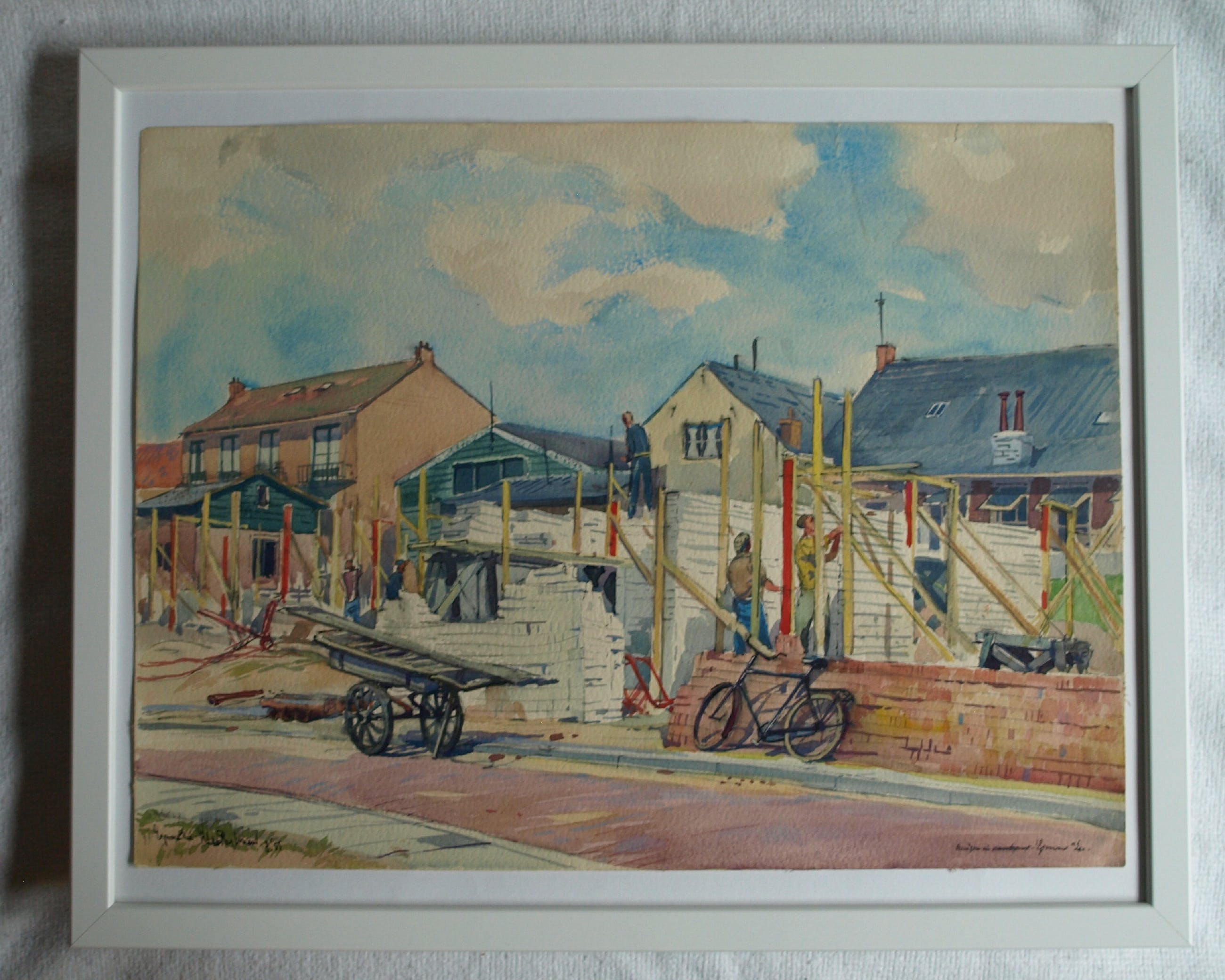 Een werk uit 1955 van de Nederlandse kunstenaar Klaas Pijlman (1917-2007), met een voorstelling van huizen in aanbouw in de badplaats Egmond aan Zee. -Techniek: Aquarel en inkt op papier. -Gesigneerd en gedateerd (augustus 1955) linksonder. Getiteld rechtsonder. -Ingelijst in een eenvoudige houten lijst met plexiglasplaat. -Afmetingen: Lijst, 43 x 53 cm. Blad / beeld, 35,5 x 47 cm. -Herkomst: Uit de inboedel van de in 2007 overleden kunstenaar. -Conditie: In goede staat. Het papier van de aquarel heeft aan de bovenrand, rechts, 2 kleine scheurtjes (1 cm en 1,5 cm). Zie ook de foto’s voor een eigen indruk. Kan zo aan de muur.
