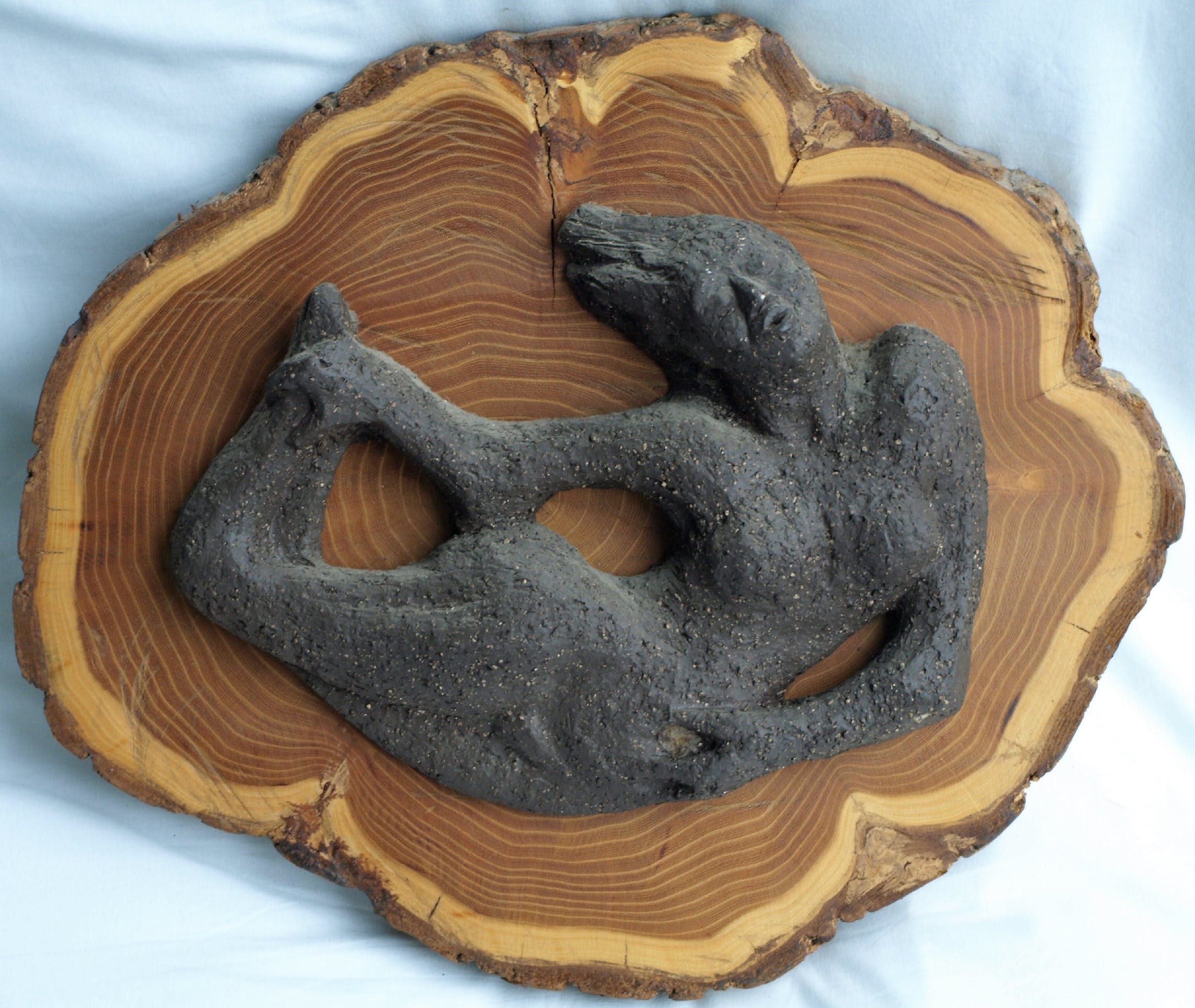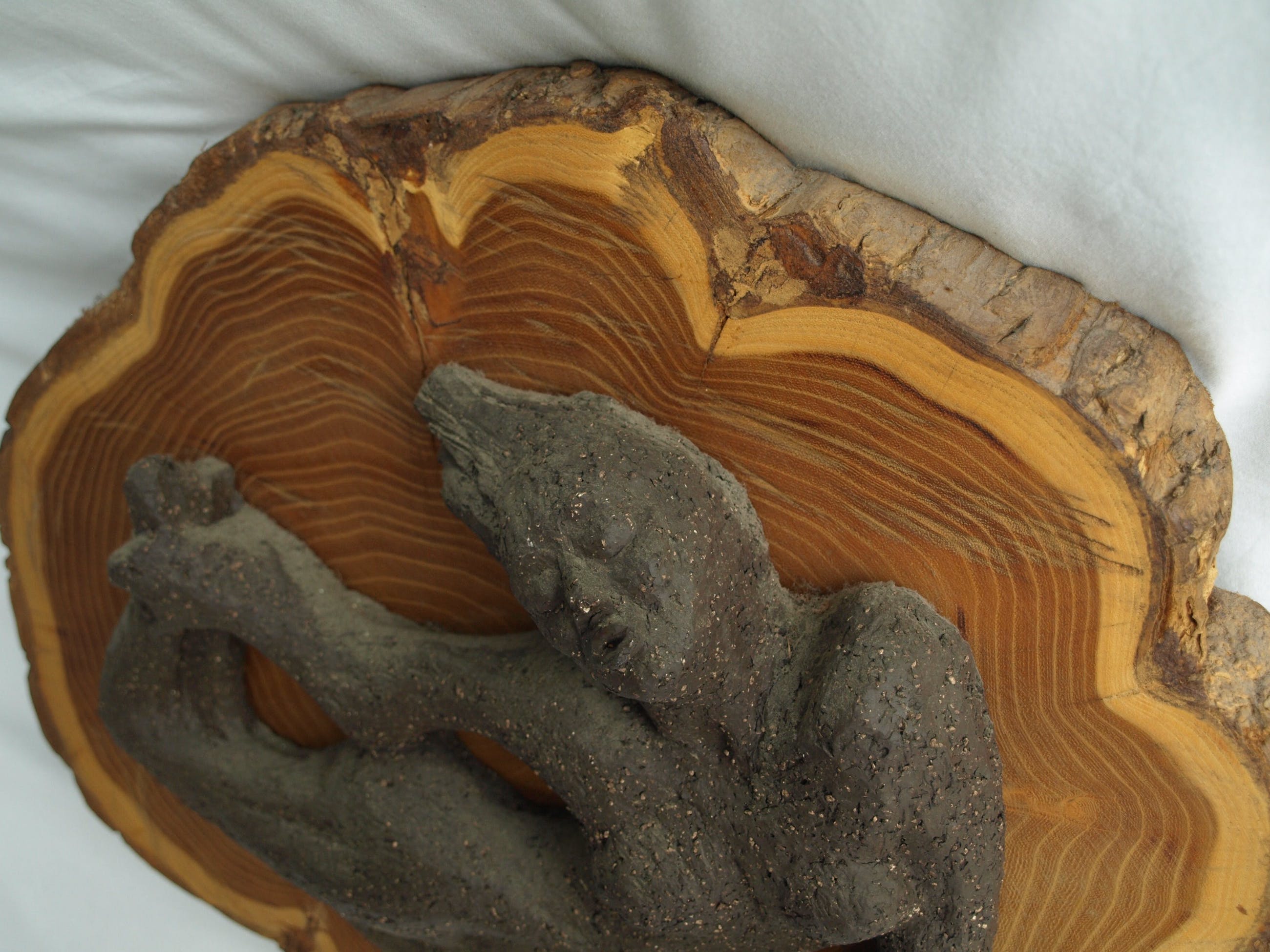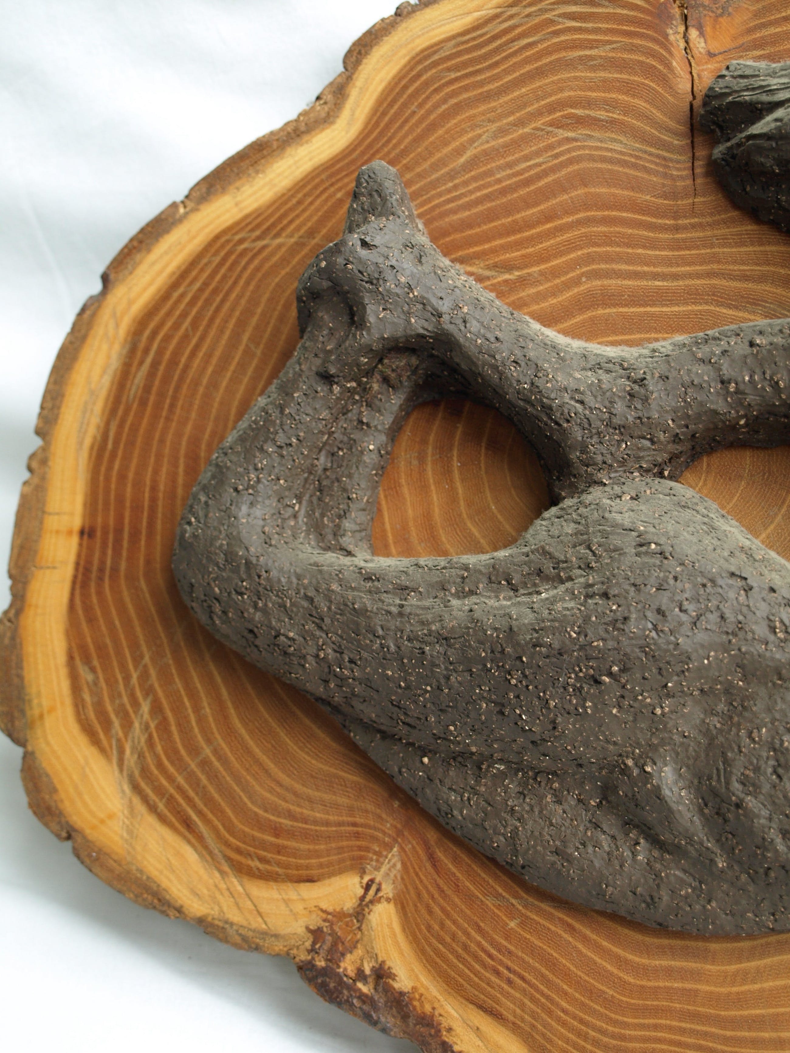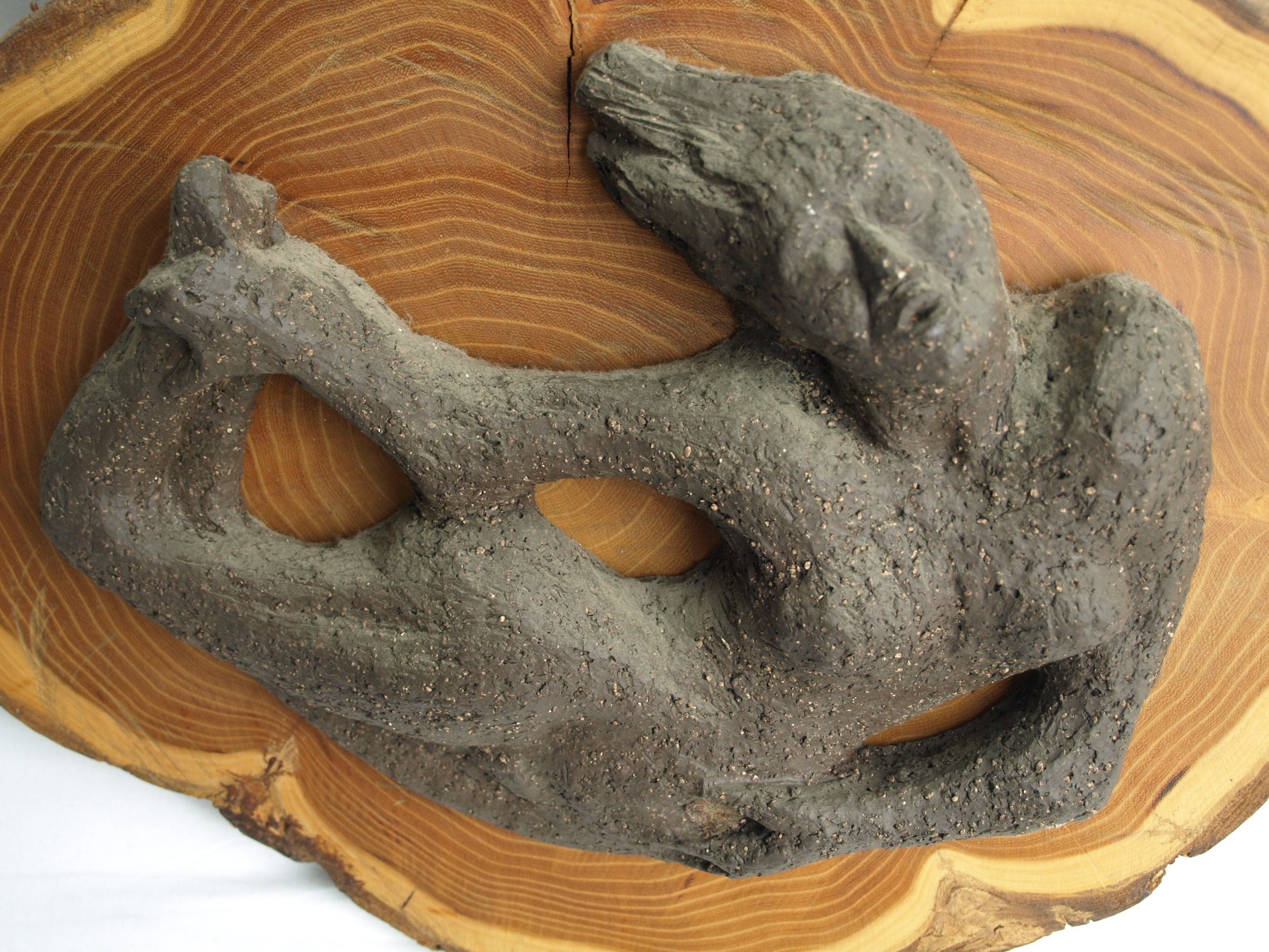 -Gemaakt van aardewerk en bevestigd op een stuk hout van een boomstam.