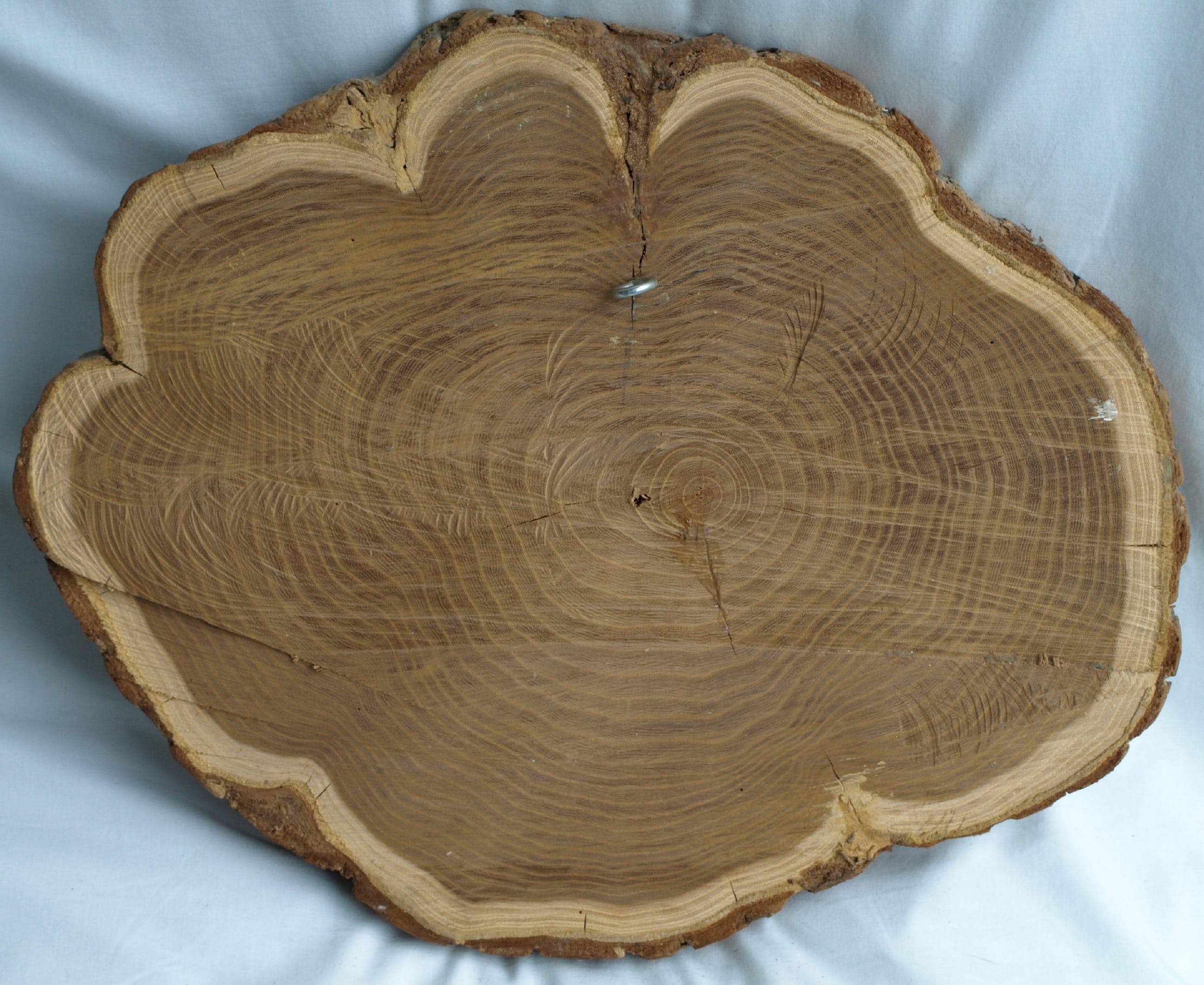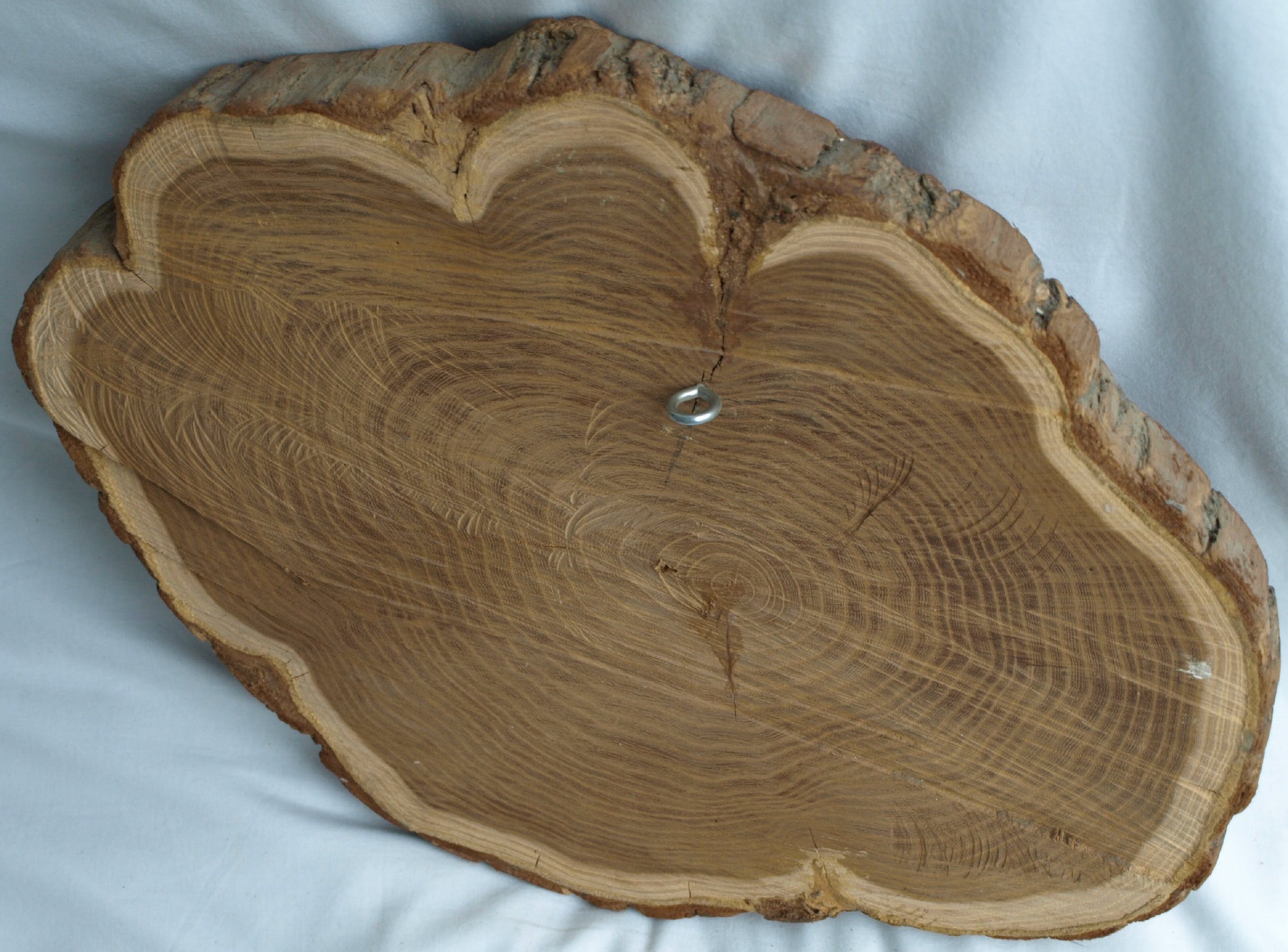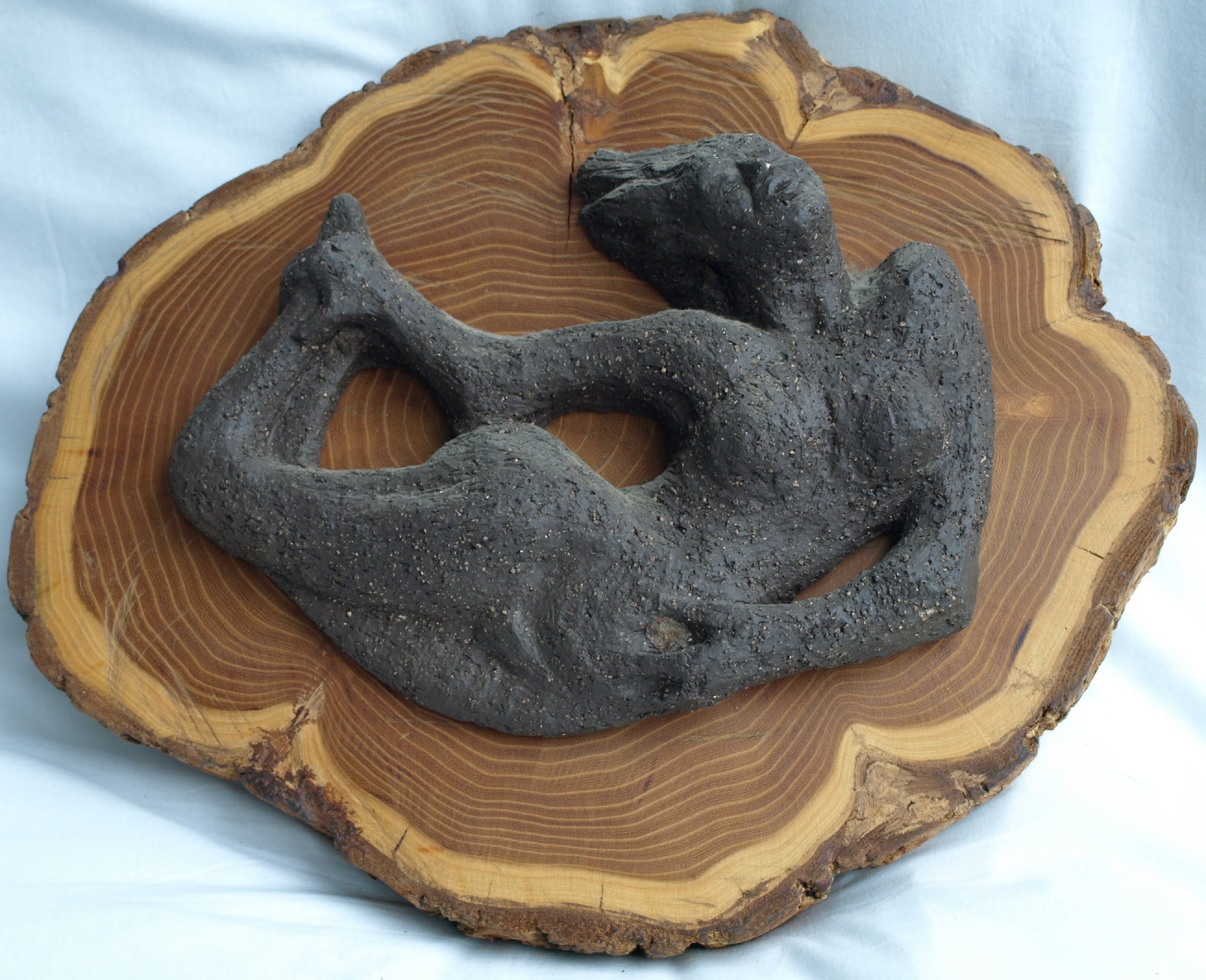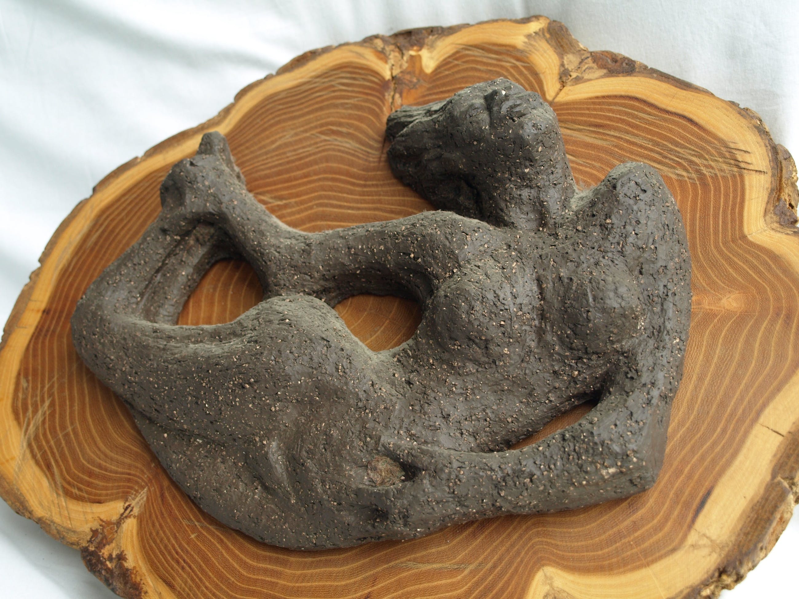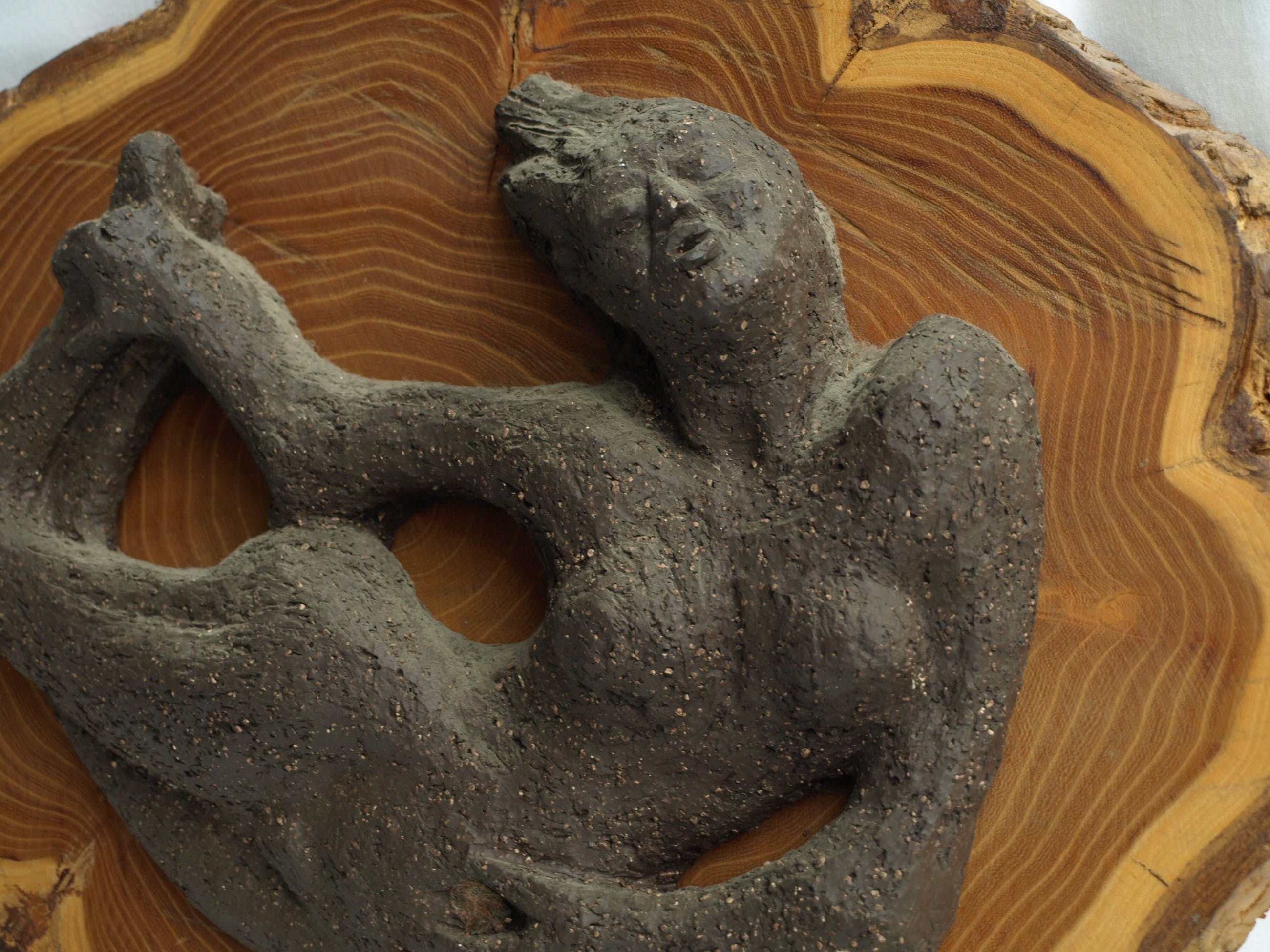 -Gemaakt van aardewerk en bevestigd op een stuk hout van een boomstam.