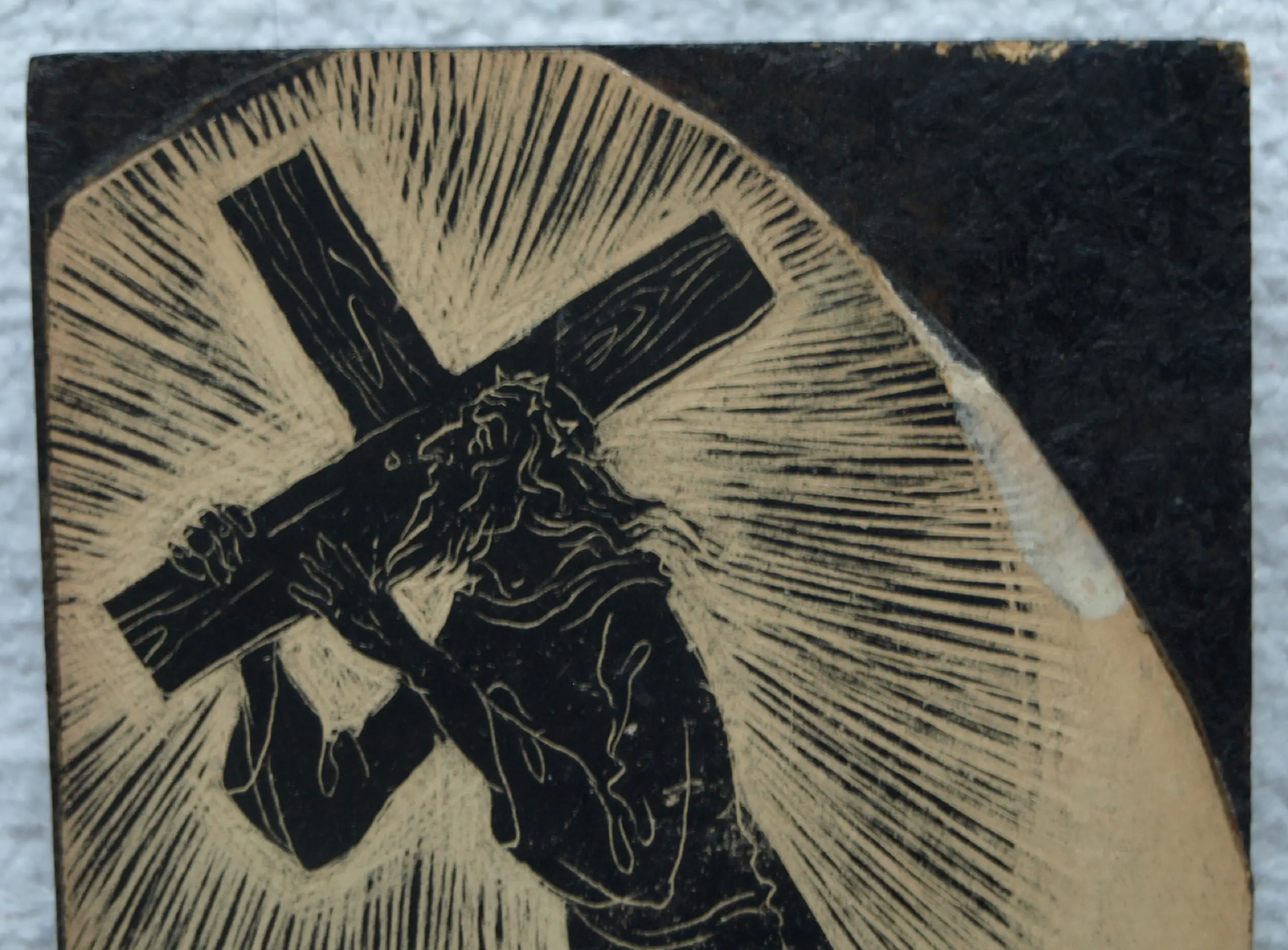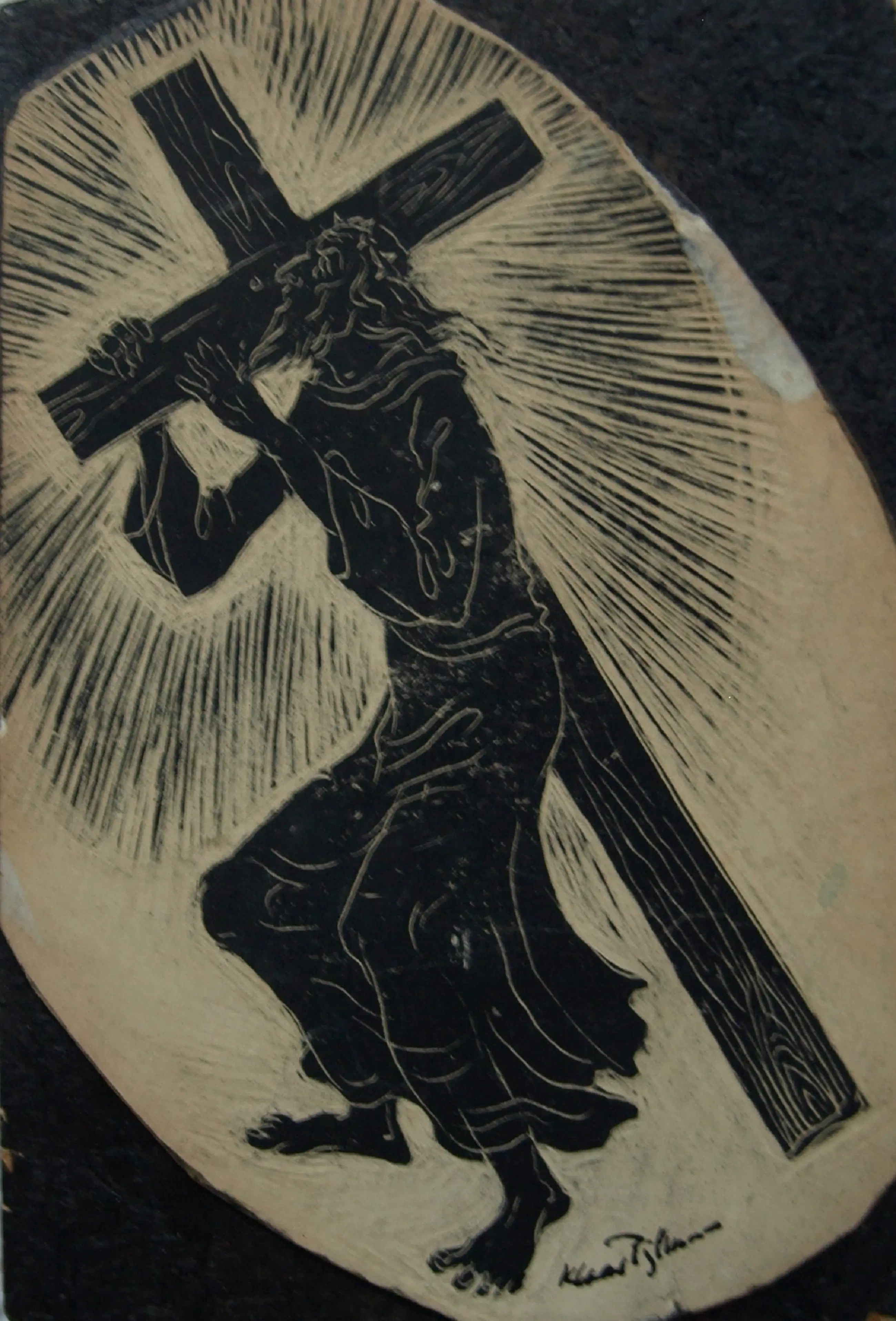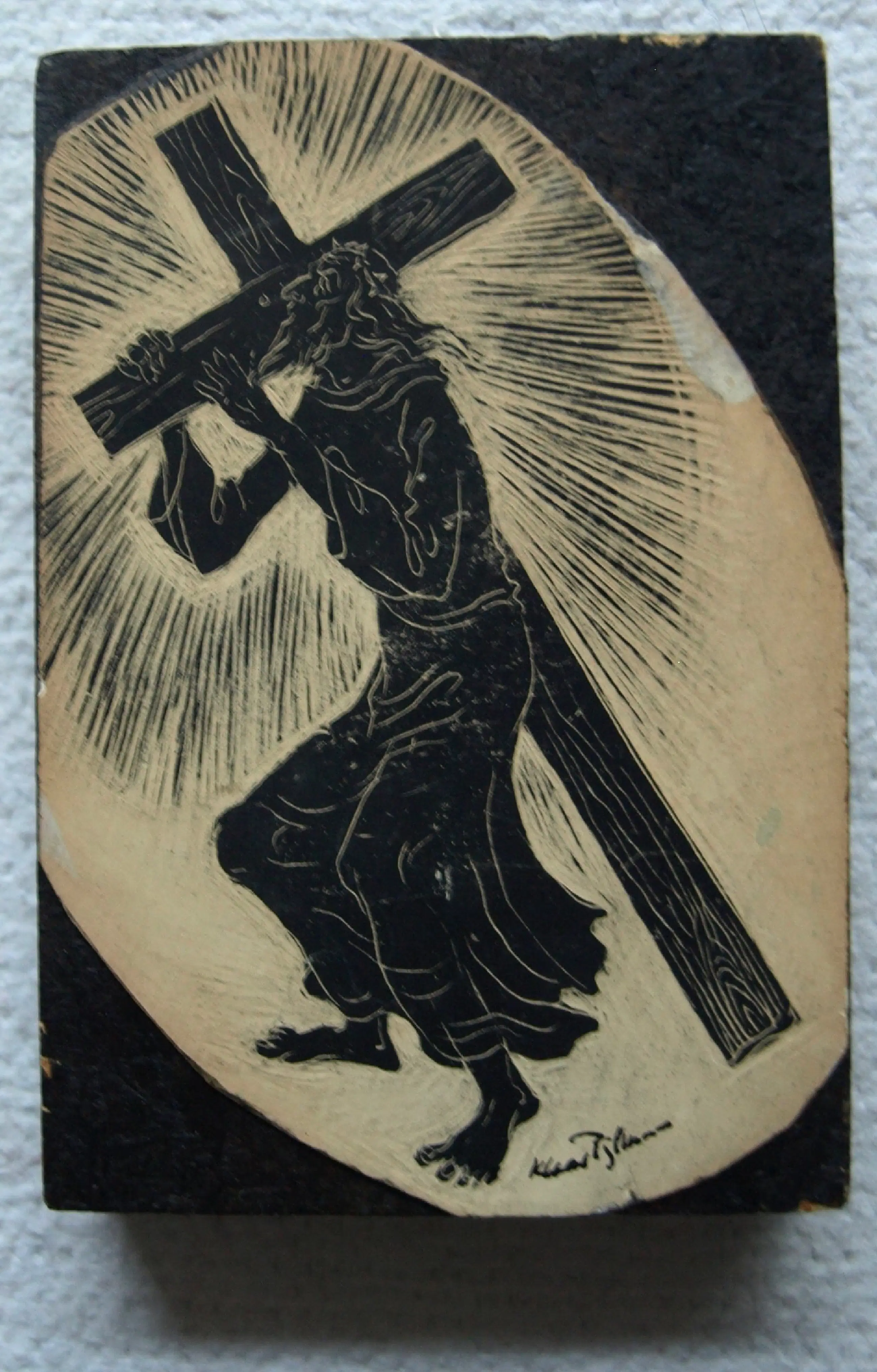 Een klein werkje op linoleum, van de Nederlandse kunstenaar Klaas Pijlman (1917-2007). -Techniek: de afbeelding is gekrast op een met inkt ingerold stukje linoleum, geplakt op een blokje spaanplaat. -Techniek: Olieverf op doek, opgespannen op een houten spieraam. -Gesigneerd rechtsonder. Jaartal onbekend. -Afmetingen van het blokje: 11 x 7½ x 2 cm. -Herkomst: Uit de inboedel van de in 2007 overleden kunstenaar. -Conditie: In goede staat met slijtplekjes. Zie ook de foto’s voor een eigen indruk.