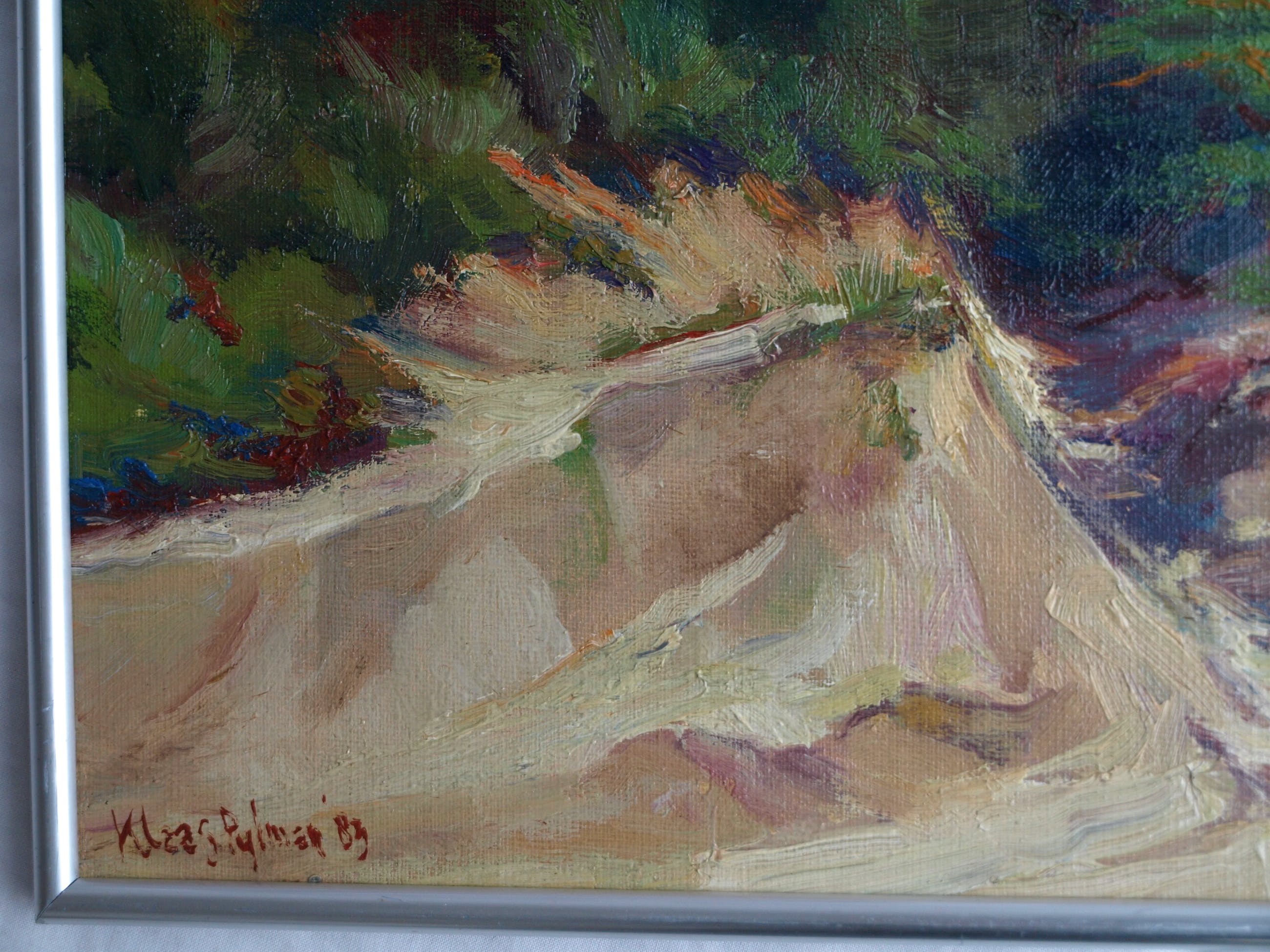 -Gesigneerd linksonder en ingelijst in een eenvoudige zilverkleurige lijst. De titel (‘Droge rivier, Italië) en het jaartal (1983) staan geschreven op de achterkant van het canvasboard.