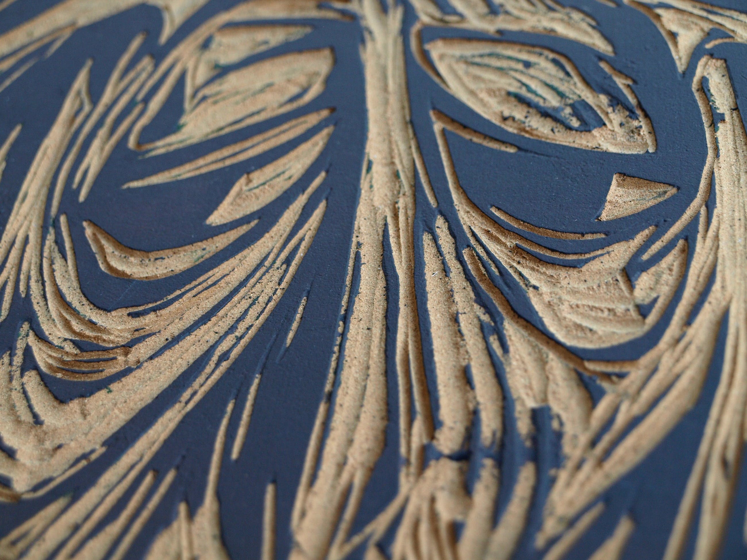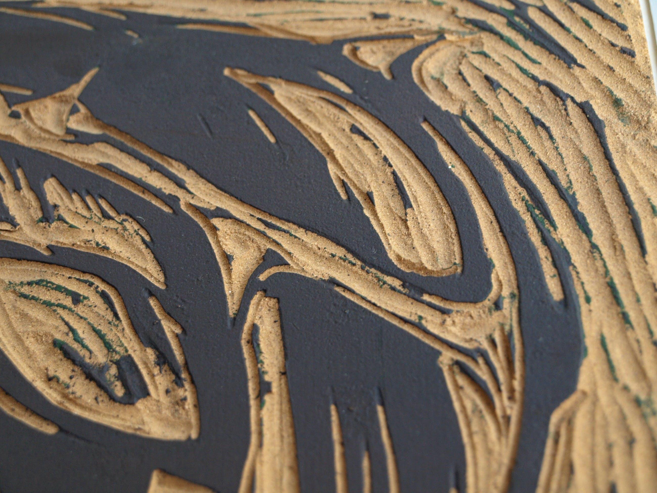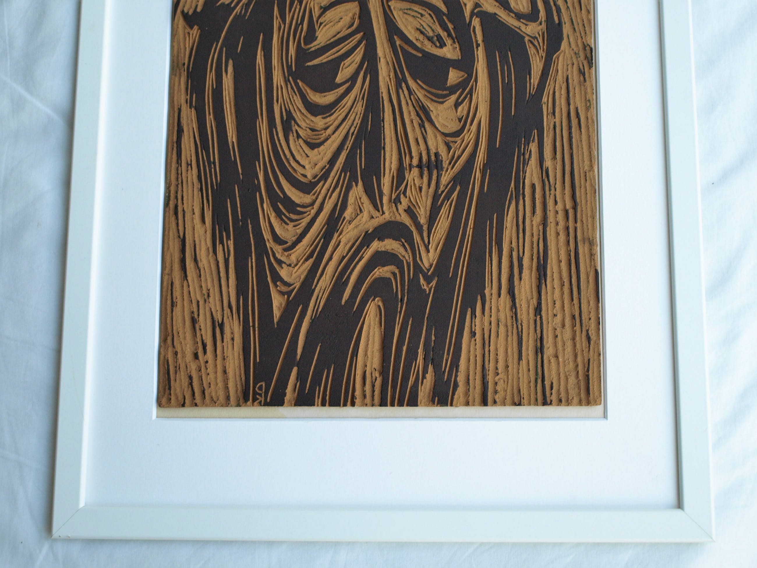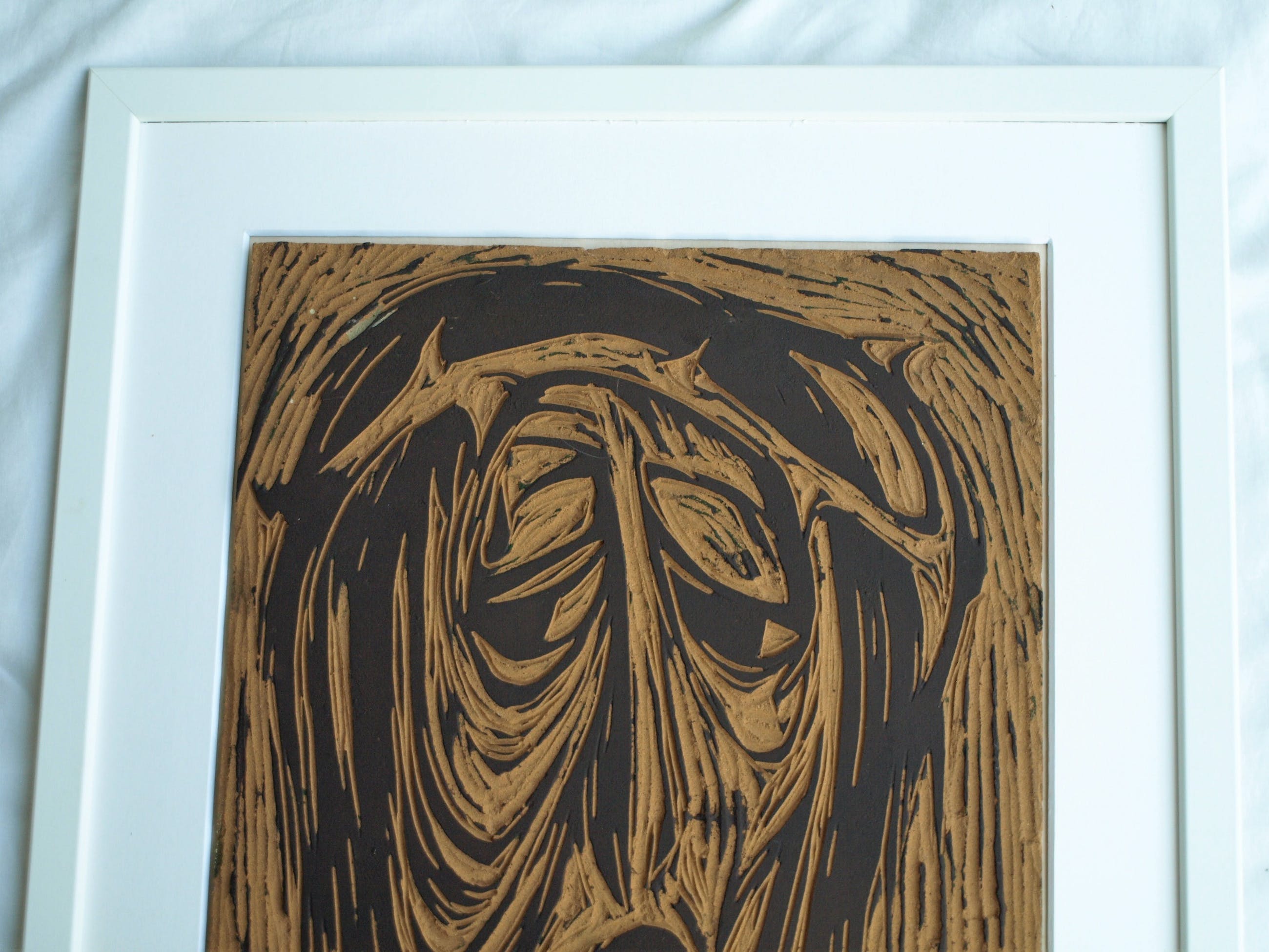 De ingelijste linoplaat kan zo aan de muur.