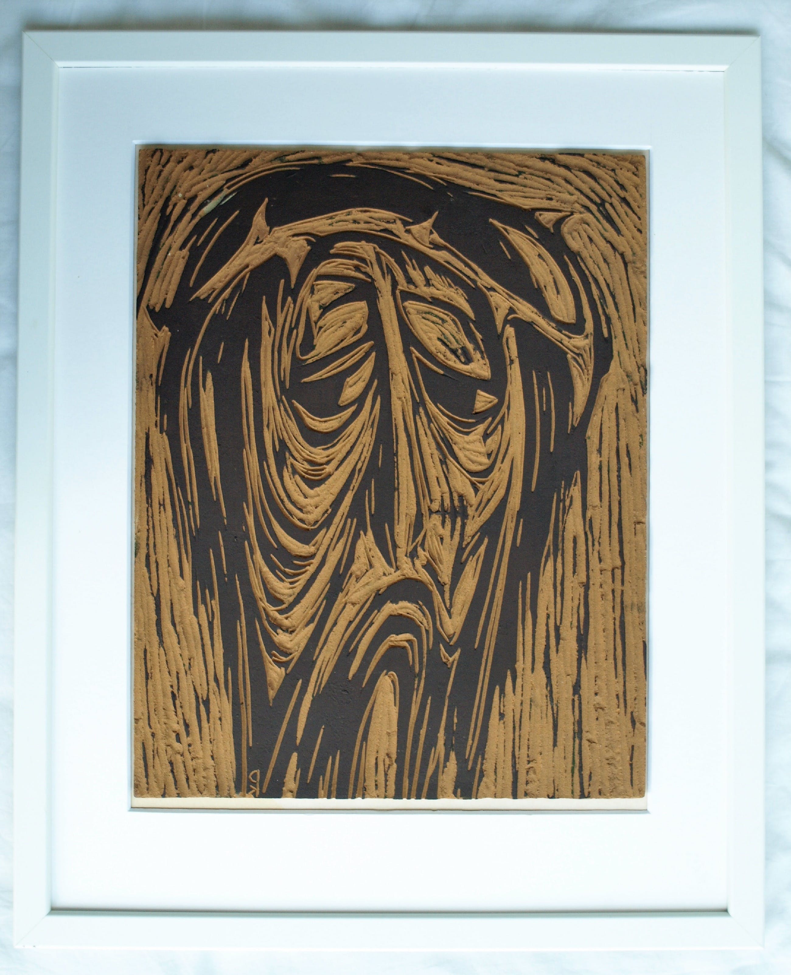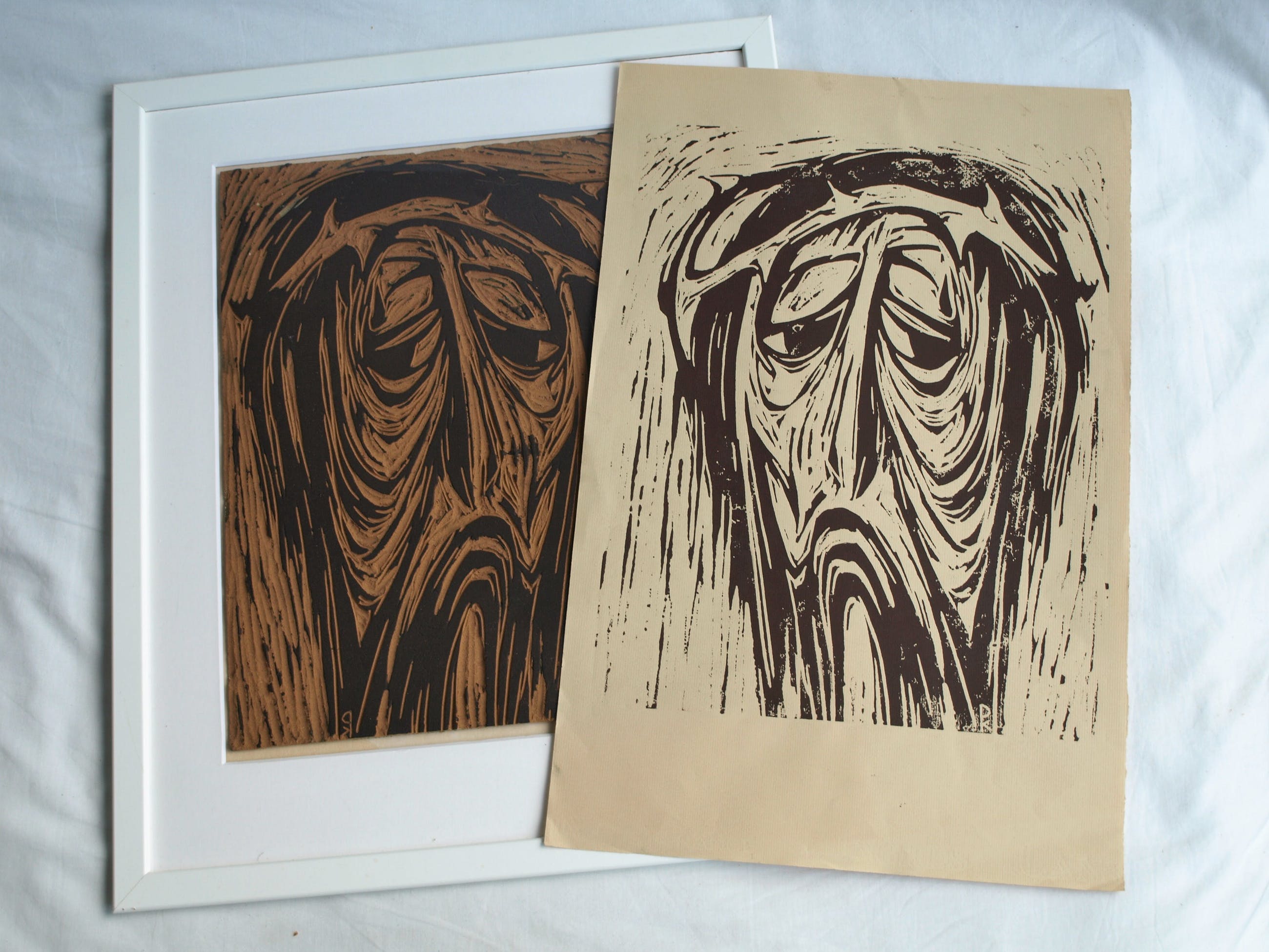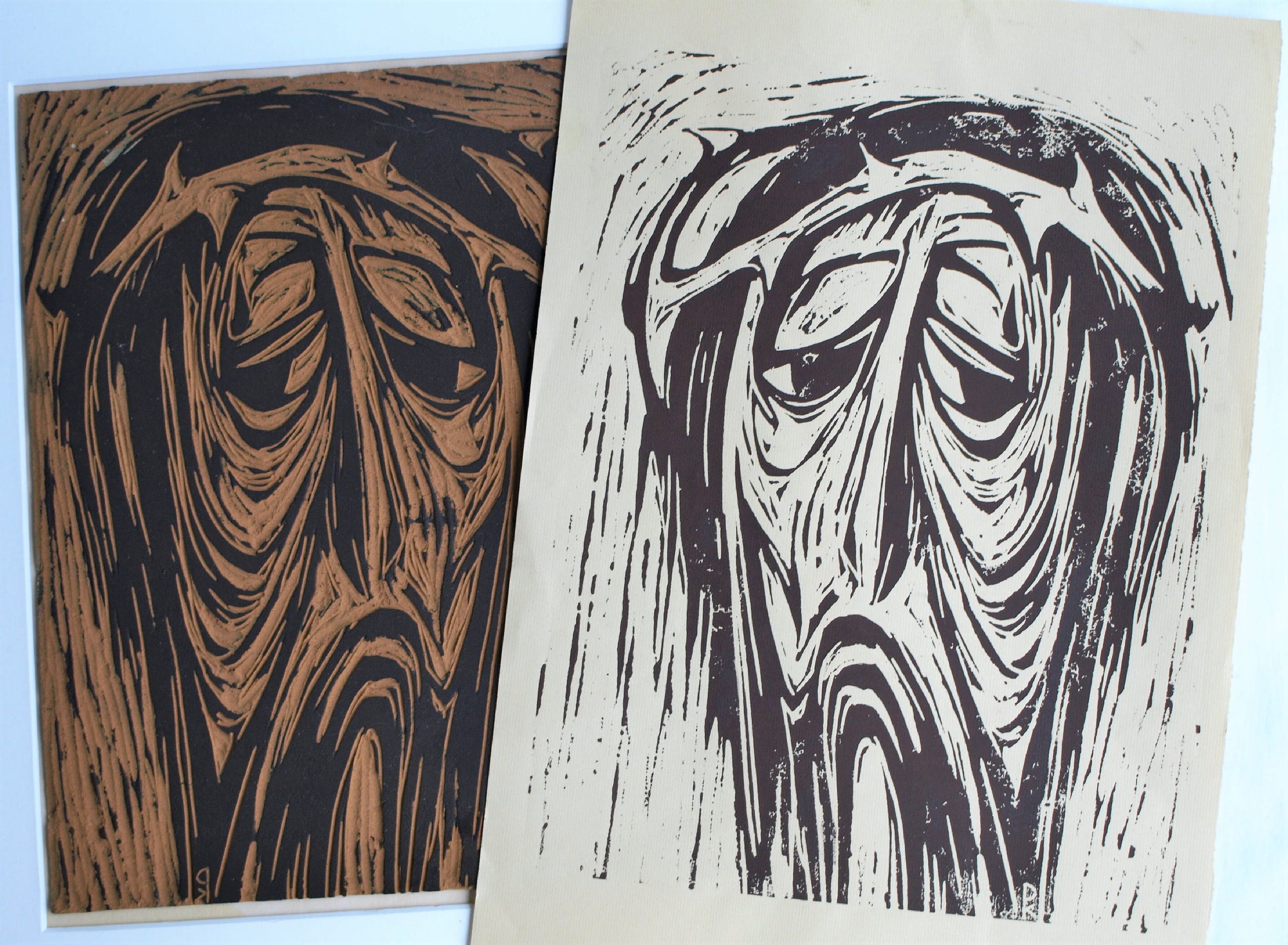 -Met deze linoleumplaat heeft de kunstenaar 30 met potlood genummerde en gesigneerde afdrukken gemaakt in 1965, met als titel “Man van smarten”. De afdrukken zijn vanzelfsprekend een spiegelbeeld van het origineel.