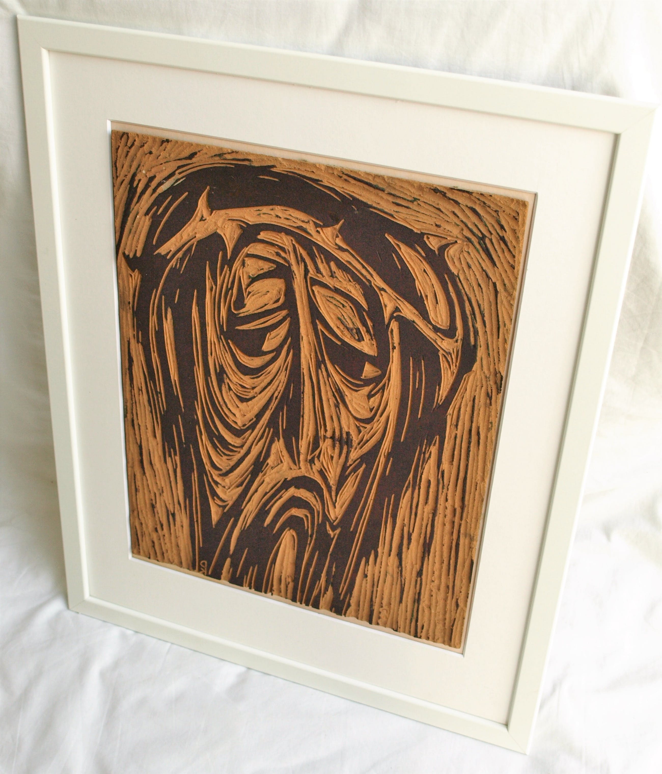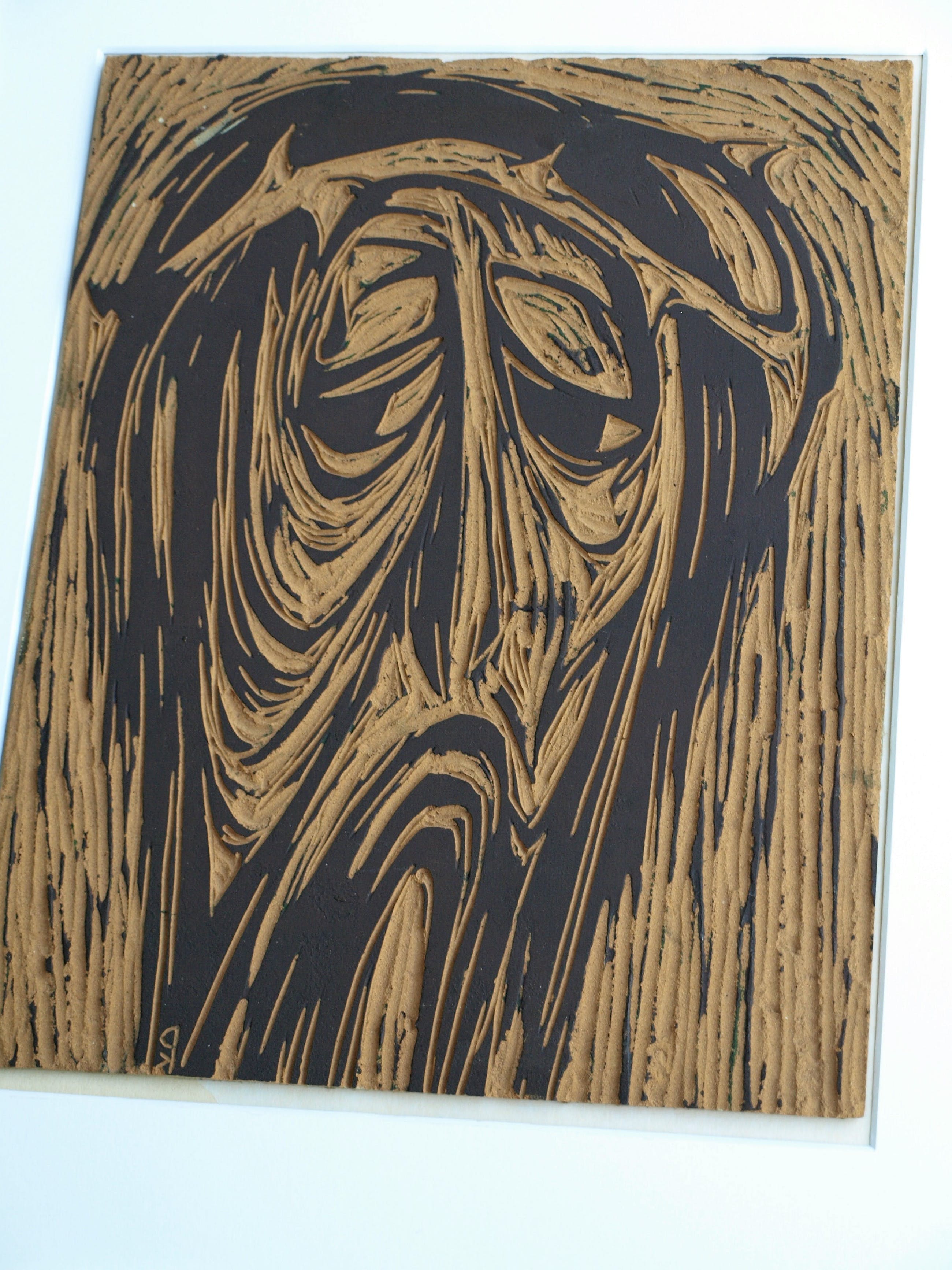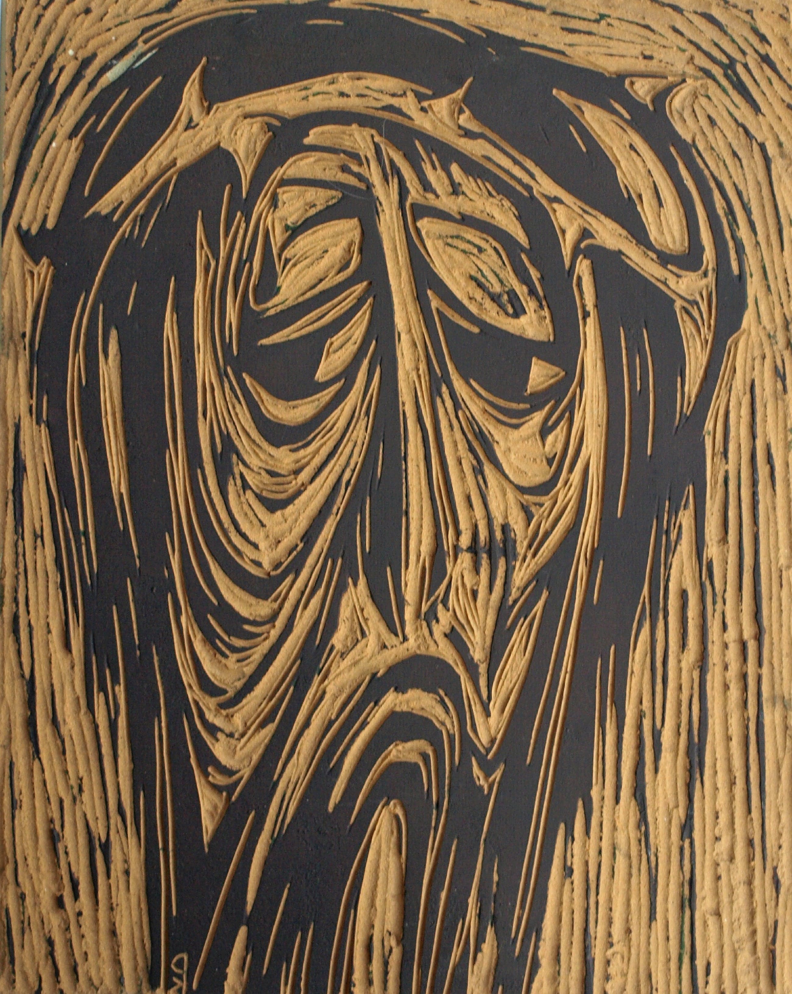 -Met deze linoleumplaat heeft de kunstenaar 30 met potlood genummerde en gesigneerde afdrukken gemaakt in 1965, met als titel “Man van smarten”. De afdrukken zijn vanzelfsprekend een spiegelbeeld van het origineel.