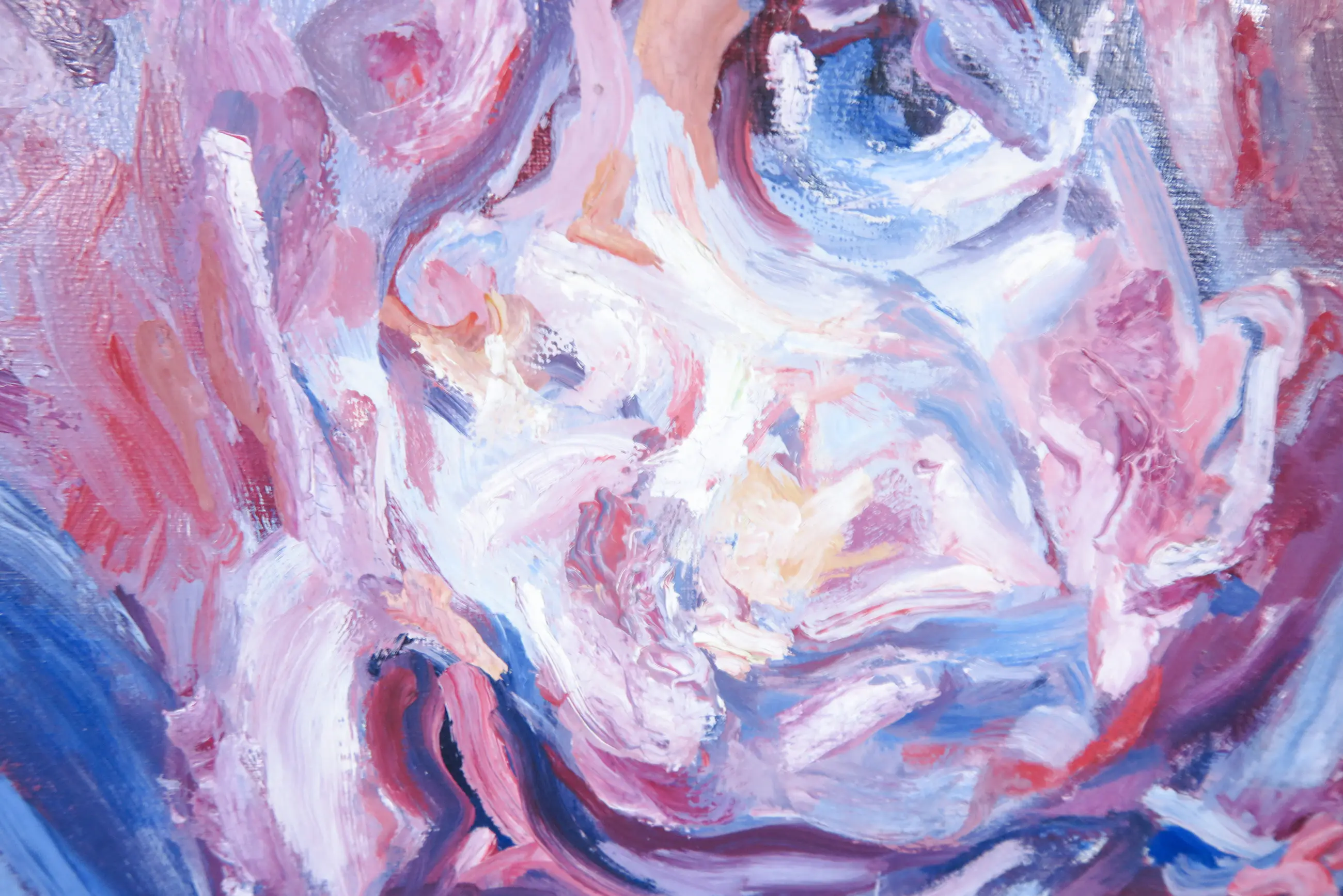 Er zit wat lichte golving in het doek, en er is wat zeer minimale craquelé zichtbaar. (Zie detailfoto's) De lijst zit wat scheef. | |