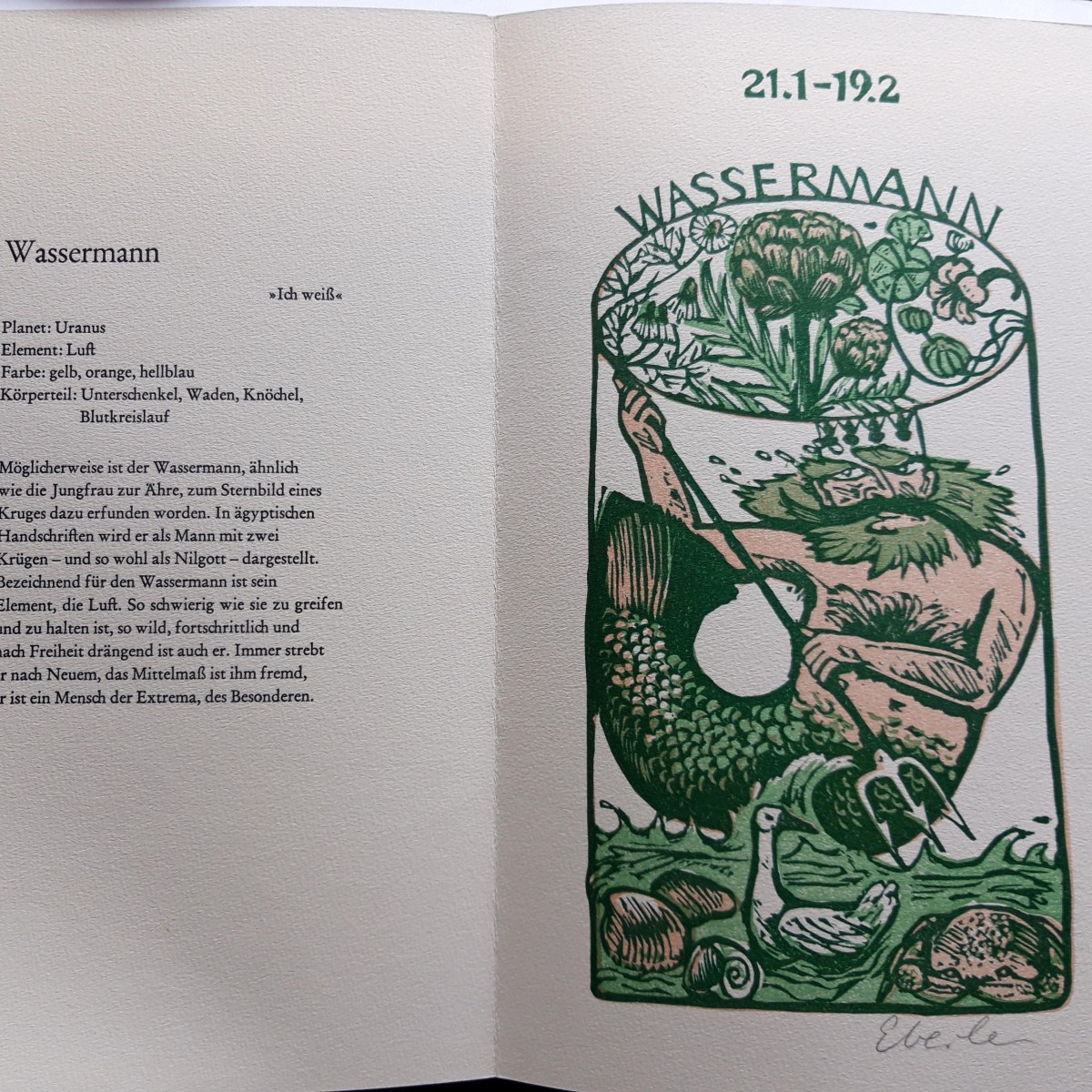 4-SEITEN-GRAFIK-FALTBLATT 36x29 CM (OFFEN). SEITE 1 UNBEDRUCKT. SEITE 2 TEXT 'Wassermann' ZUM LINOL-SCHNITT (1-FARBIG SCHWARZ) AUF SEITE 3. SEITE 3 MIT 3-FARBEN-ORIGINAL-LINOLSCHNITT VON KLAUS EBERLEIN ZU DEM BUCH VON KLAUS MÜNZENMAIER 'HIMMLISCH SPEISEN'. RECHTS UNTEN MIT BLEISTIFT SIGNIERT 'Eberlein'. AUF SEITE 4 MEHRZEILIGE BESCHREIBUNG DES SCHÖNEN BLATTES VON 1992. ERHALTUNGSZUSTAND DES BLATTES: EXCELLENT
