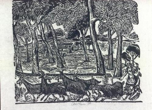 Klaus Eberlein - Landschaft mit Ziegenherde - Holzschnitt - 1970