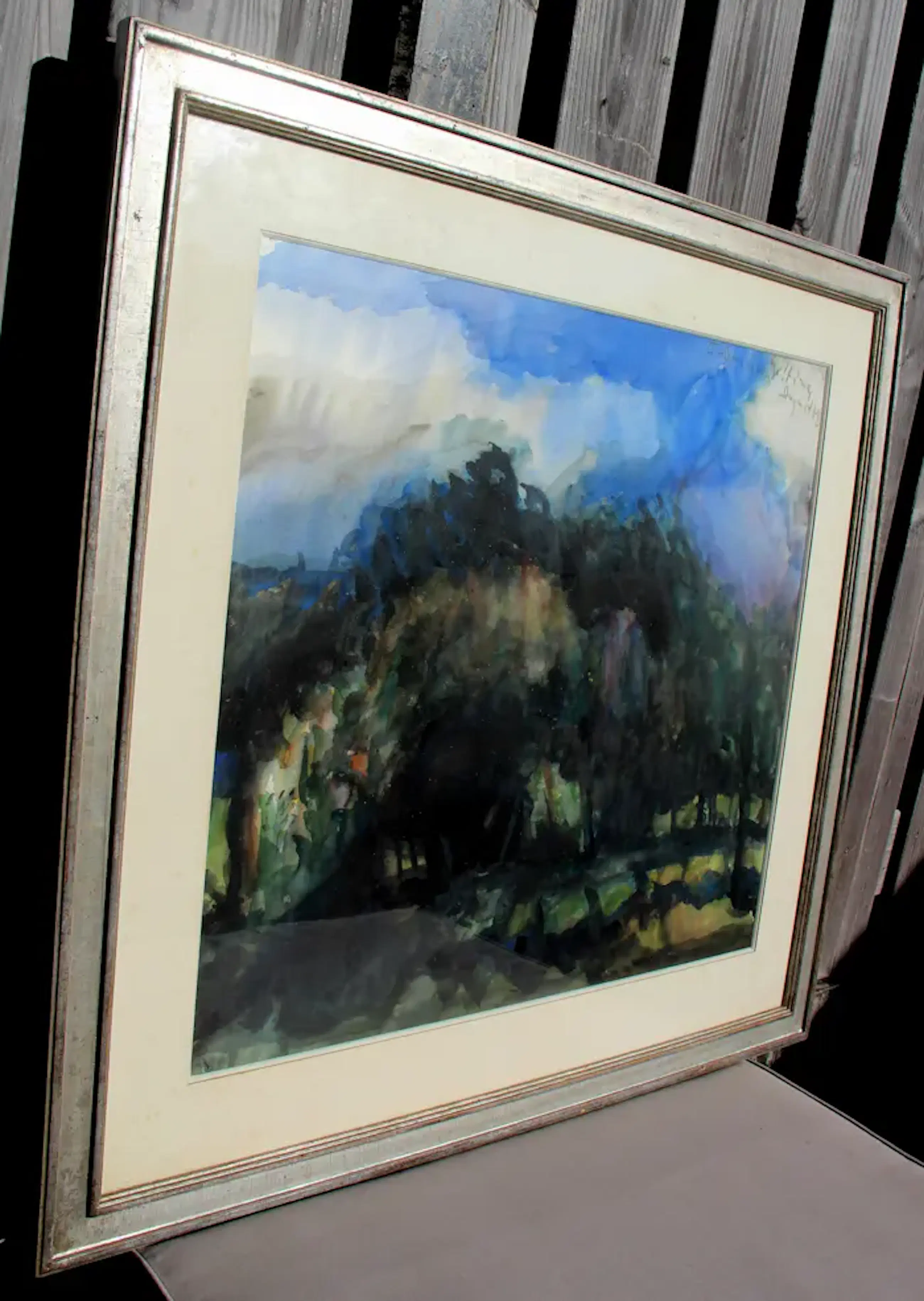 Ingelijste aquarel van Klaus Fussmann. Jaar: 1978. Titel: Landschap. Afmetingen incl lijst: H89.5 x b89cm. Afmetingen voorstelling: H67 x b71cm. Het werk is rechts bovenaan, gesigneerd door de kunstenaar. De authenticiteit van het aangeboden werk wordt volledig gegarandeerd. Een certificaat van echtheid kan, op aanvraag, worden gemaild.