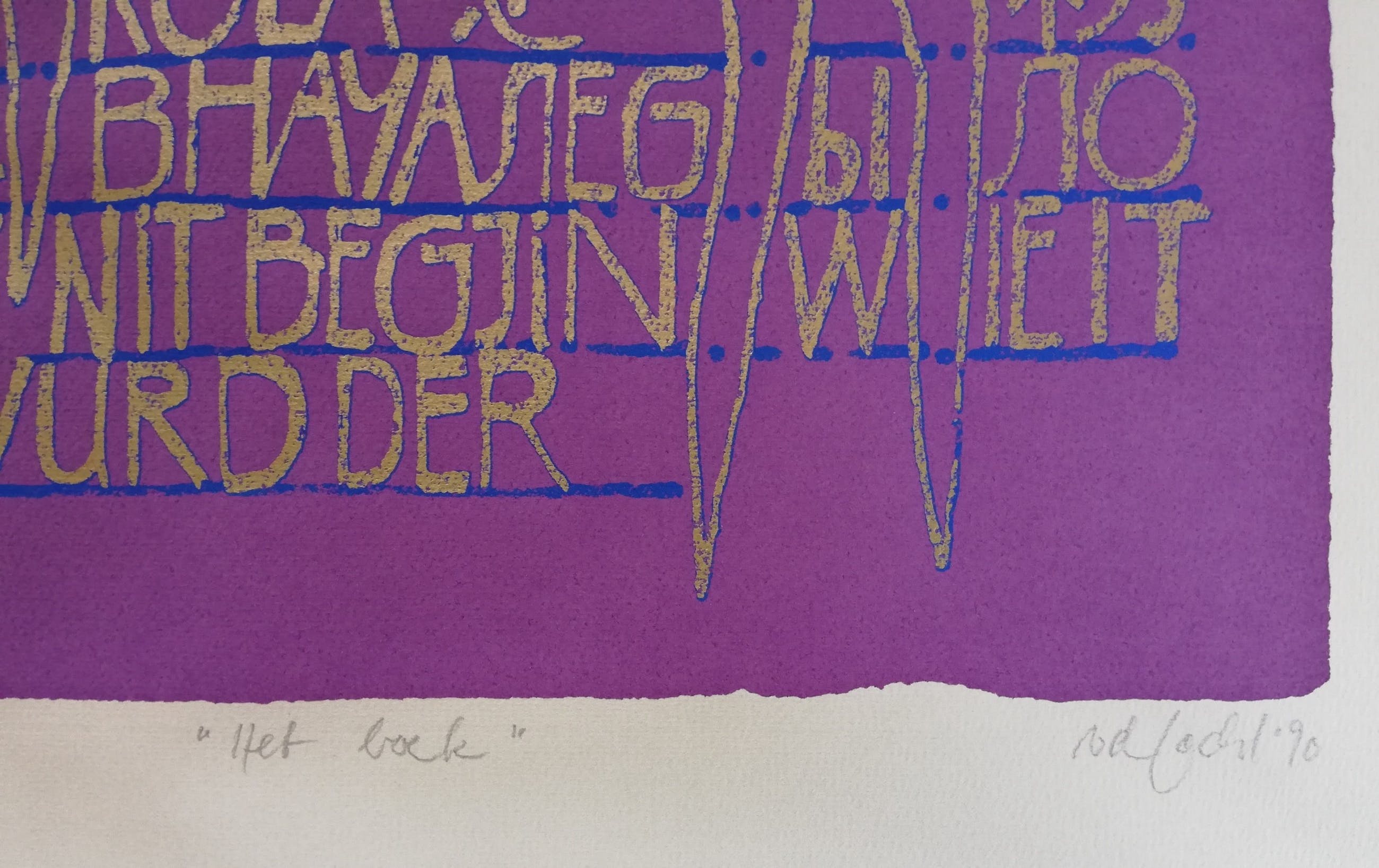 In het kader van de Boekenweek 1990 heeft boekhandel Dekker van der Vegt aan Klaus van der Locht - een bijna dagelijkse bezoeker van de boekhandel - verzocht een kunstuiting op het thema Boek te maken. Bijgaande litho is nr 21 van 25; handgesigneerd door van der Locht.
