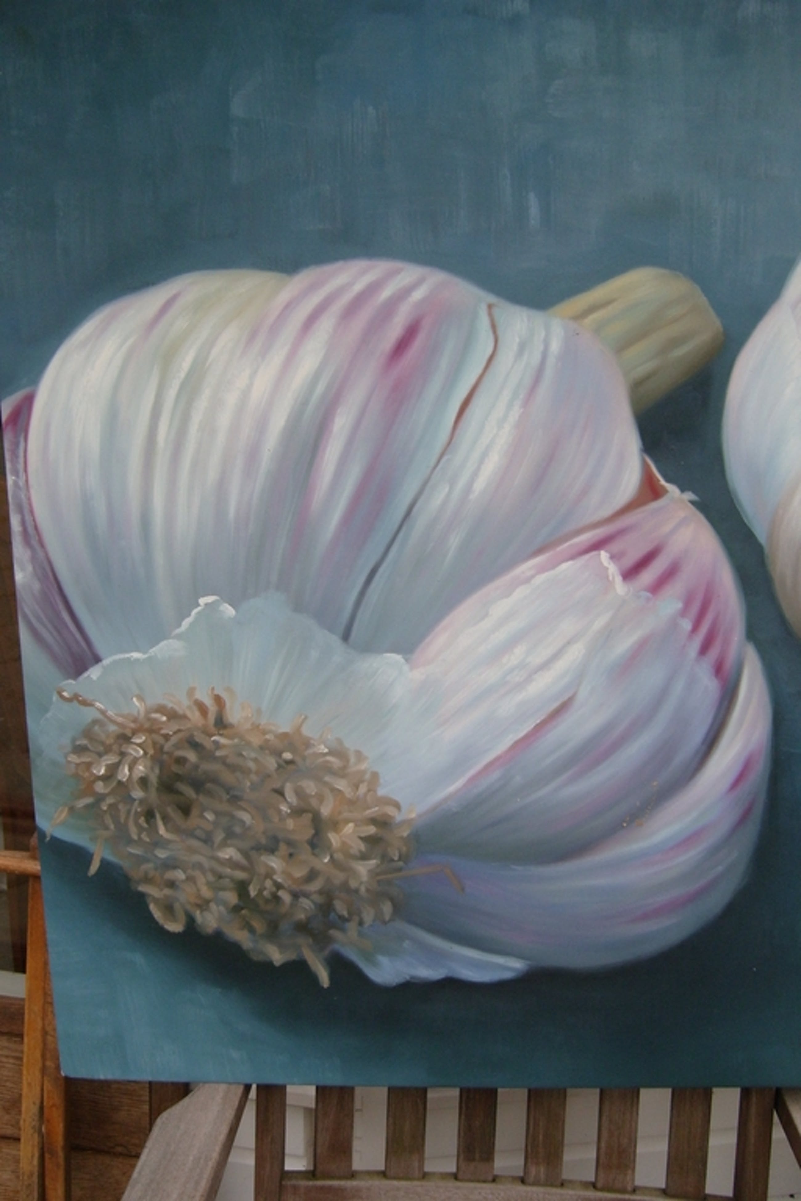 Knoflook, olieverf op linnen, kleuren, blauw/groen- oud rose/rood - wit/geel